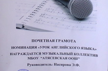 Награждается музыкальный коллектив МБОУ "Атясевская ООШ" . Почетная грамота в номинации "Урок английского языка". Руководитель: Насирова Э.Ф.