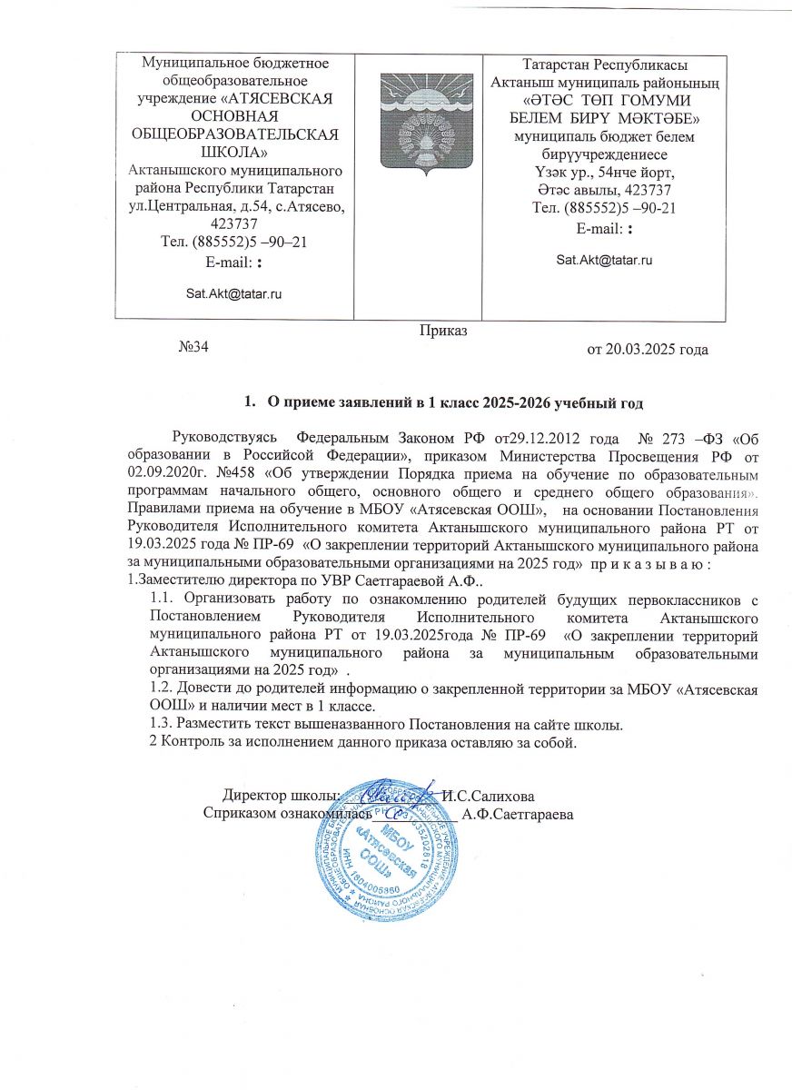 Положение о приеме в школу МБОУ "Атясевская ООШ"