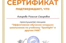 Инглиз һәм немец теле укытучысы - Р.С.Әмирова, лекция тыңлаган өчен, сертификат белән бүләкләнде./Учитель английского и немецкого языка Р.С.Амирова за прослушивание лекции по теме “Эффетивное обучение младших школьников по учебнику “Spotlight” и другим УМК” награждена сертификатом.
