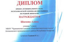 Татар әдәбияты фәненнән 7 нче сыйныф укучысы Шаехова Алинәне призер булуы белән котлыйбыз! Укытучысы Салахов Р.З.