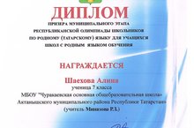 Туган тел фәненнән Республика олимпиадасының муниципаль этабында мәктәбебезнең 7 сыйныф укучысы Шаехова Алинә призер булды. Укытучысы Миназова Р.З. Котлыйбыз!