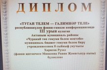 "Туган телем - галимнәр теле" республикакүләм фәнни-гамәли конференциясендә 8 нче сыйныф укучысы Харисов Рүзәл 3 урын яулады. Укытучысы Миназова Р.Җ.