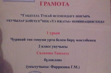 22 апрель көнне 1-4 сыйныф укучылары арасында бөек татар шагыйре Габдулла Тукай иҗатына багышланган шигырь укучылар бәйгесе узды. Безнең мәктәптән Салахова Таңсылу катнашып, 1 урынга ия булды.