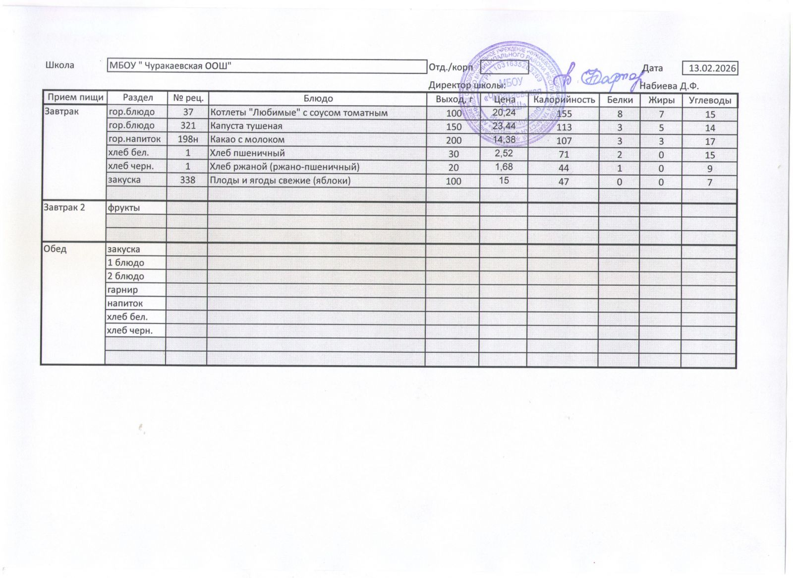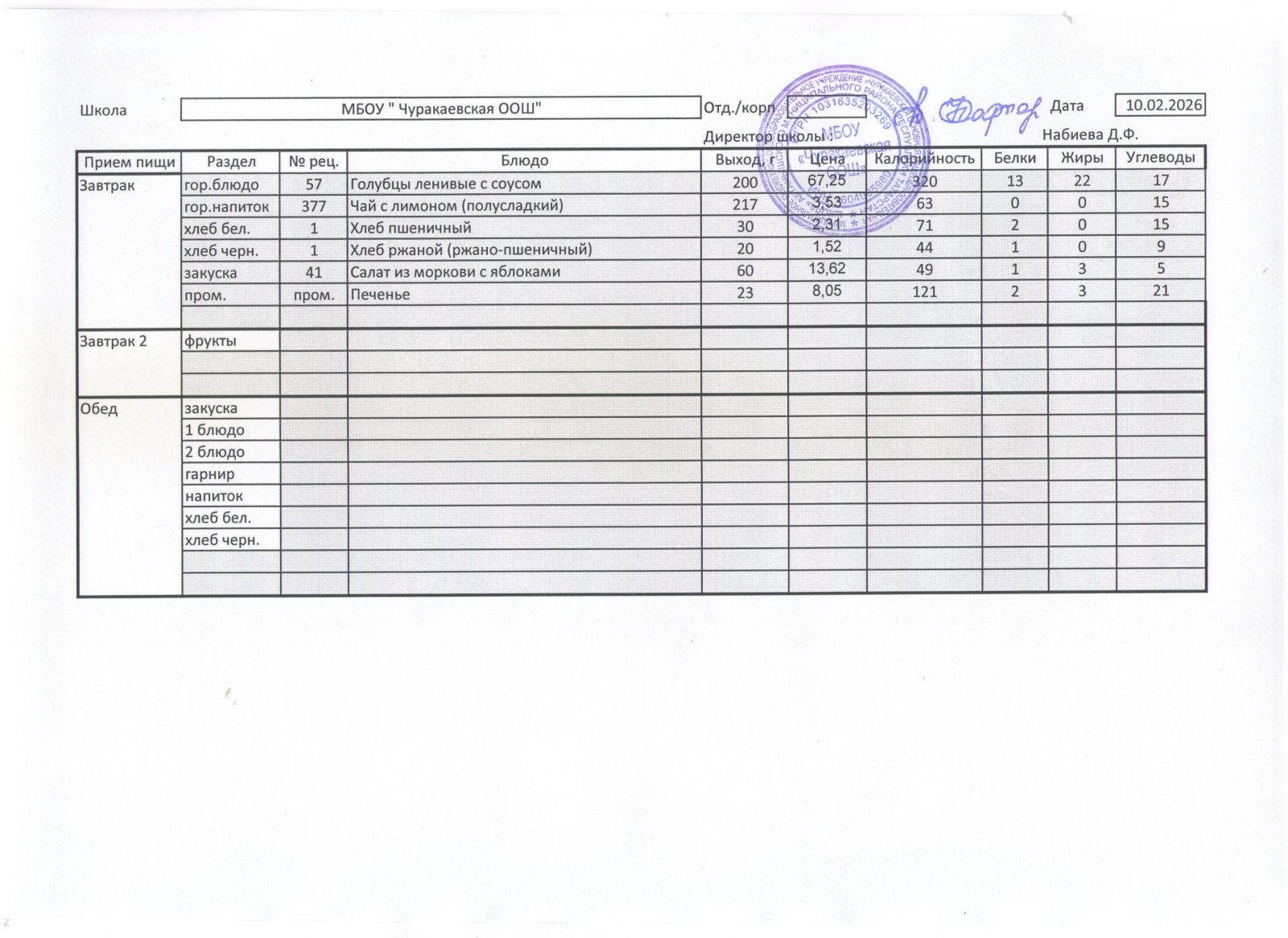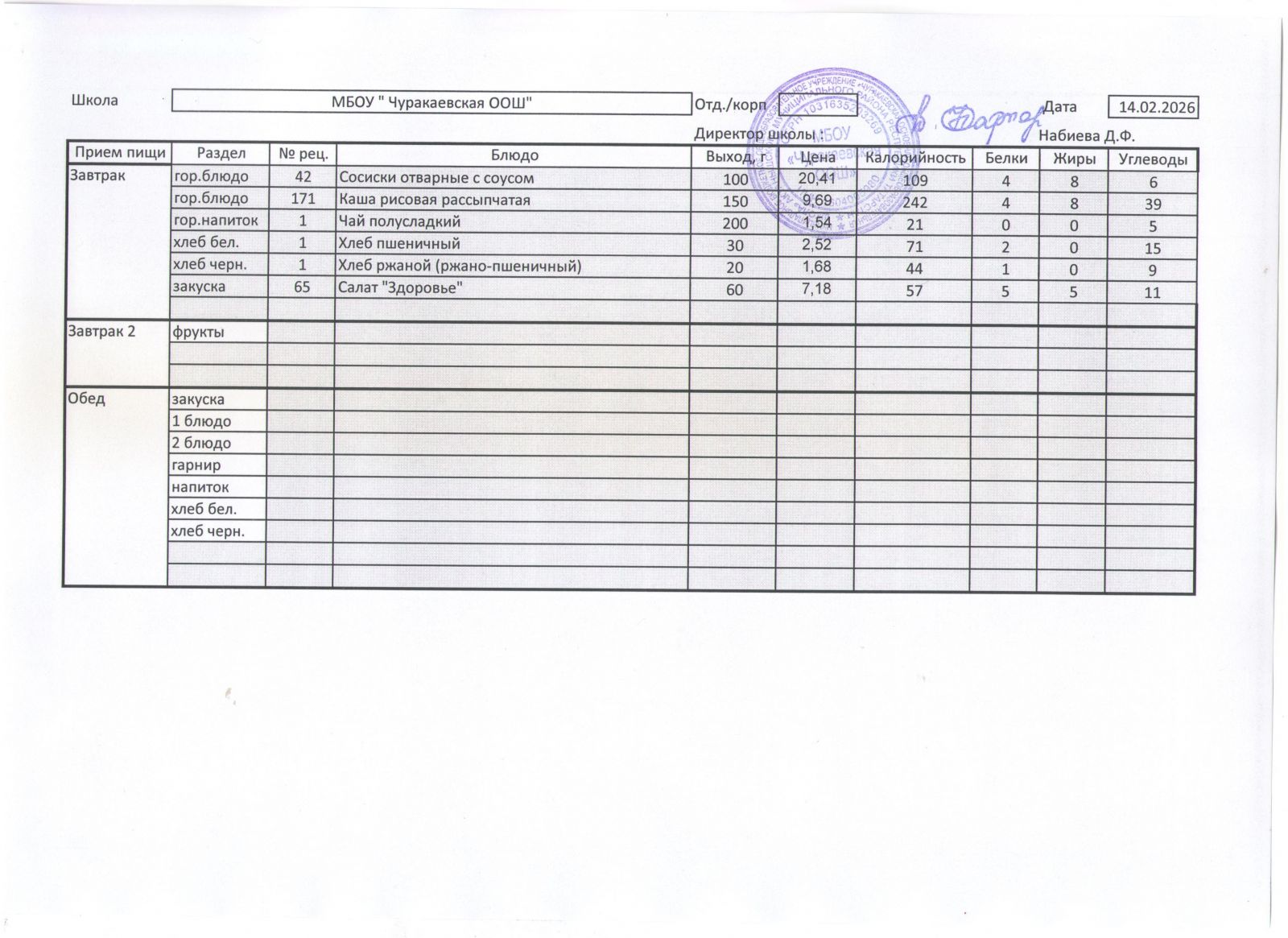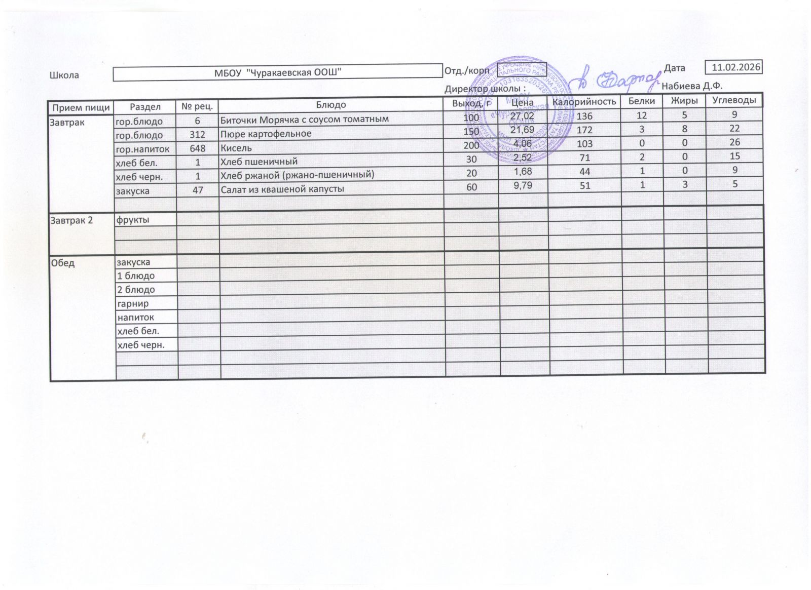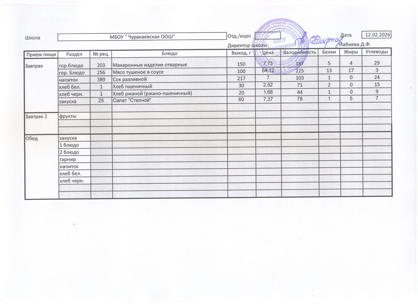 Однодневное меню