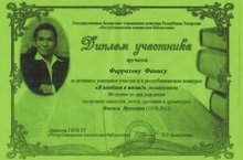 Ученик 9 класса нашей школы Фаррахов Фанис был награжден дипломом за активное успешное участие в республиканском конкурсе "Я влюблен в жизнь!", посвященном 80-летию со дня рождения татарского писателя, поэта, прозаика и драматурга Фаниса Яруллина. От всей души поздравляем с этой победой! Удачи в остальных конкурсах!