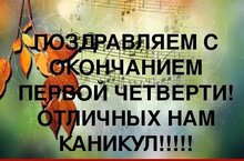 Дорогие ребята, уважаемые родители!!! Поздравляем вас с окончанием первой четверти и началом осенних каникул! Напоминаем, что каникулы начинаются 27 октября и заканчиваются 6 ноября. Ждём вас в школе 7 ноября (пятница). Желаем хорошо отдохнуть и набраться сил на следующую четверть!