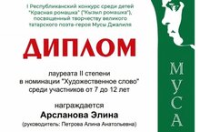Поздравляем учащуюся третьего класса Арсланову Элину, ставшую лауреатом II степени в номинации "Художественное слово" I Республиканского конкурса среди детей "Красная Ромашка" посвященного творчеству великого татарского поэта-героя Мусы Джалиля. Желаем и в дальнейшем творческих успехов и в учёбе!