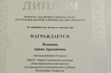Из нашей школы ученица 9 класса Исанаева Арина стала призёром на олимпиаде по марийскому языку и литературе. Поздравляем! -