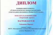 Ученица 3 класса Гайнанова Марьям участвовала в муниципальном конкурсе «Лучшая проектно-исследовательская работа среди младших школьников «Первые шаги в науку» и стала победителем в номинации «Творческий проект». Руководитель: Маликова А.Х.