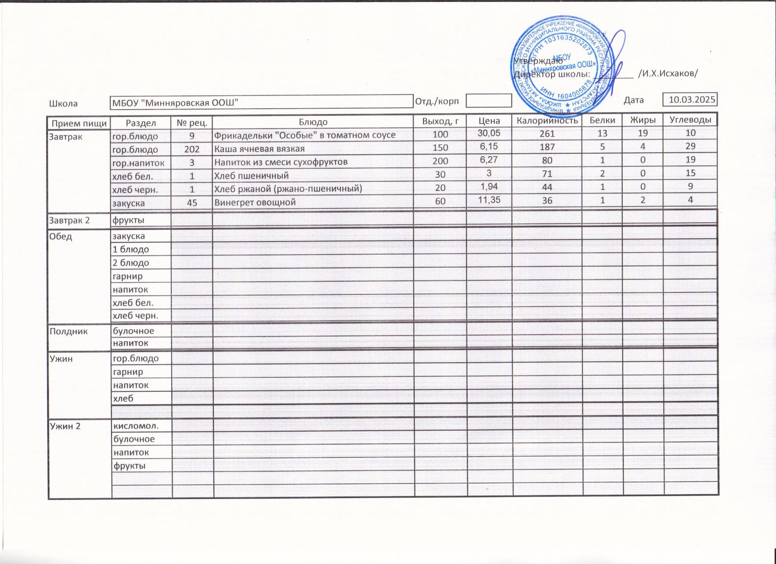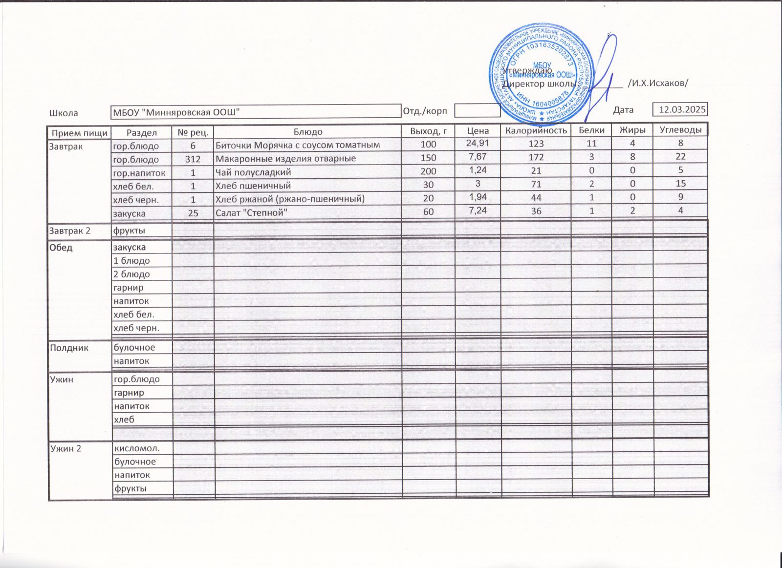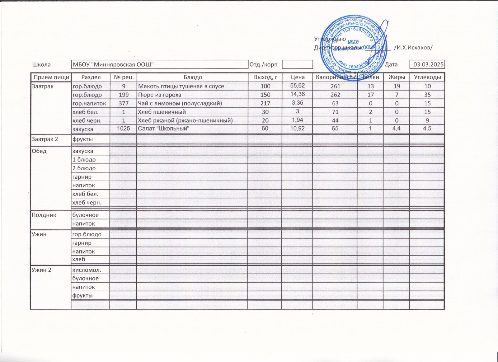 Меню МБОУ "Минняровская ООШ" на 09.03.2021, на 10.03.2023, на 11.03.2021, на 12.03.2021, на 13.03.2021 г.