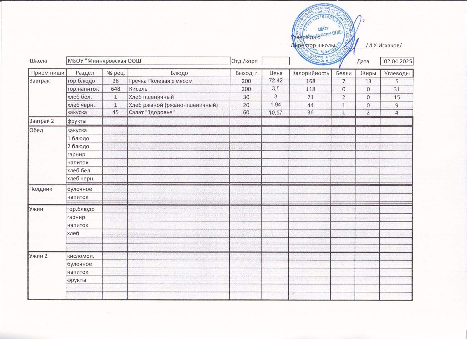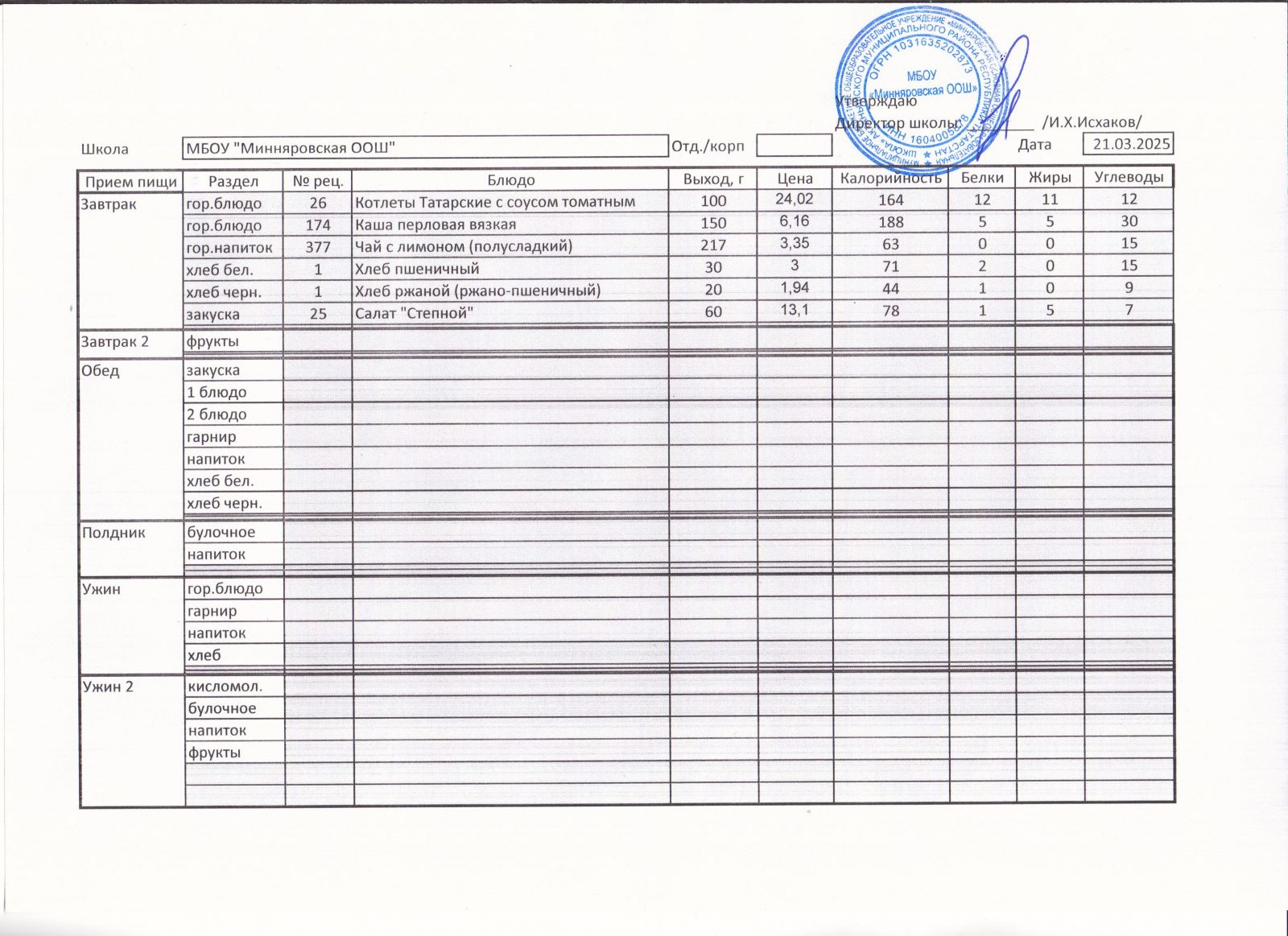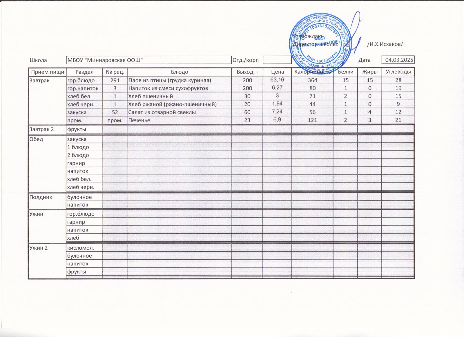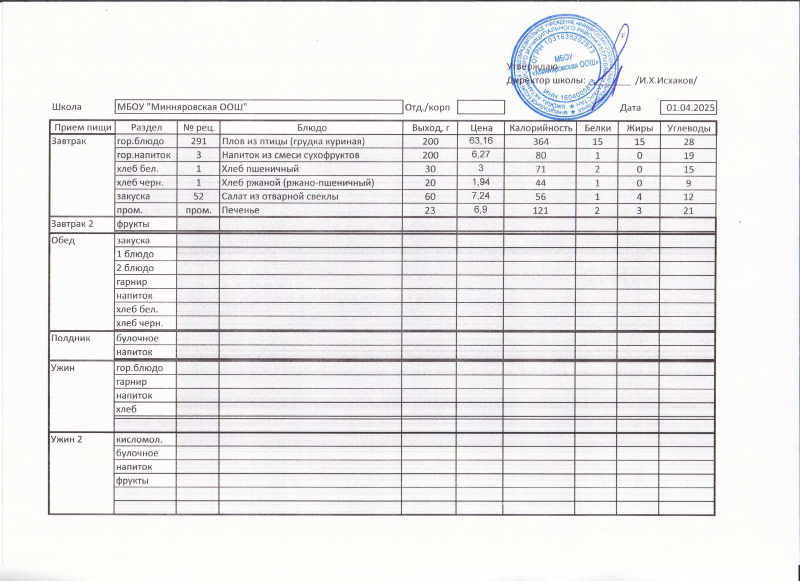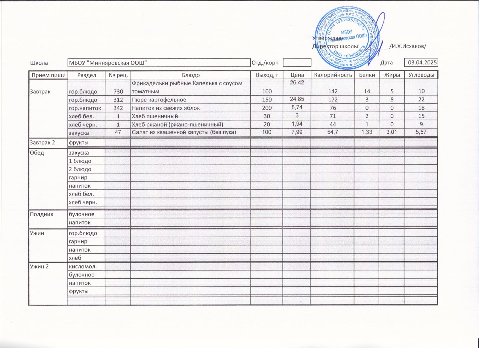 Меню МБОУ "Минняровская ООШ" на 31.03, на 01.04, на 02.04, на 03.04.2021г.