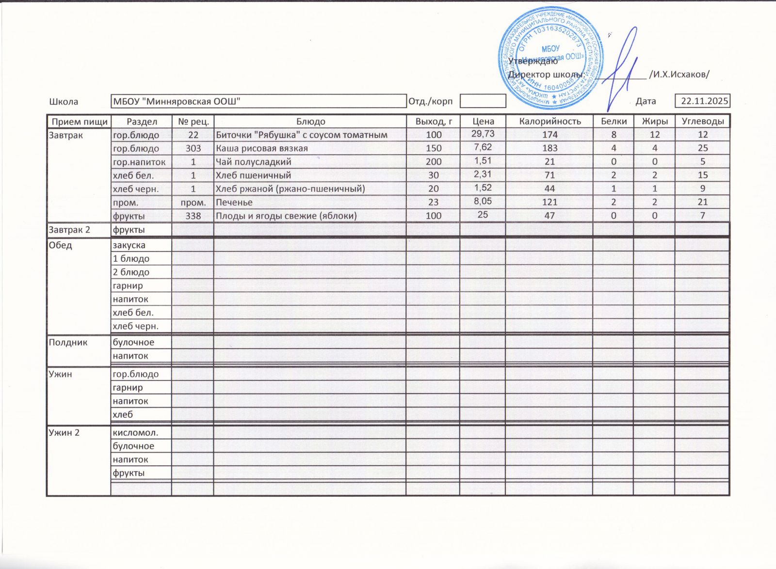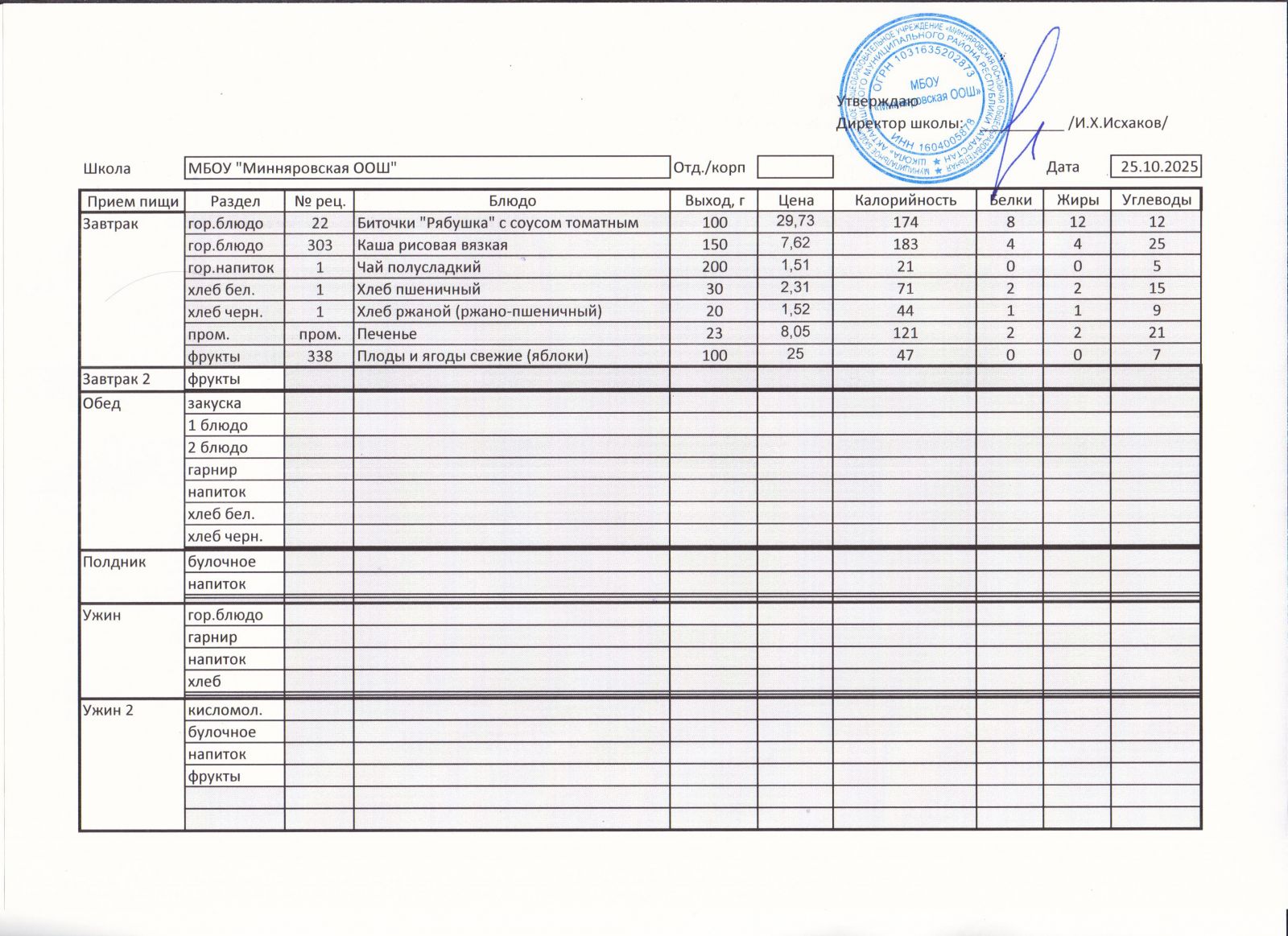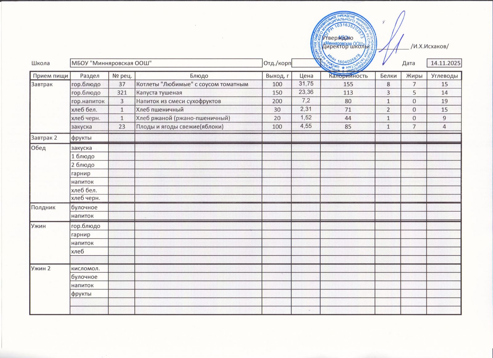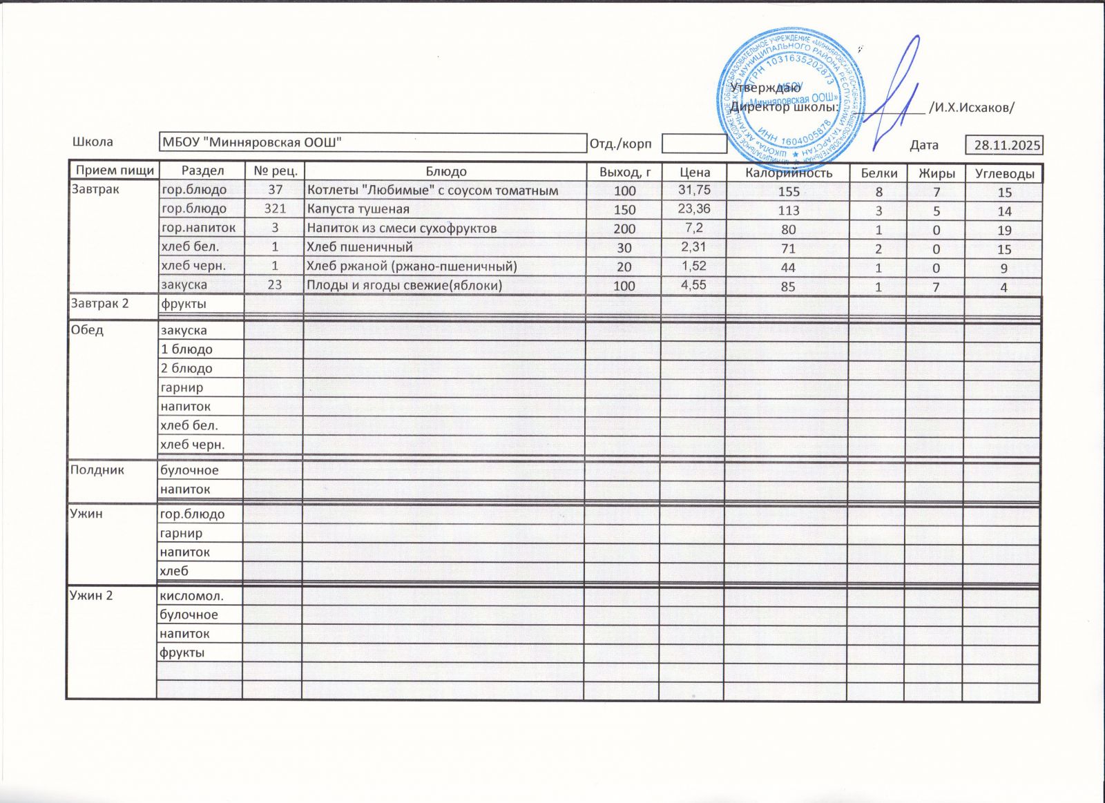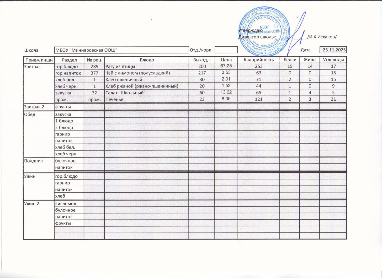 Меню МБОУ "Минняровская ООШ" на 25.11.2002г.