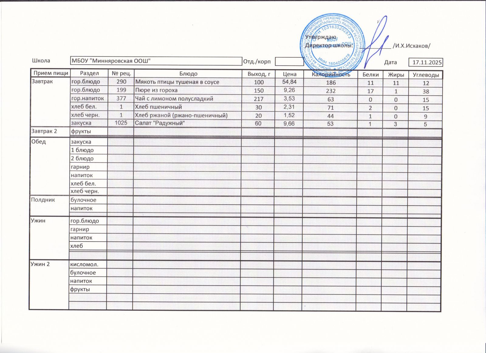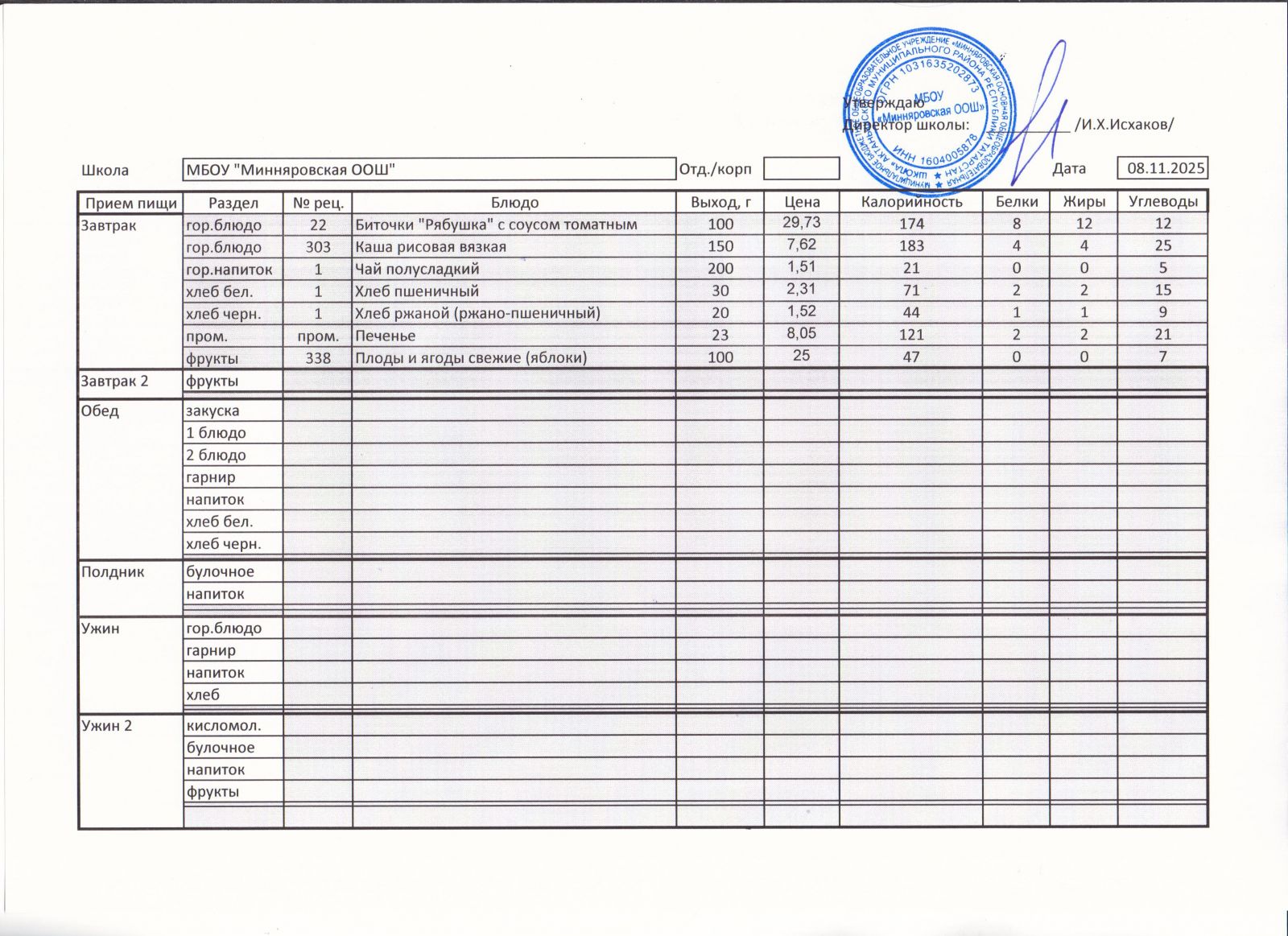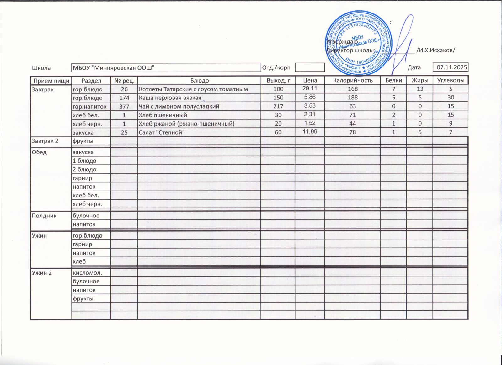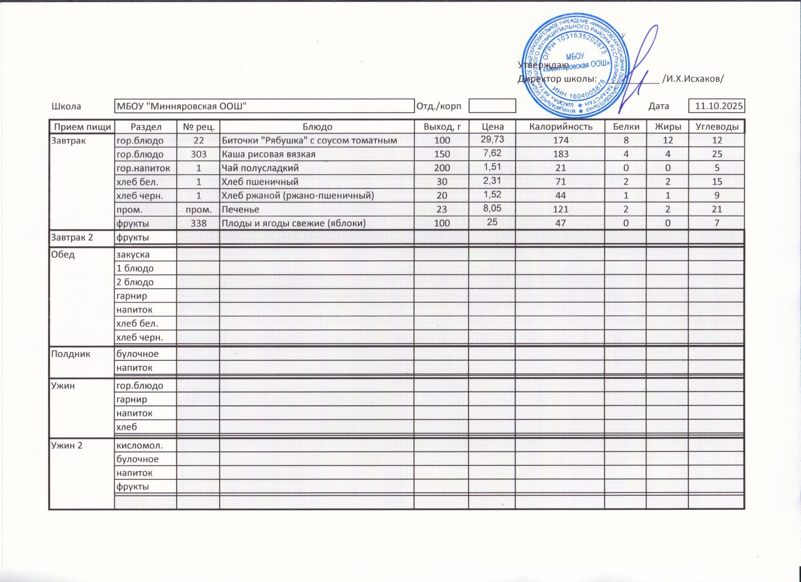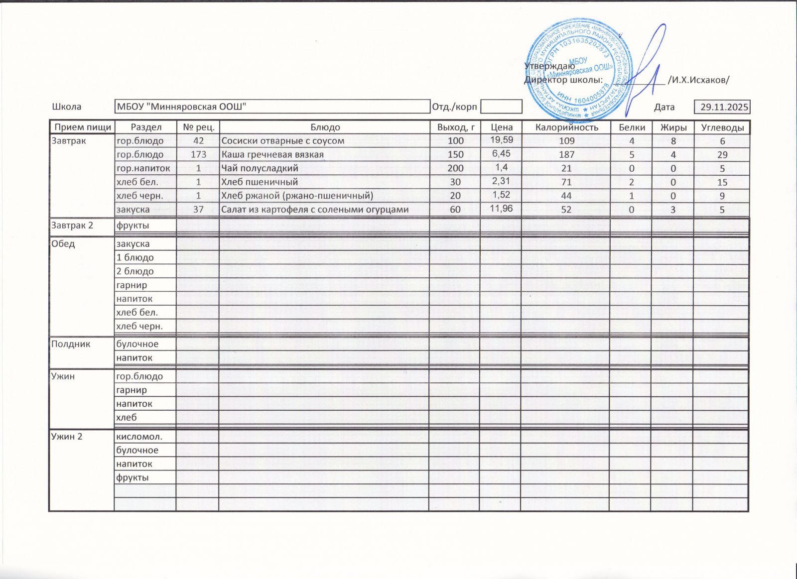 Меню МБОУ "Минняровская ООШ" на 25.11.2002г.