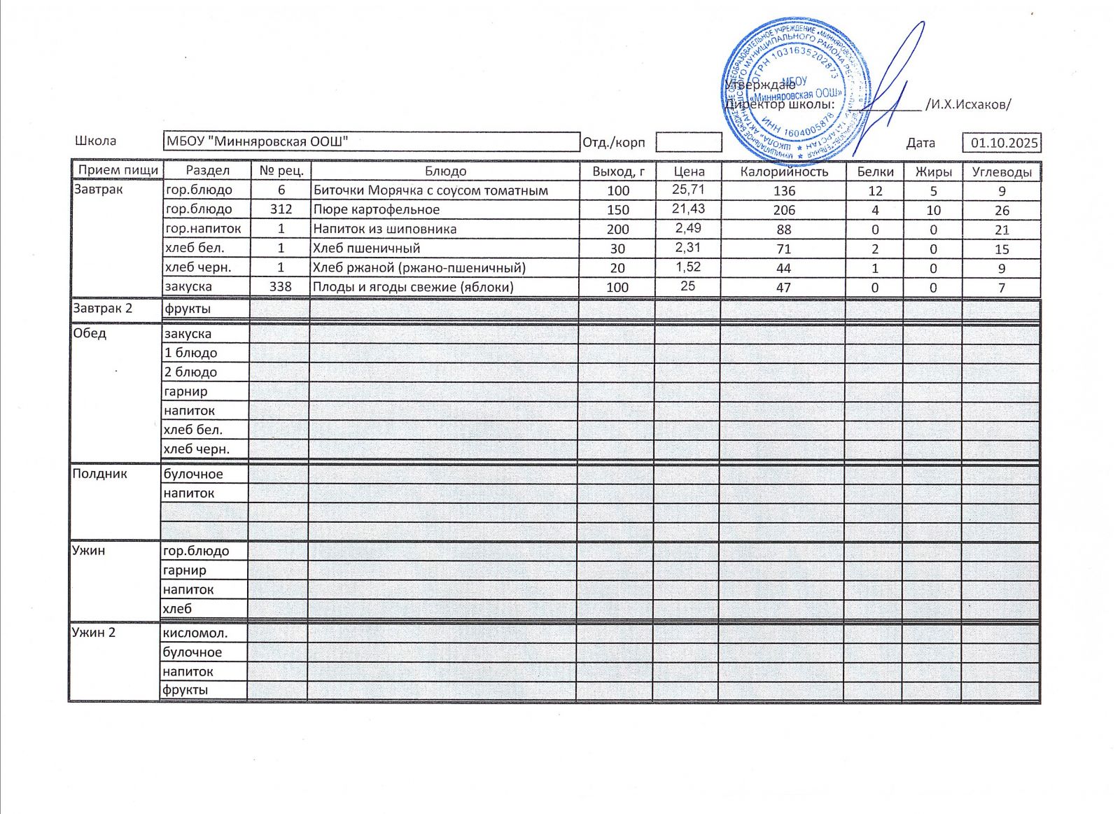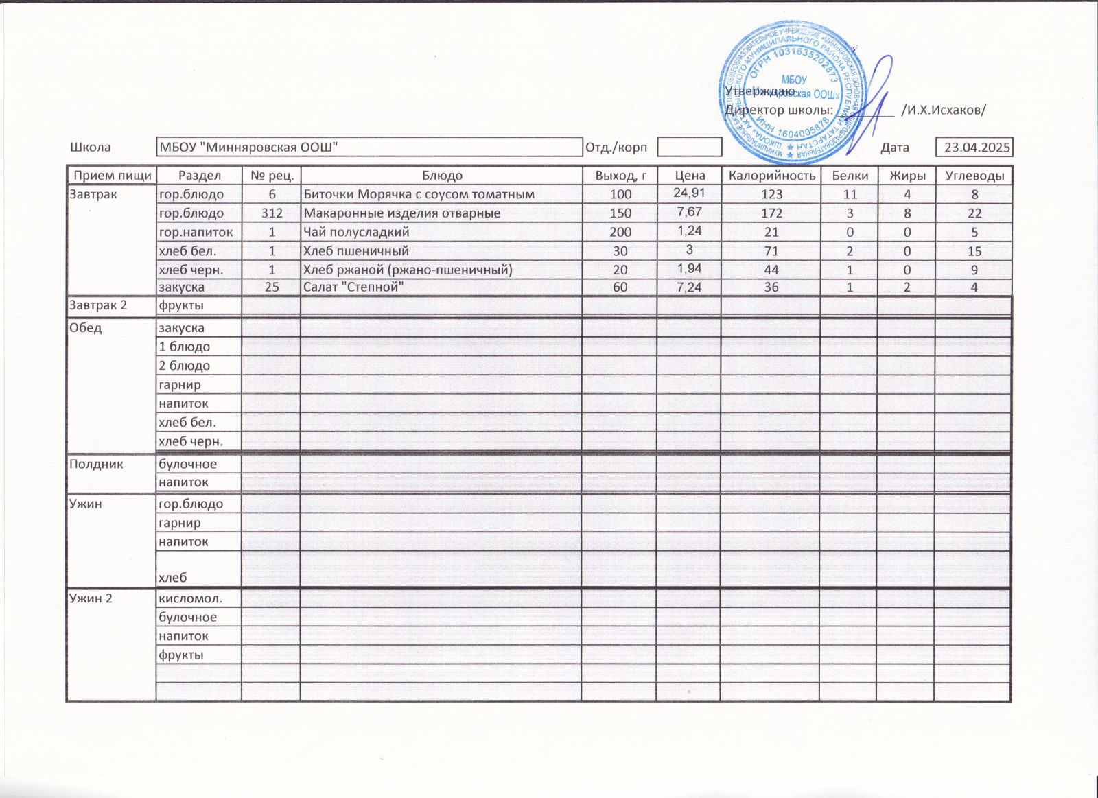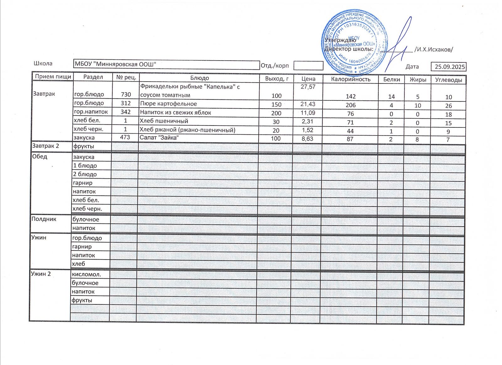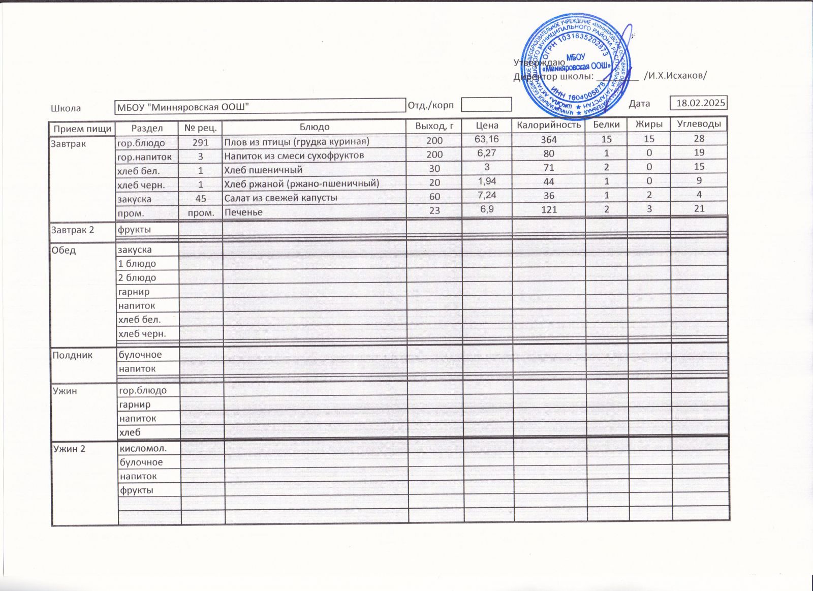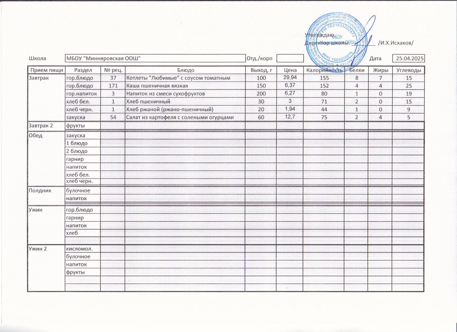 Меню МБОУ "Минняровская ООШ" на 25.11.2002г.