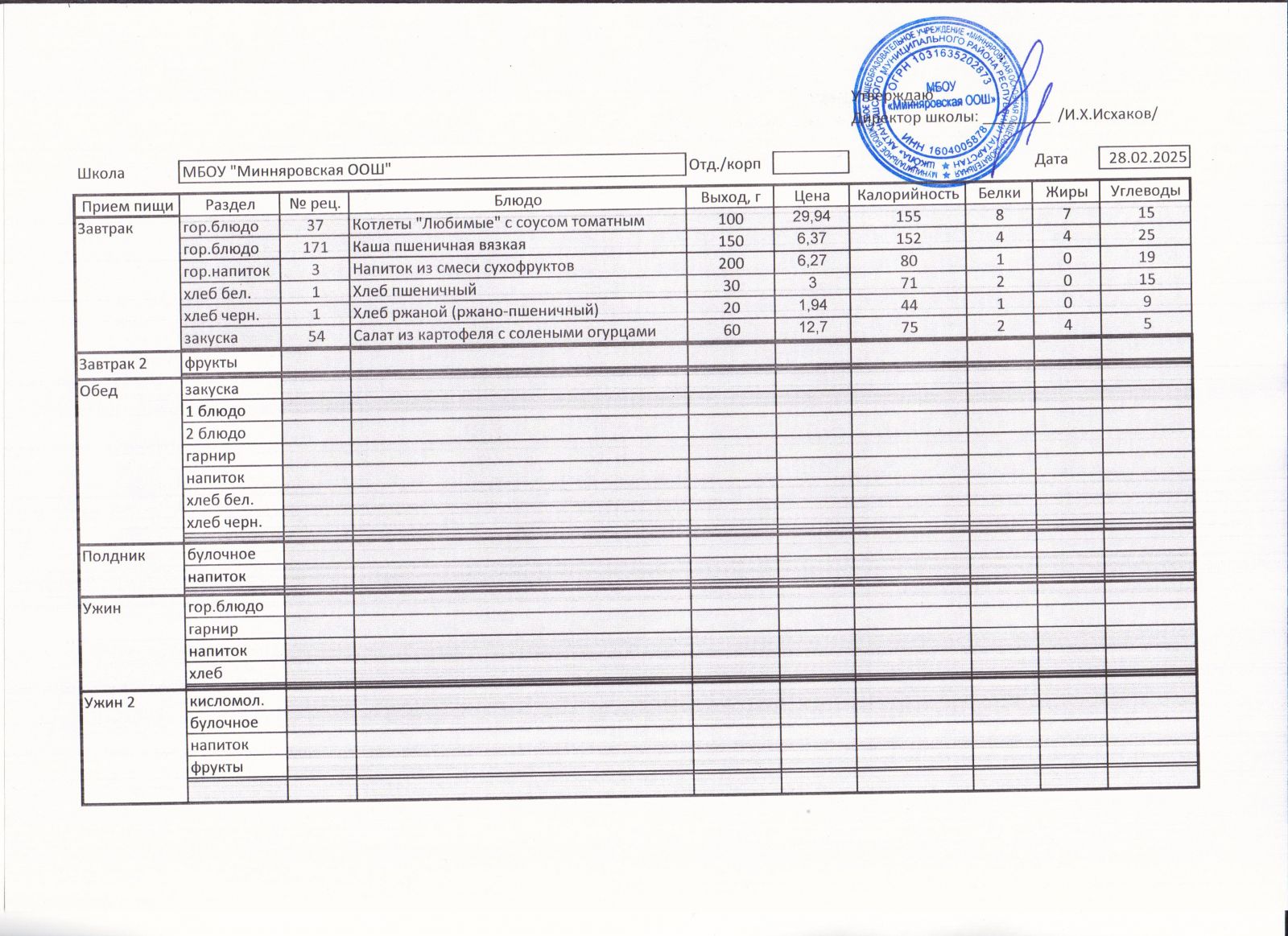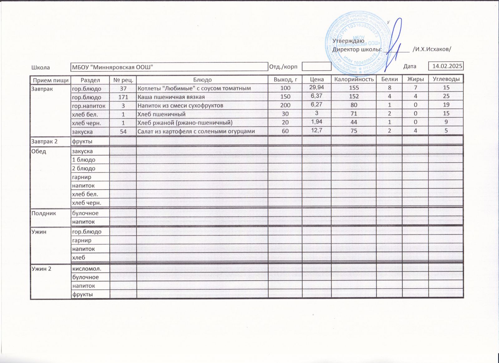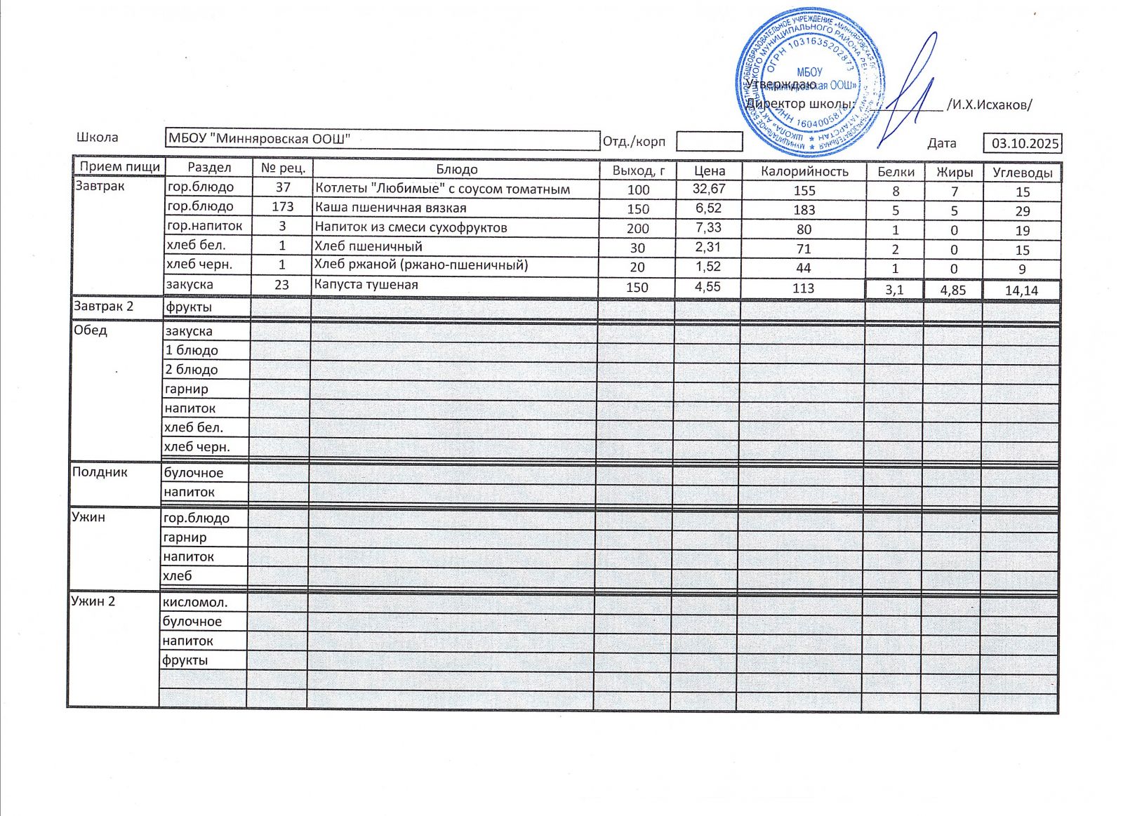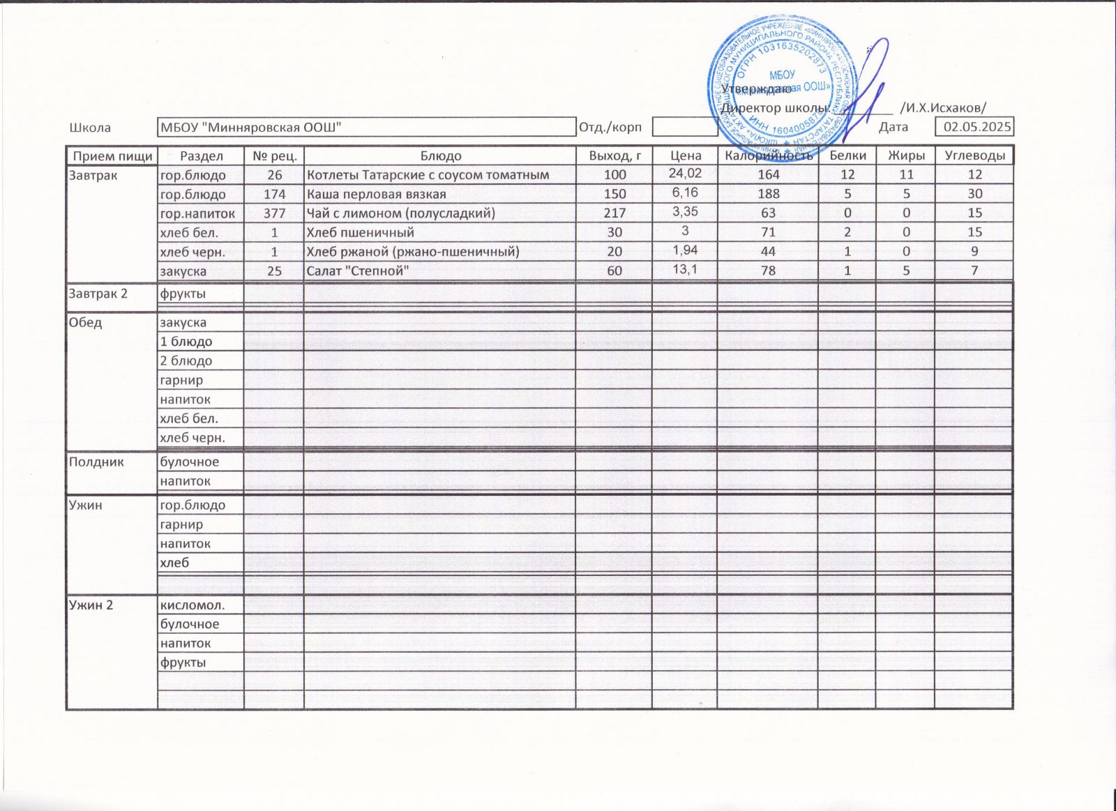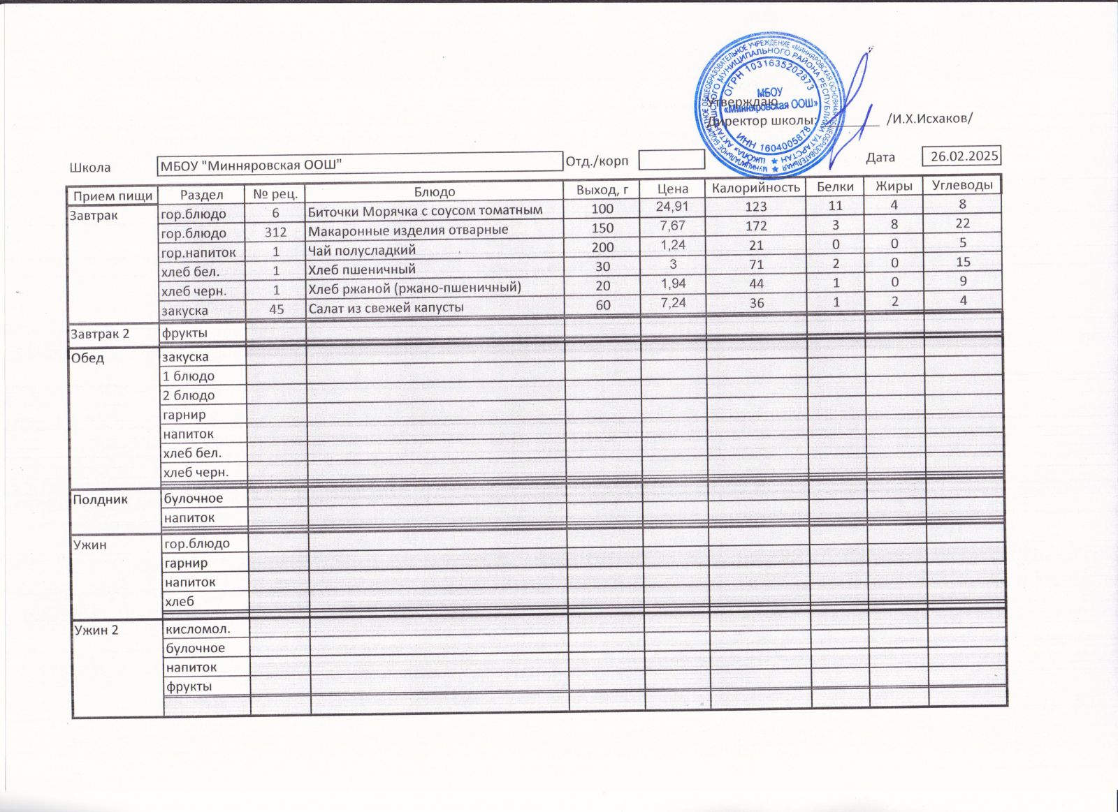 Меню МБОУ "Минняровская ООШ" на 25.11.2002г.
