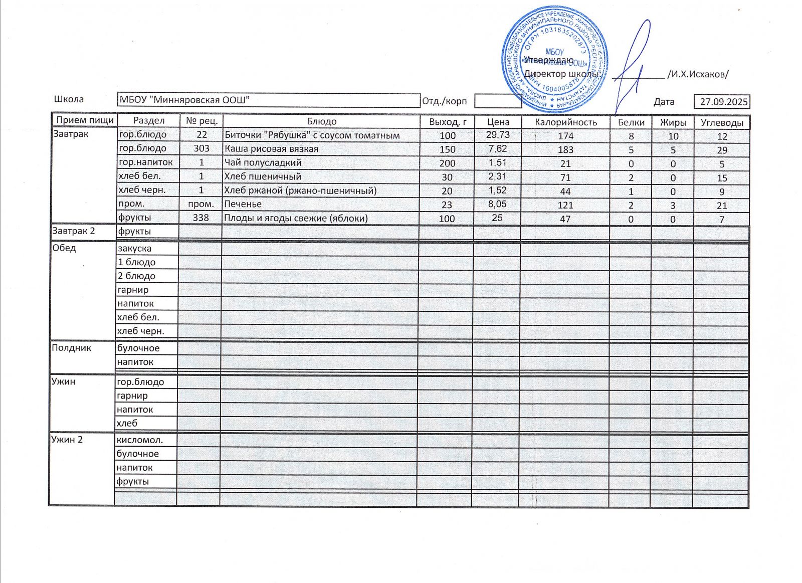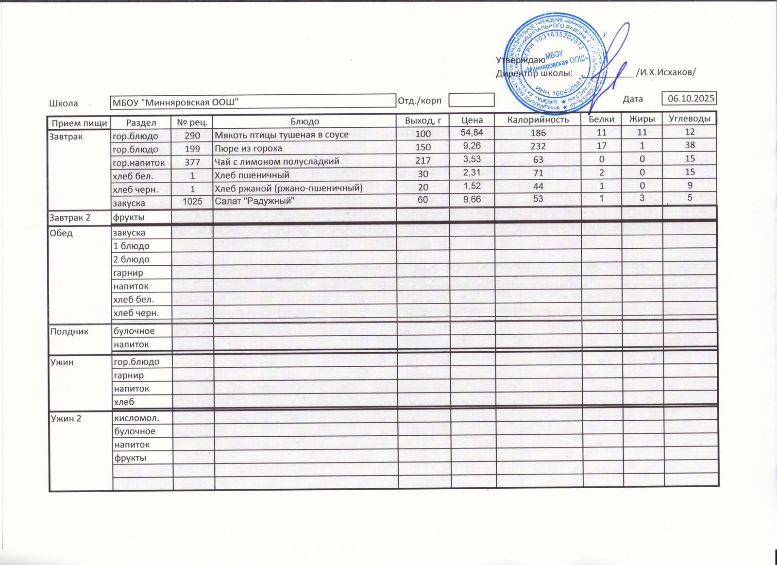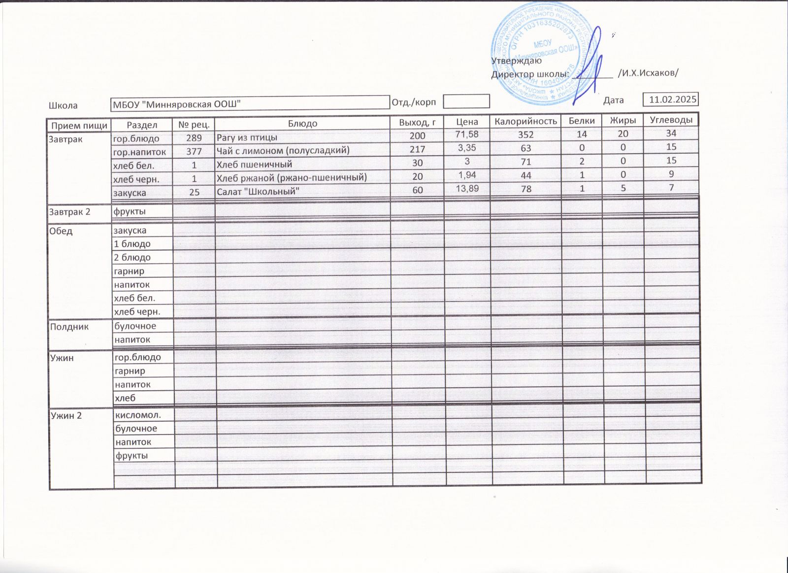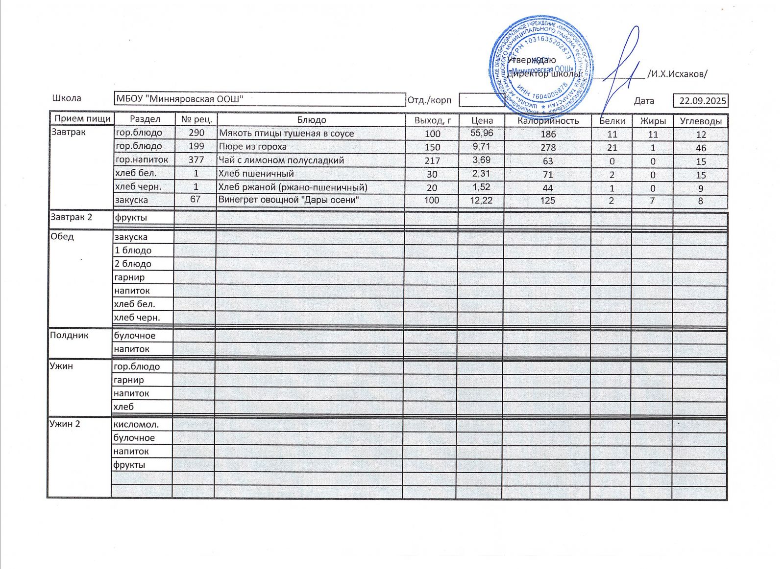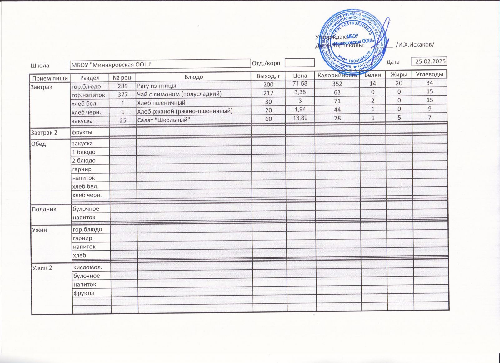 Меню МБОУ "Минняровская ООШ" на 25.11.2002г.