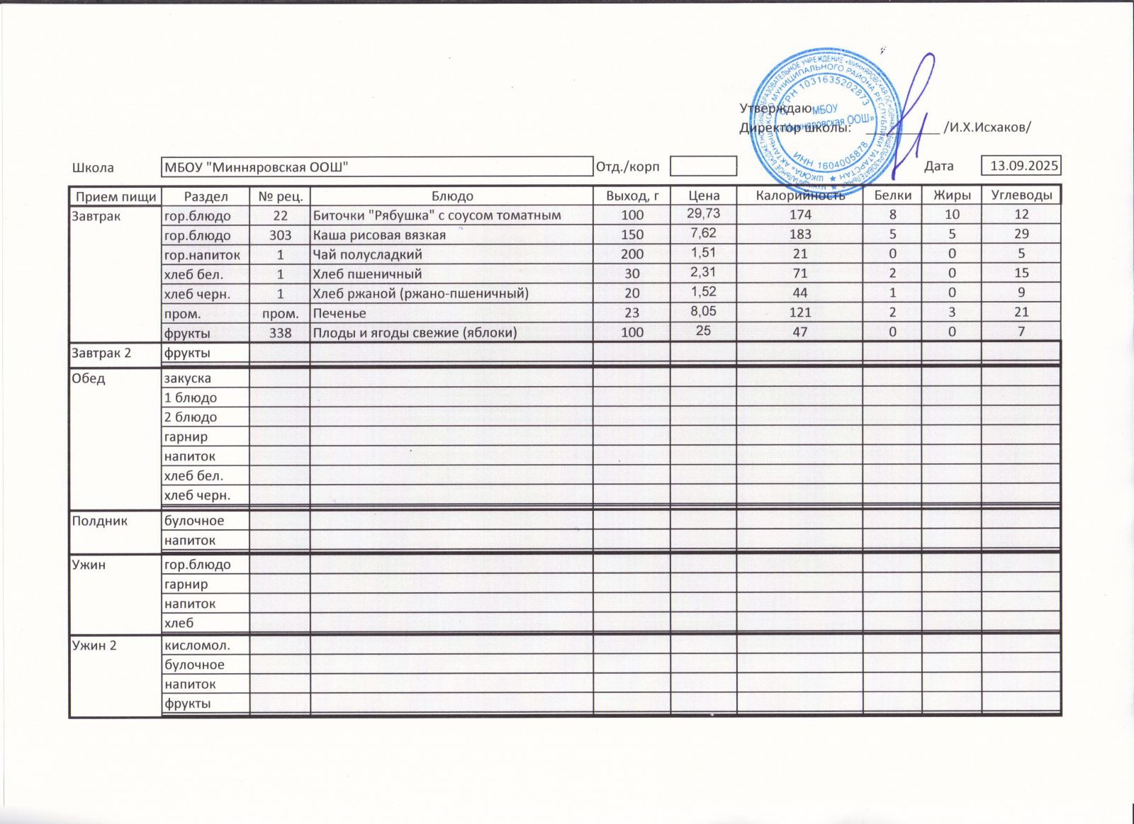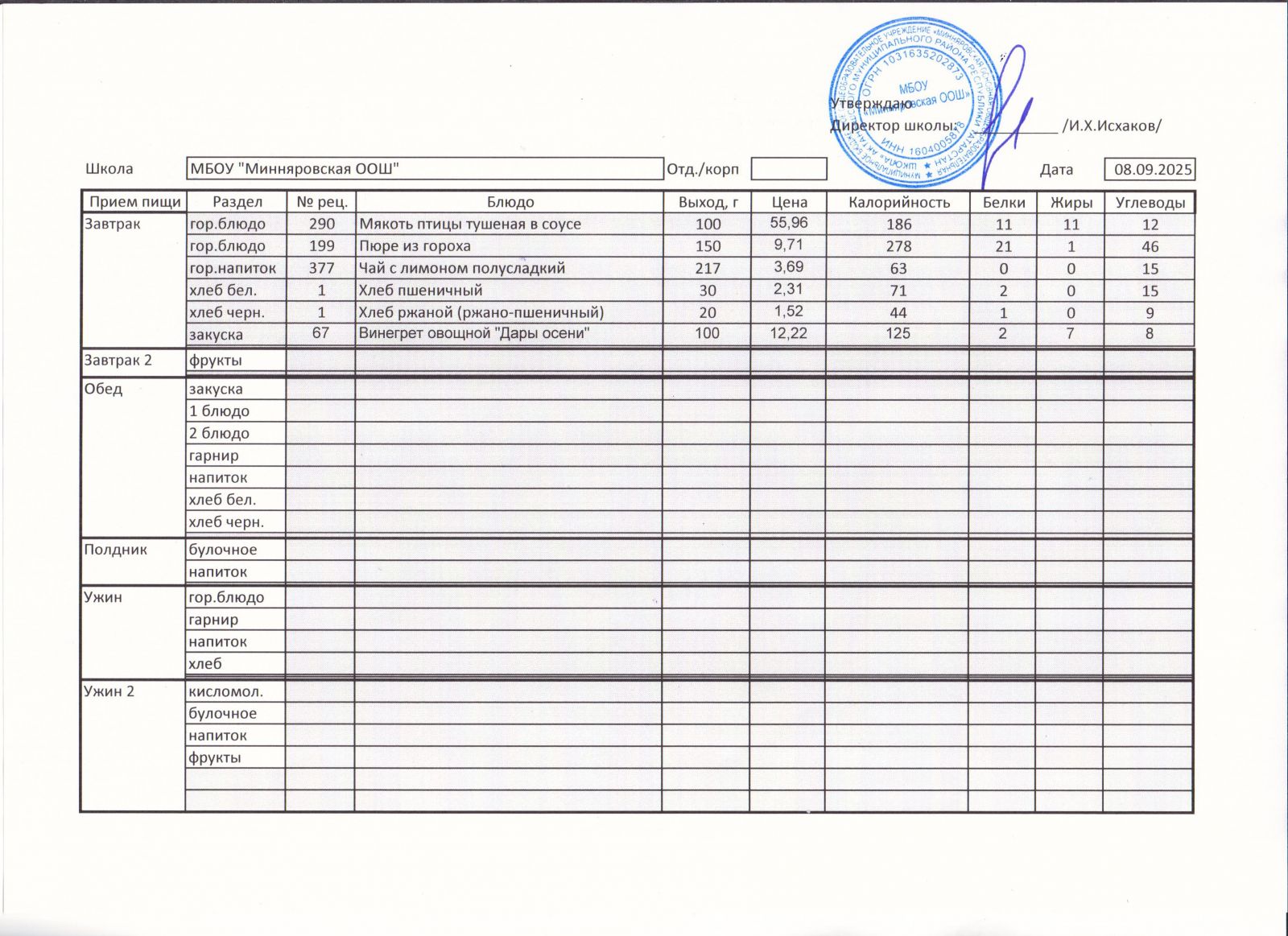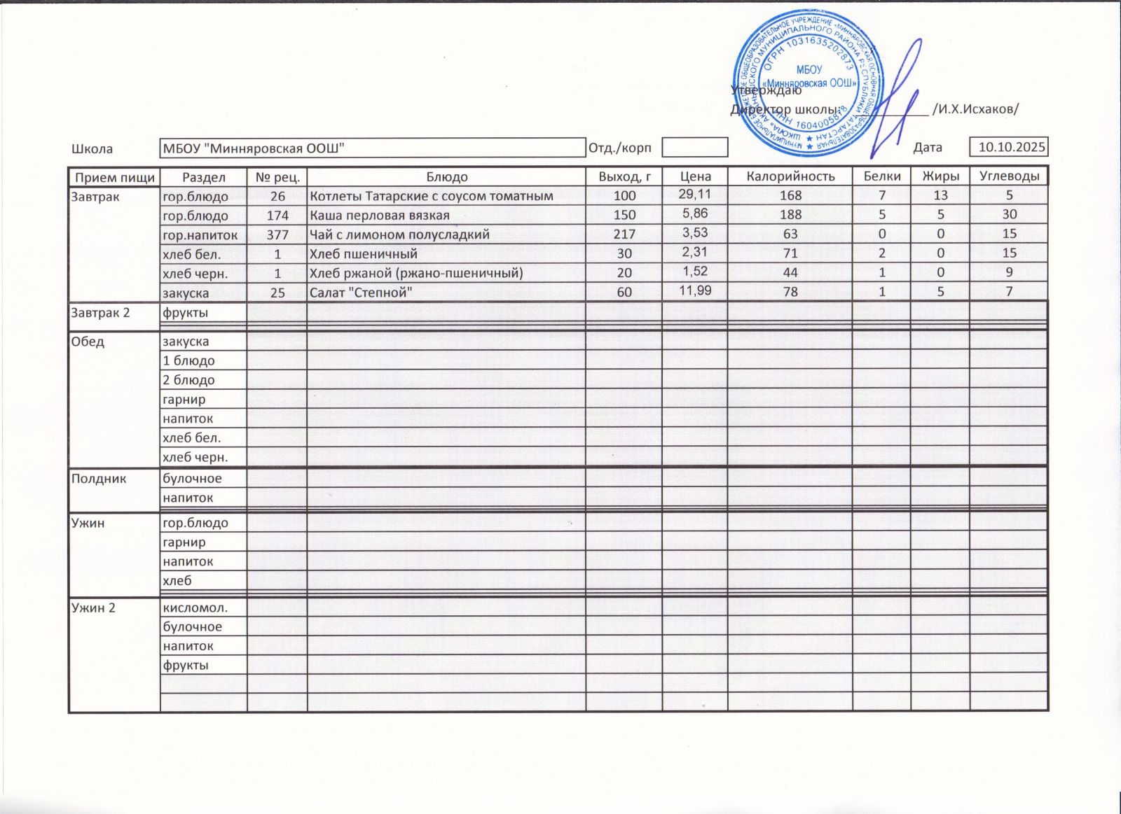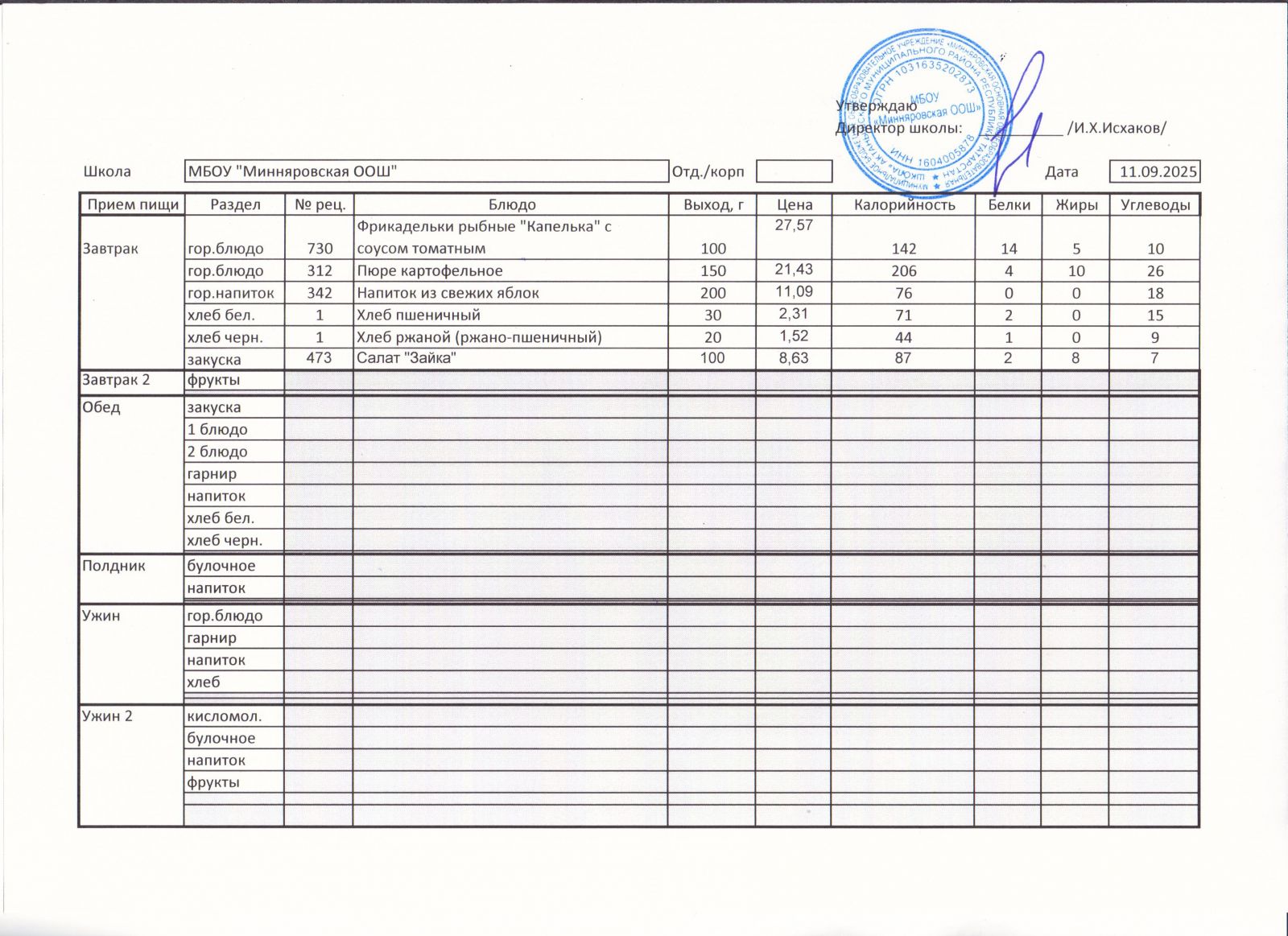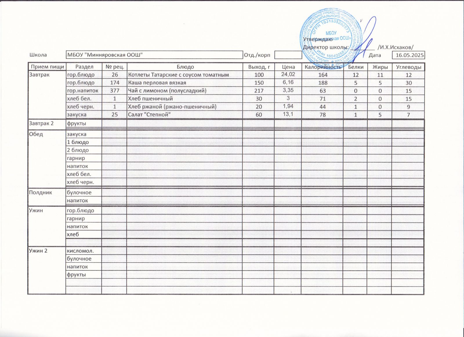 Меню МБОУ "Минняровская ООШ" на 25.11.2002г.