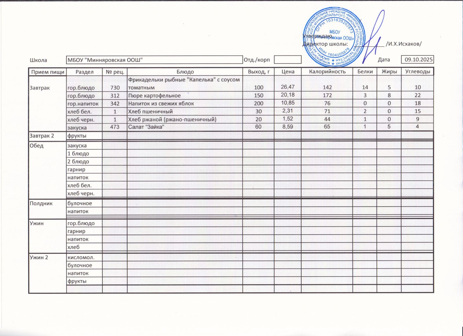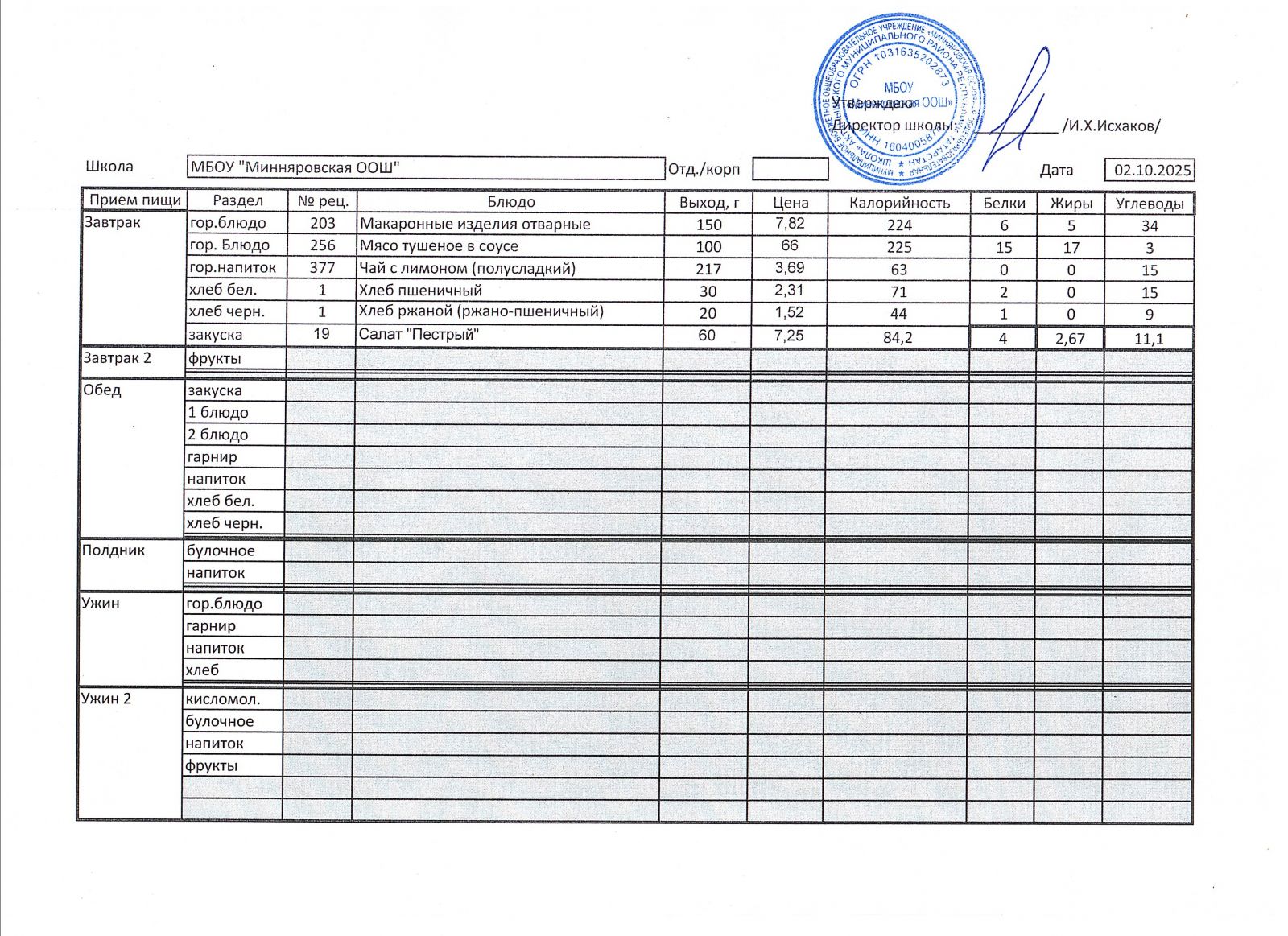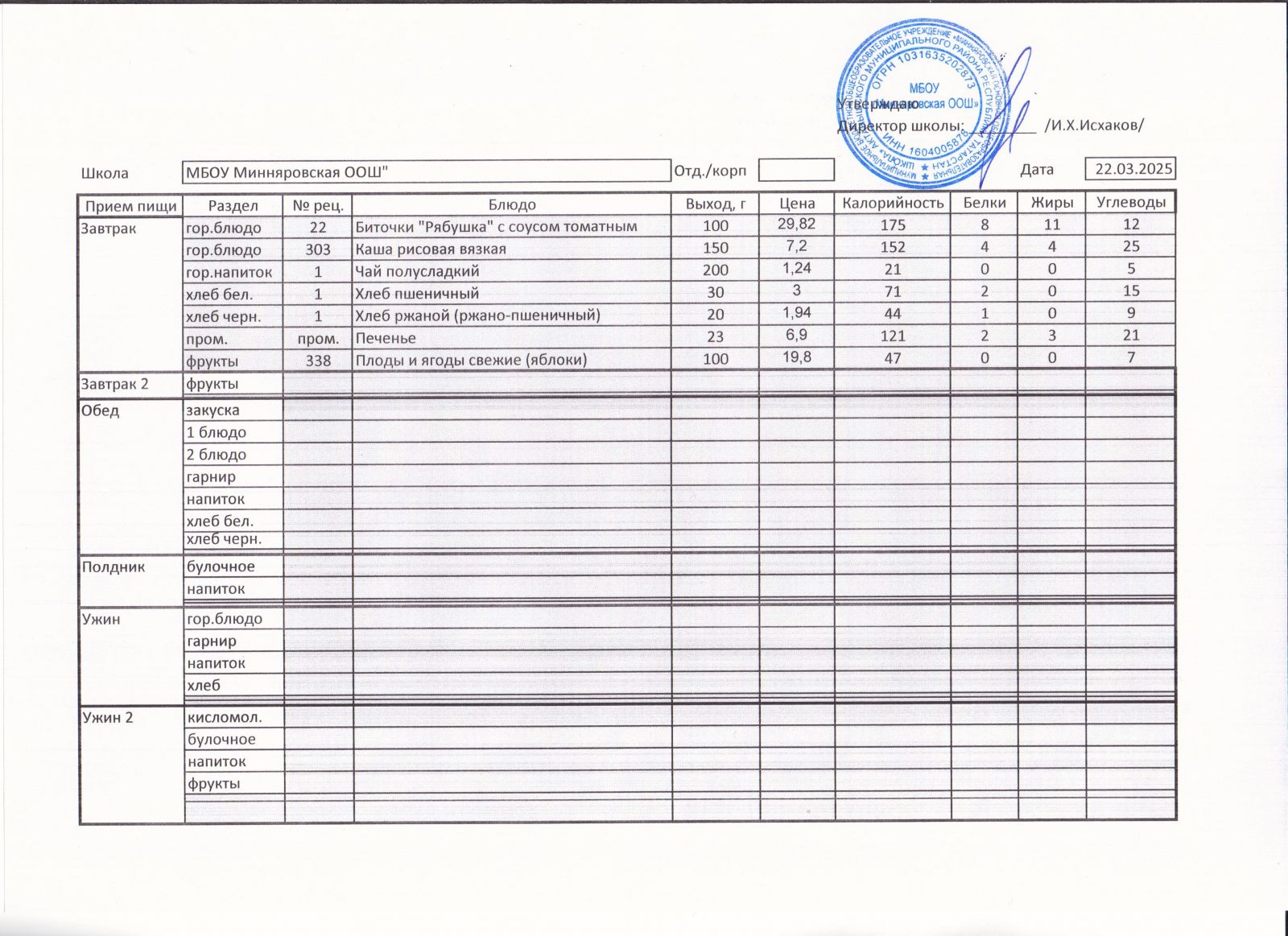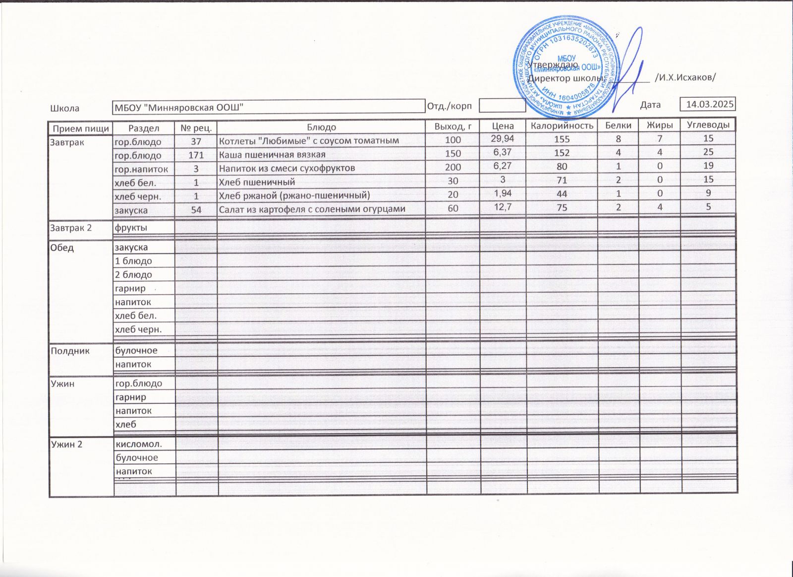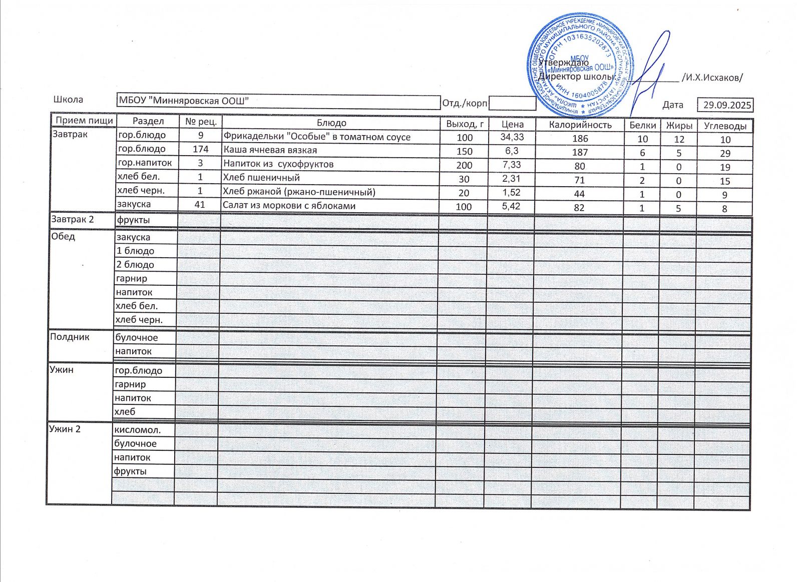 Меню МБОУ "Минняровская ООШ" на 25.11.2002г.