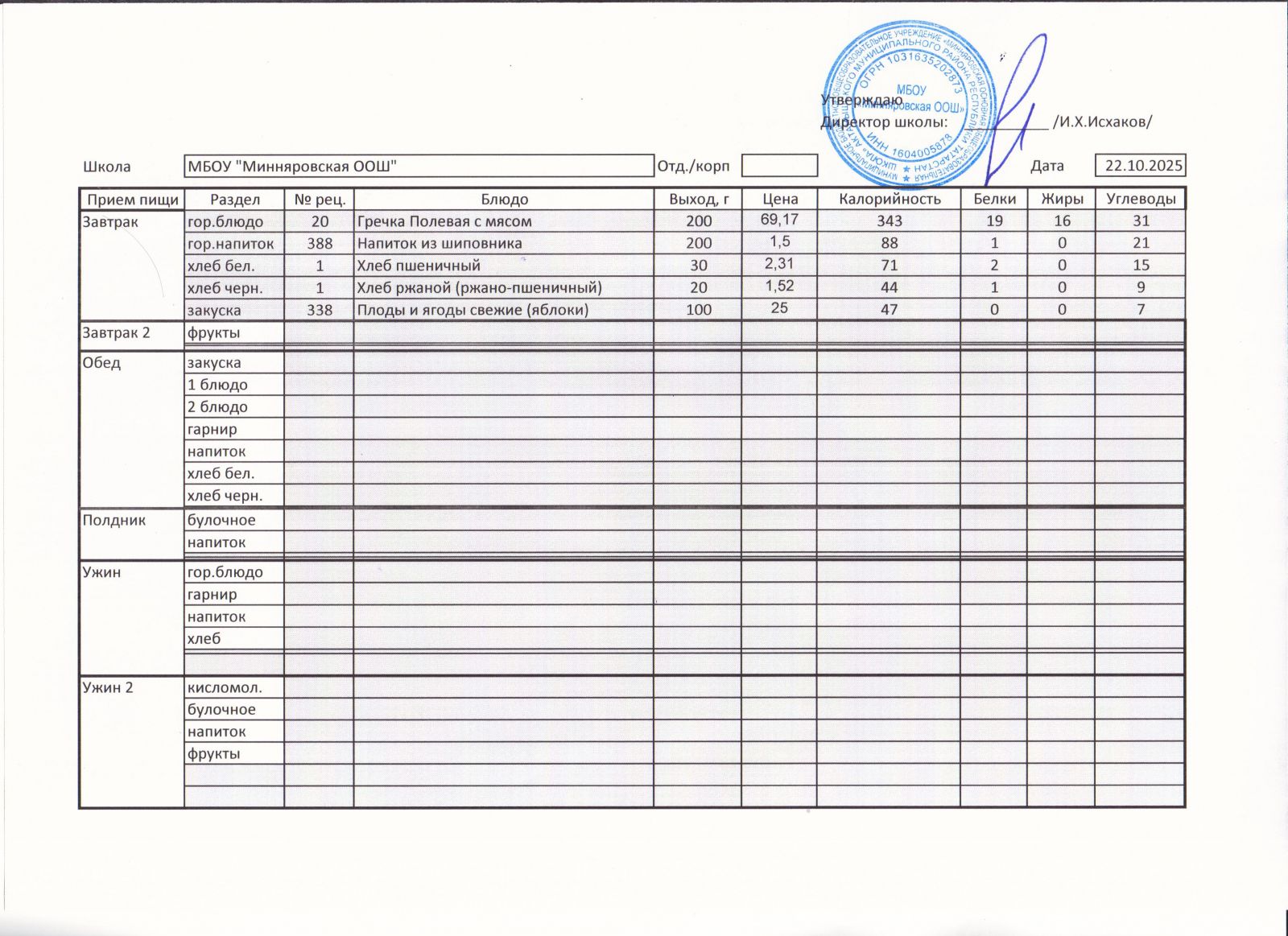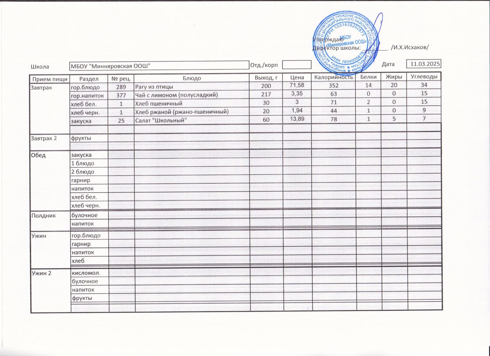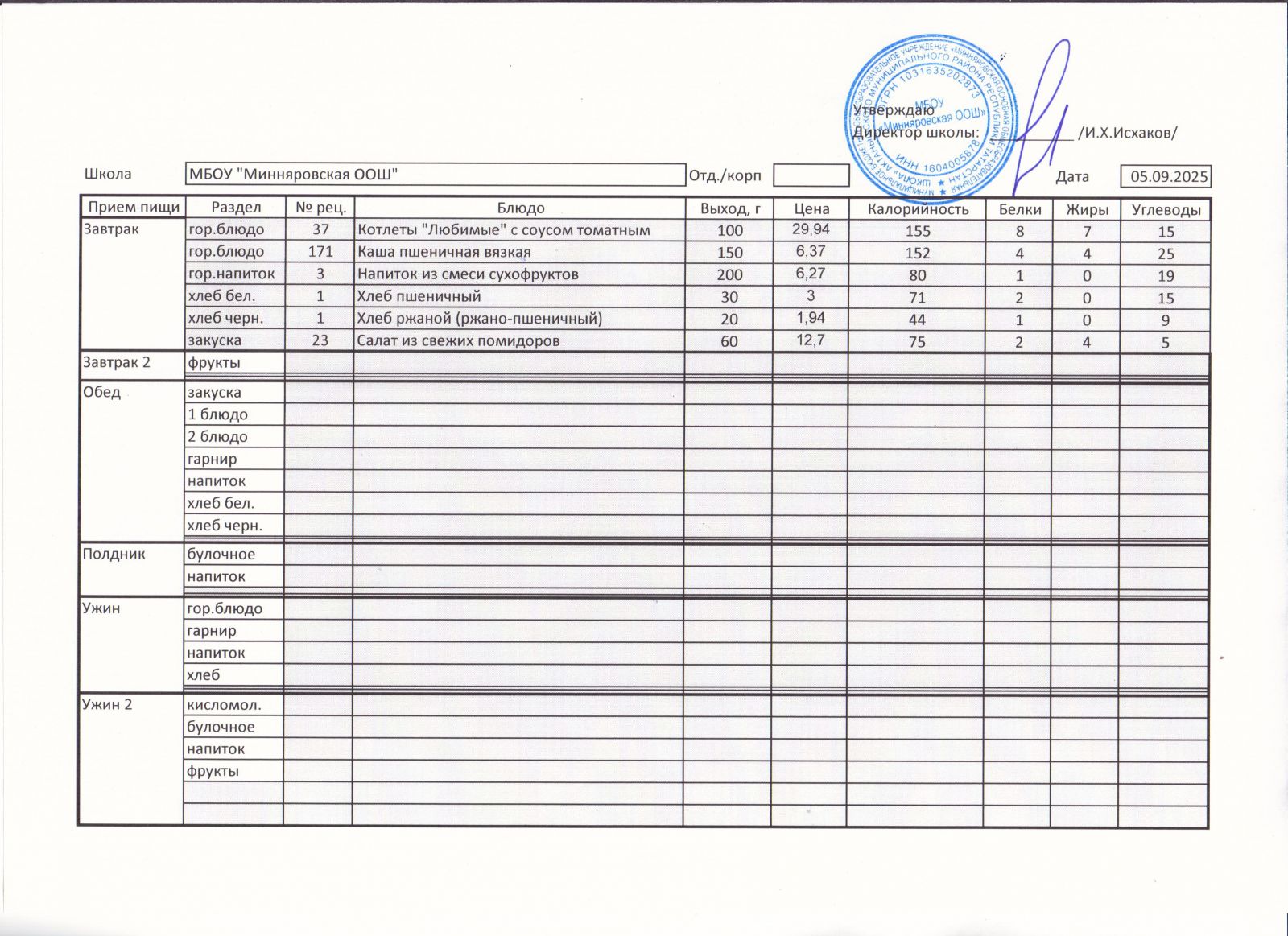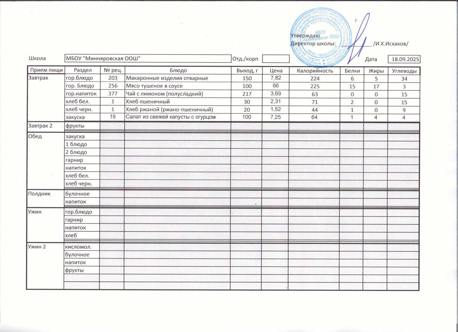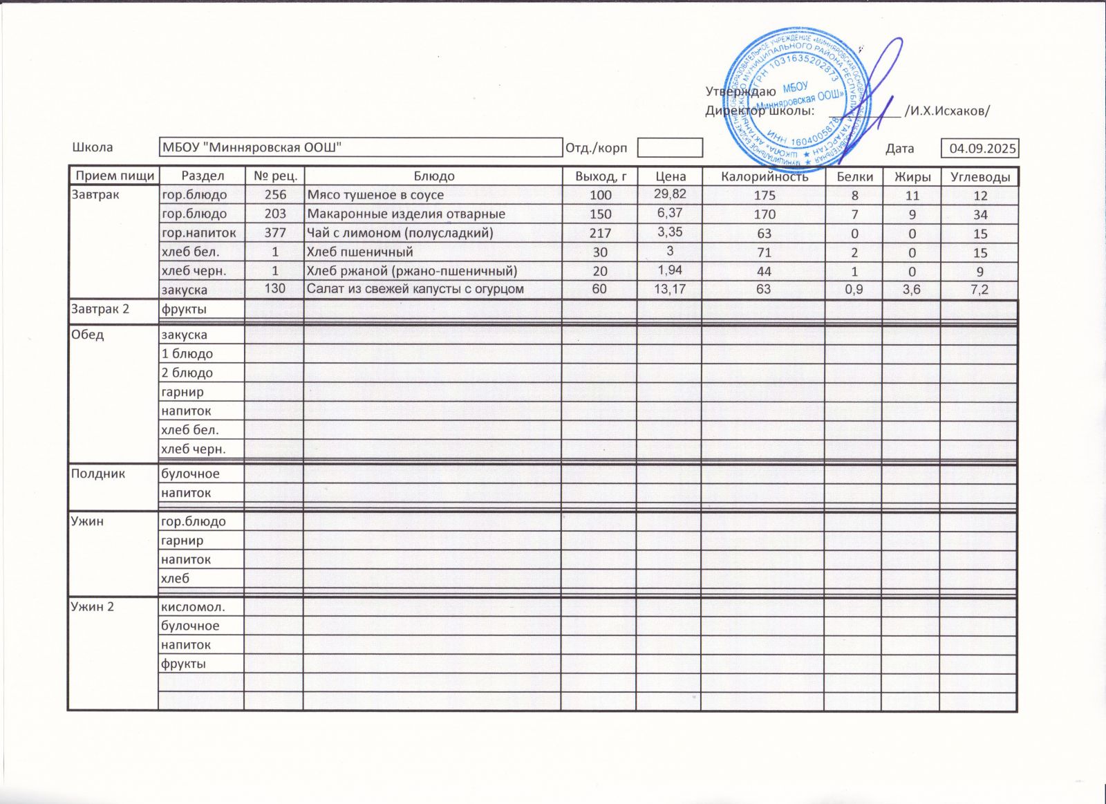 Меню МБОУ "Минняровская ООШ" на 25.11.2002г.