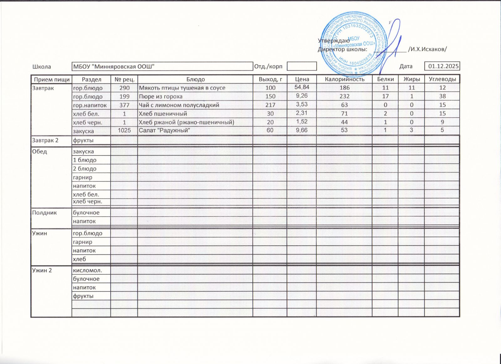 Меню МБОУ "Минняровская ООШ" на 1.12.2020