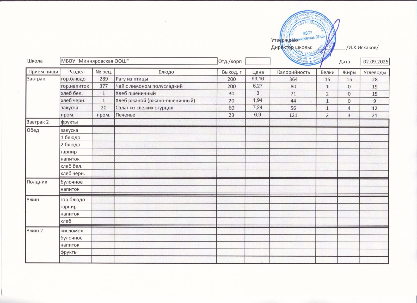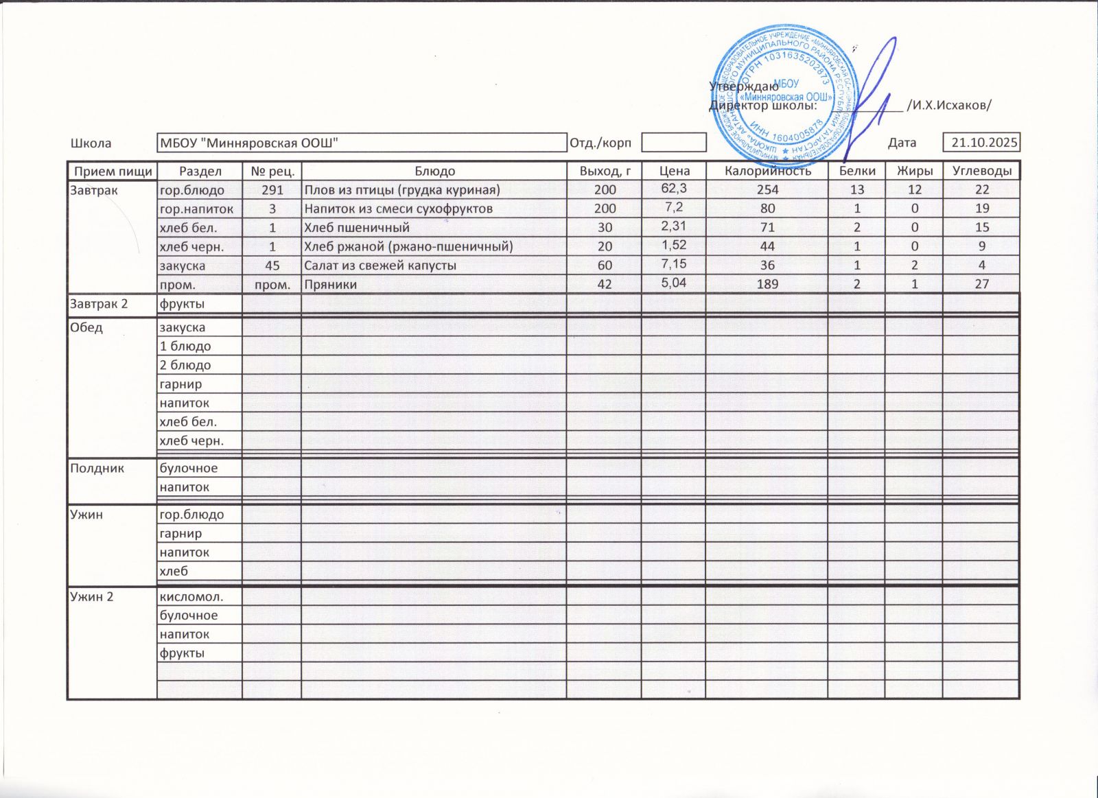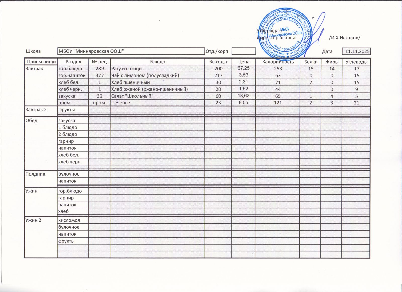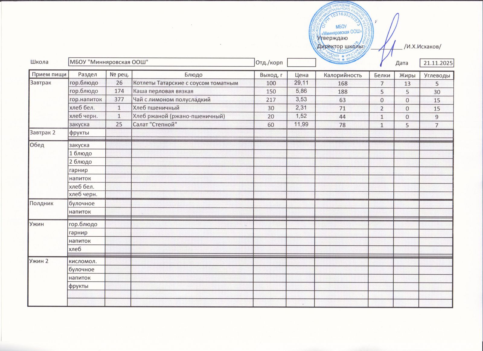 Меню МБОУ Минняровская ООШ на 21.11.2020