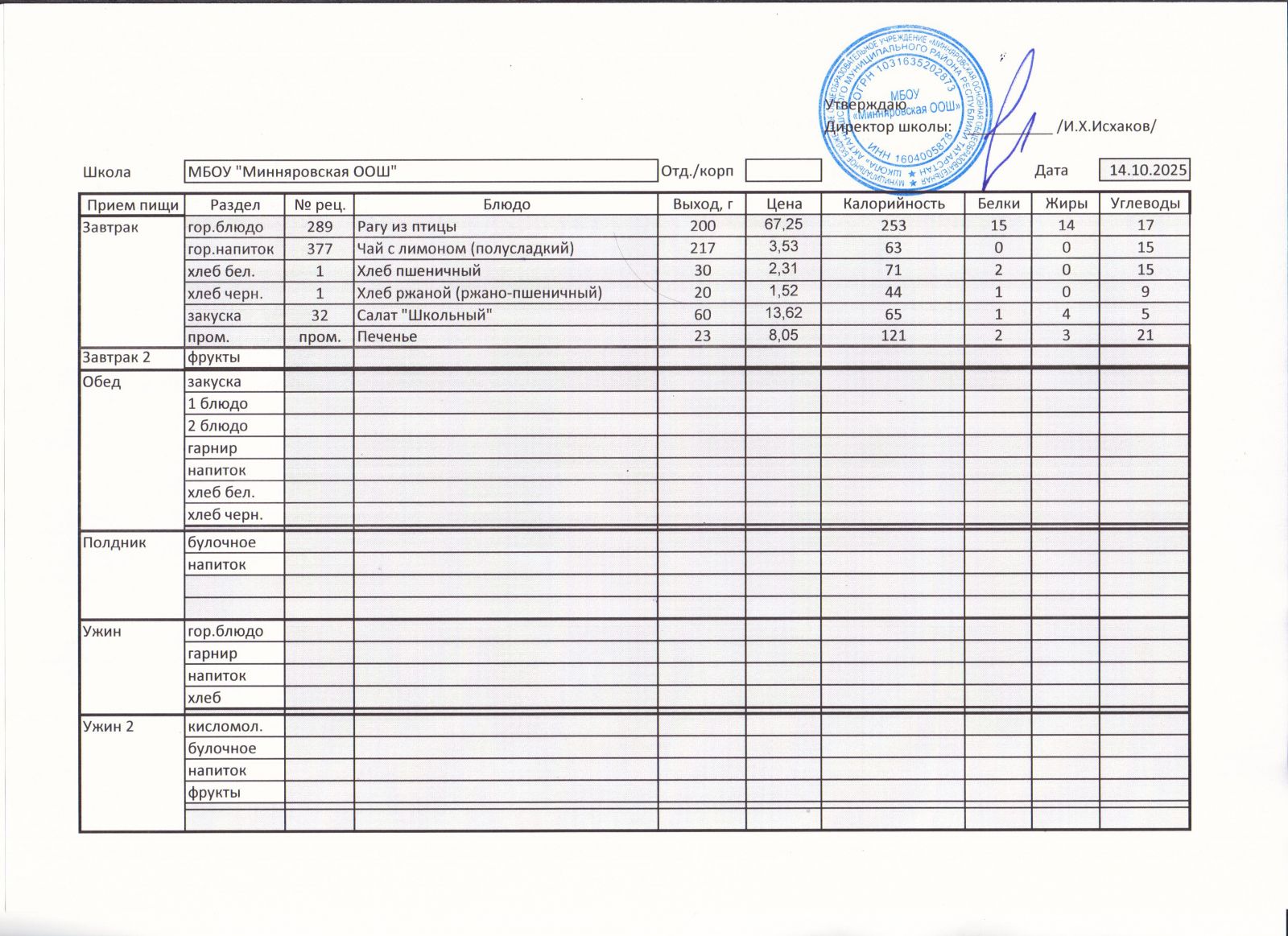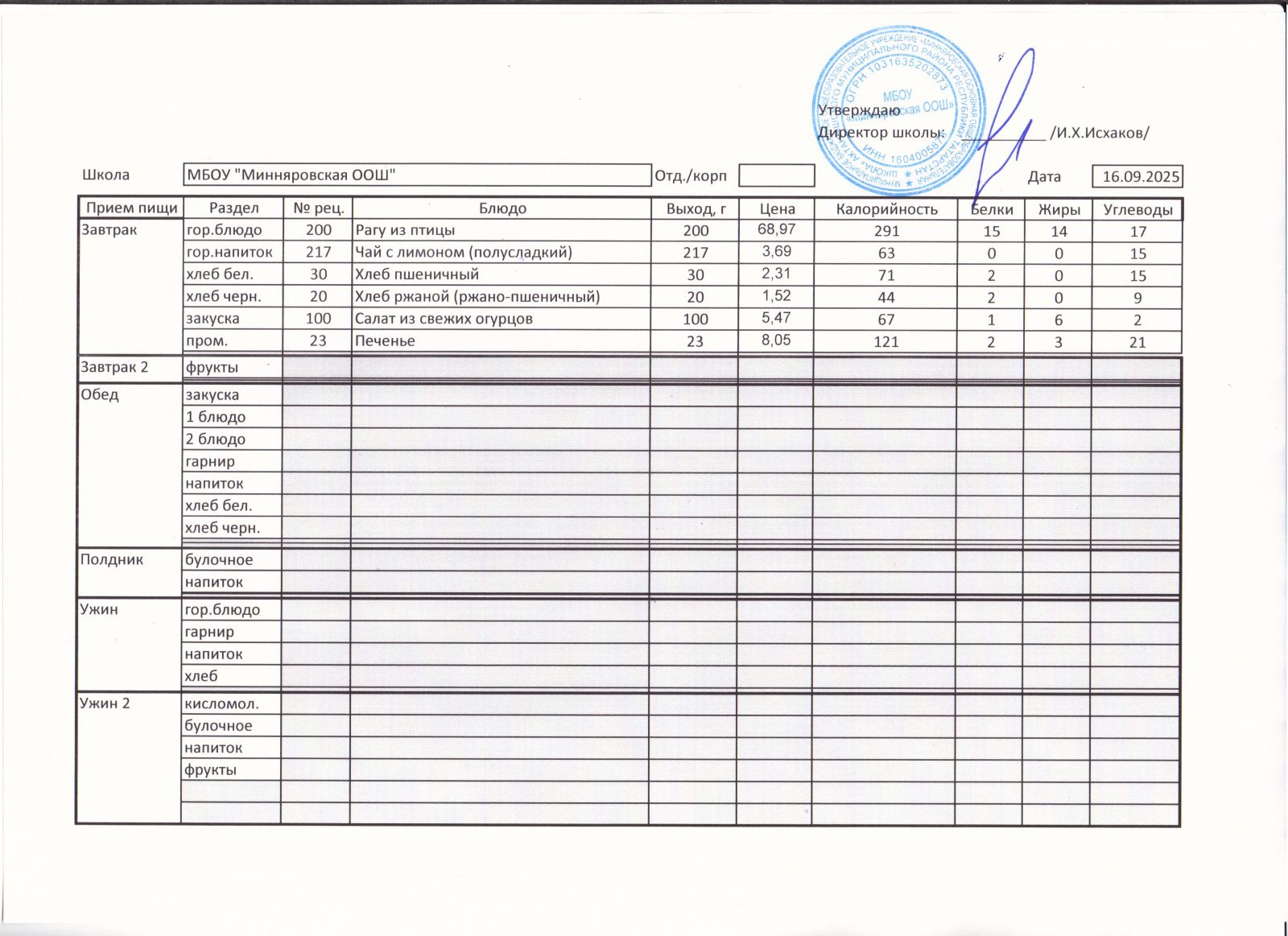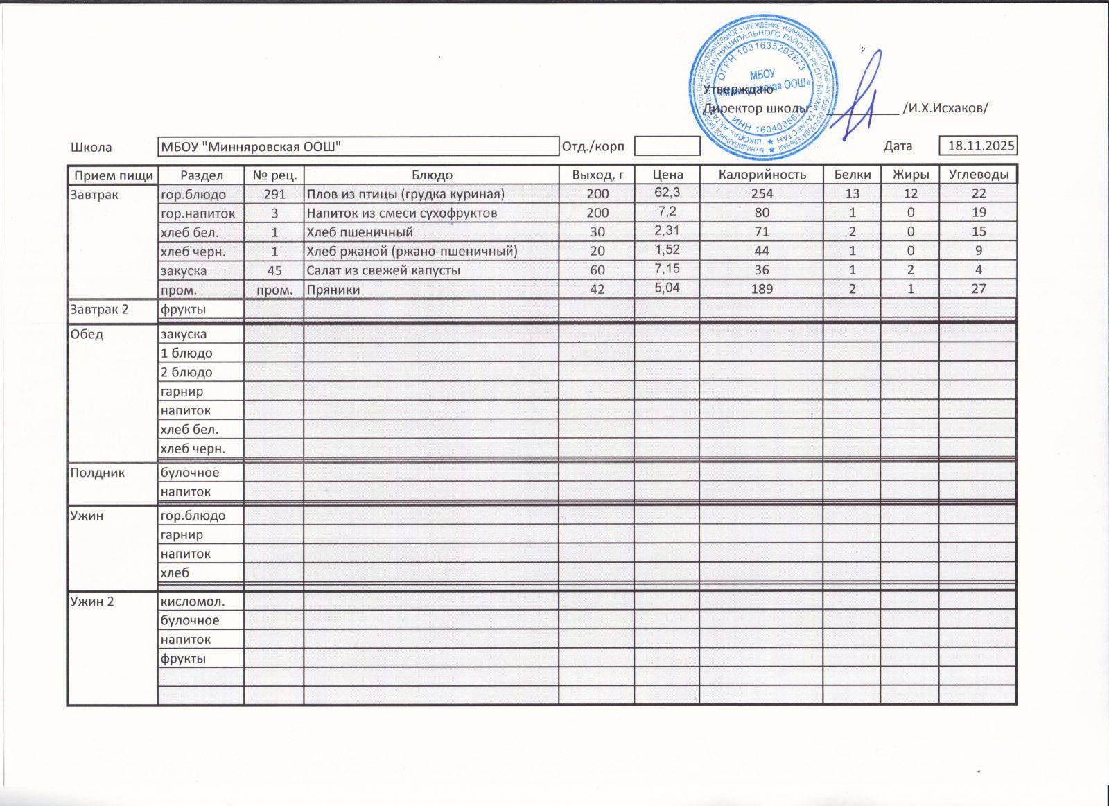 Меню МБОУ Минняровская ООШ на 21.11.2020