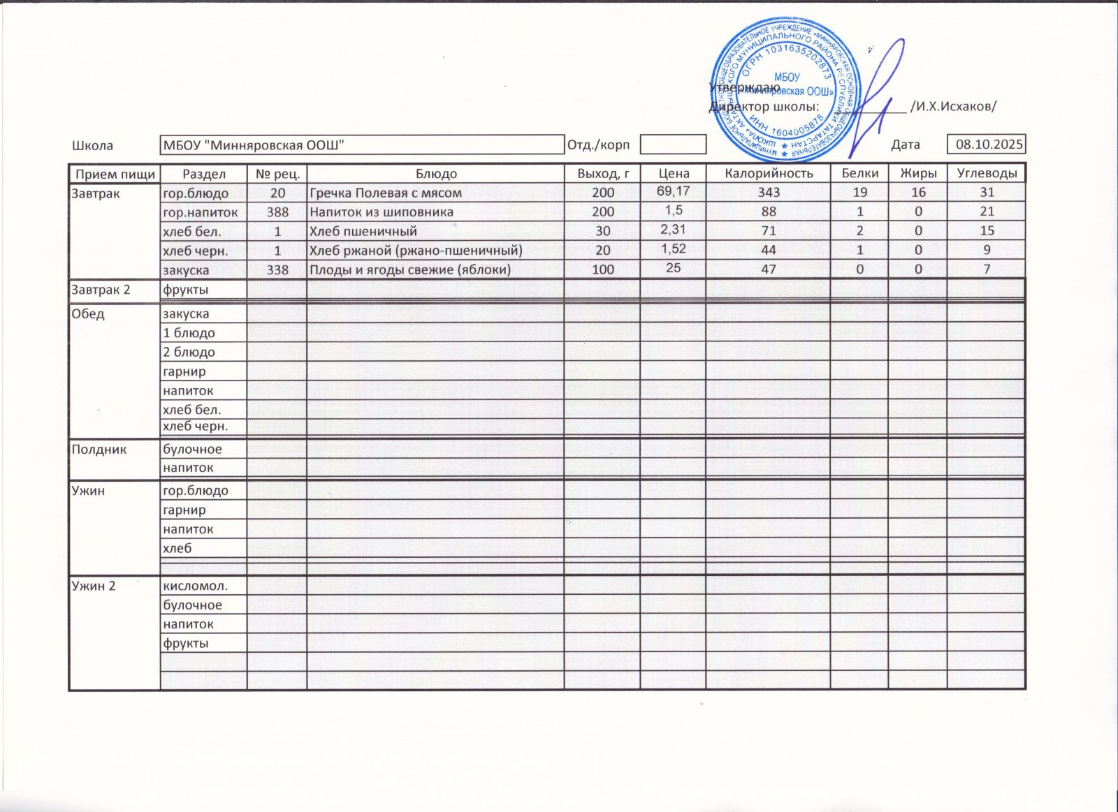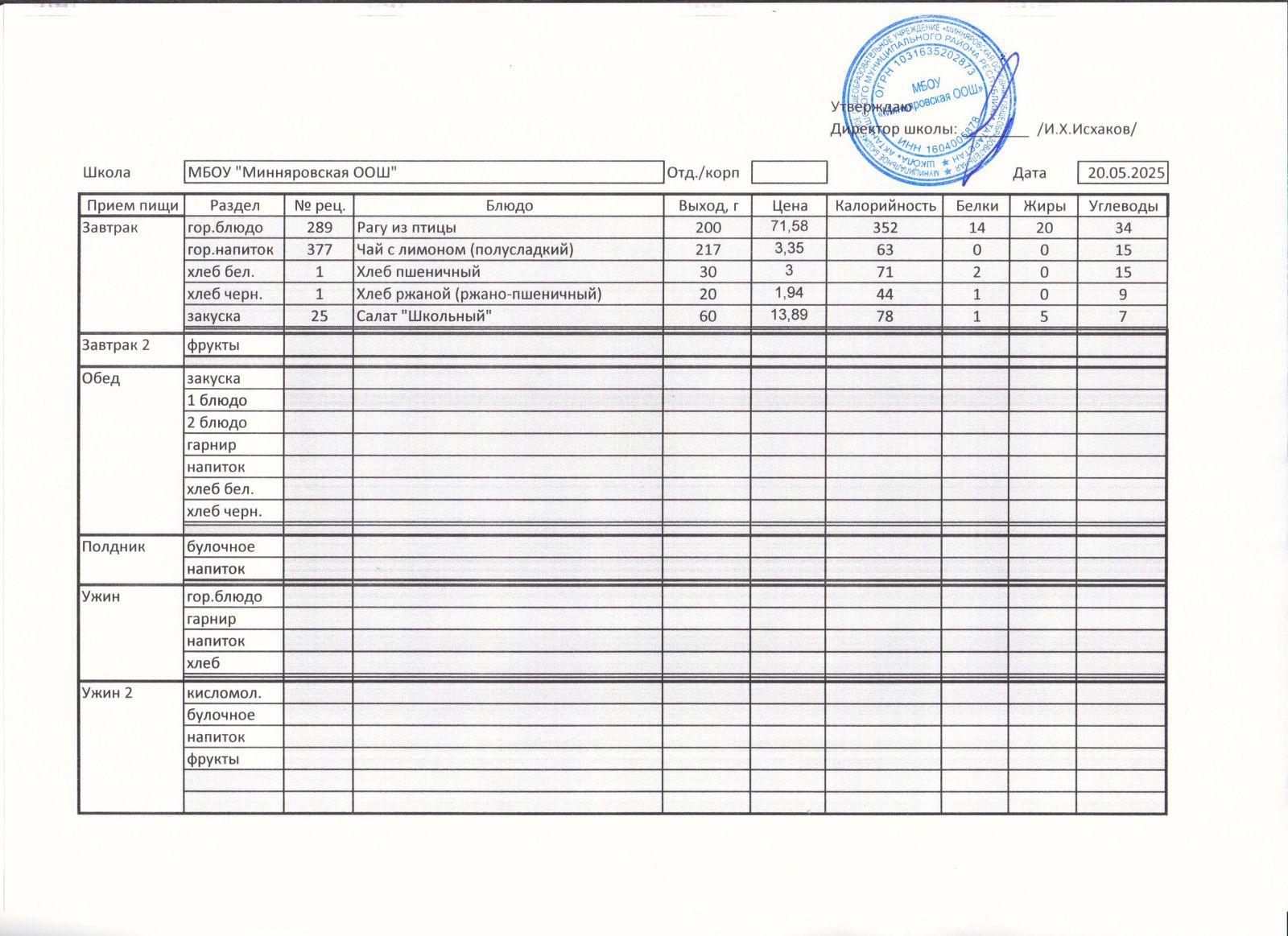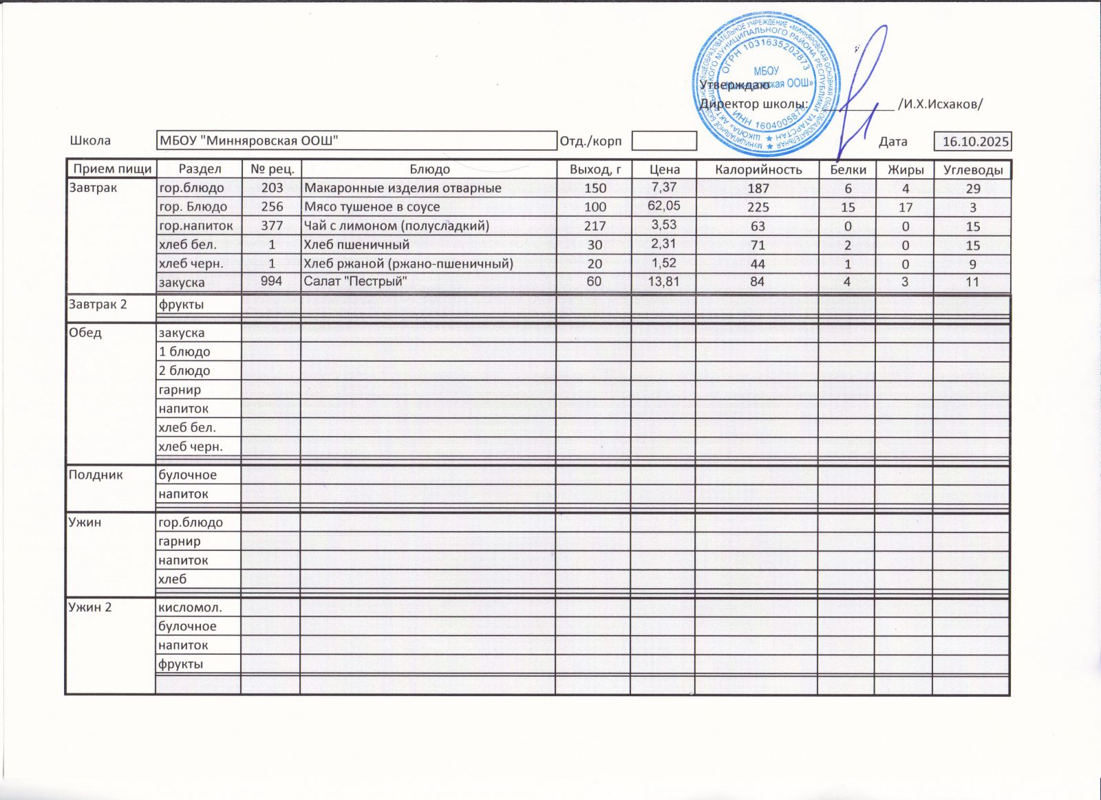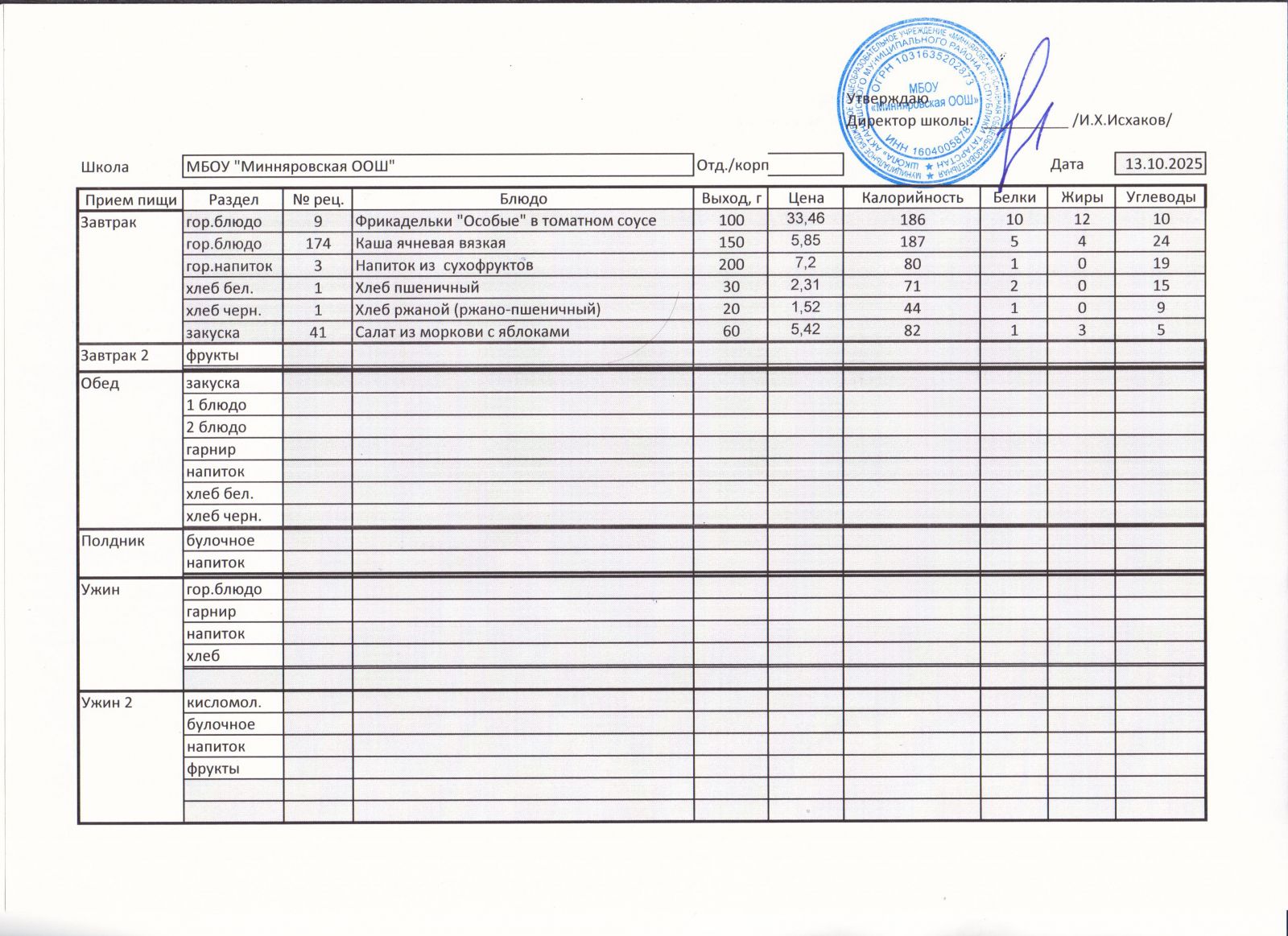 Меню МБОУ Минняровская ООШ на 21.11.2020
