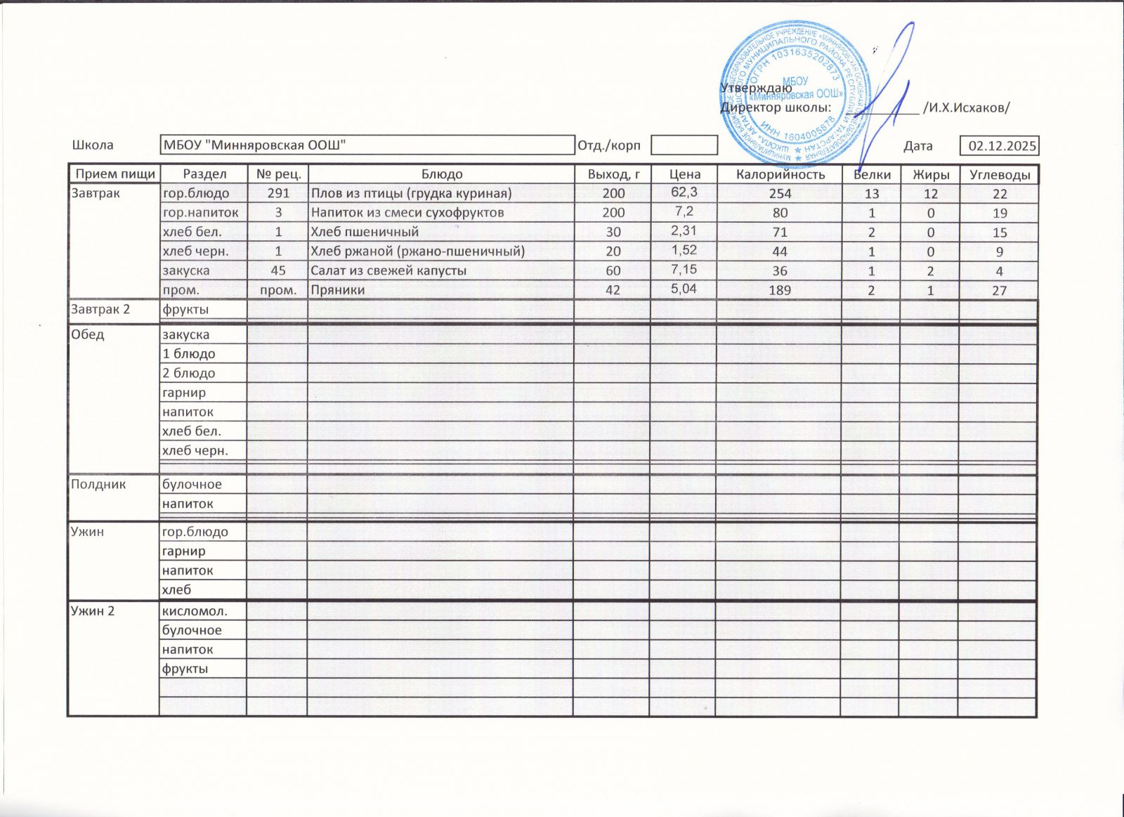 Меню МБОУ "Минняровская ООШ" на 2.12.2020