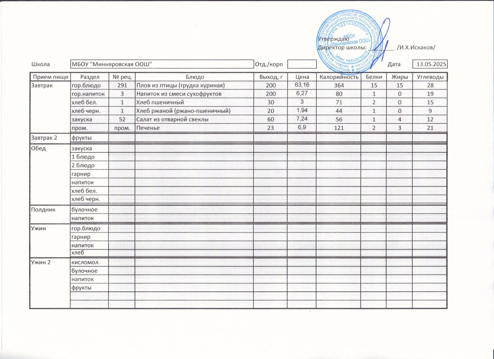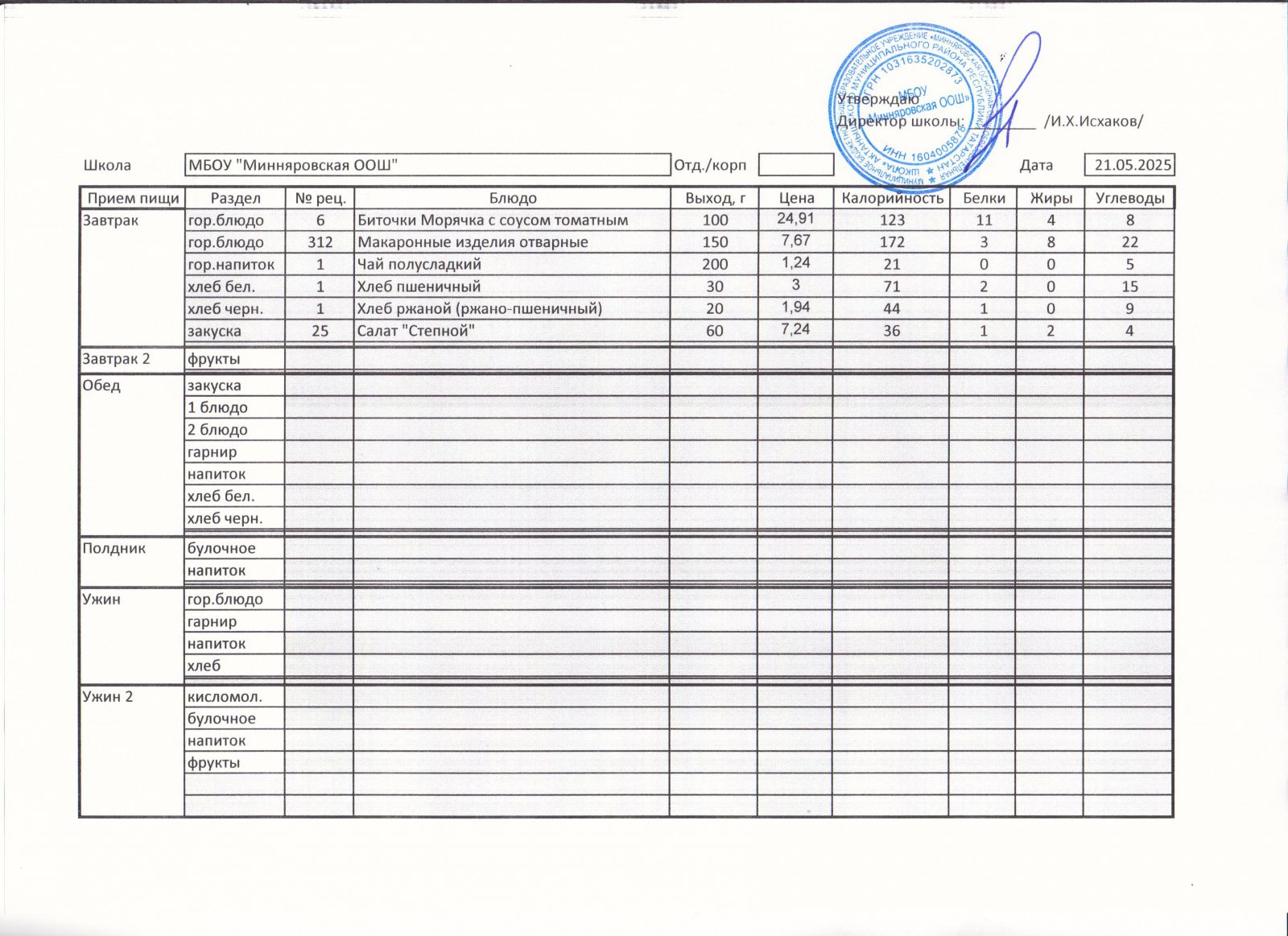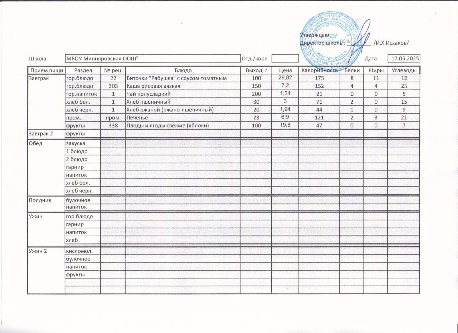Меню МБОУ "Минняровская ООШ" на 17.05, на 18.05, на 19.05, на 20.05, на 21.05, на 22.05.2021 г.