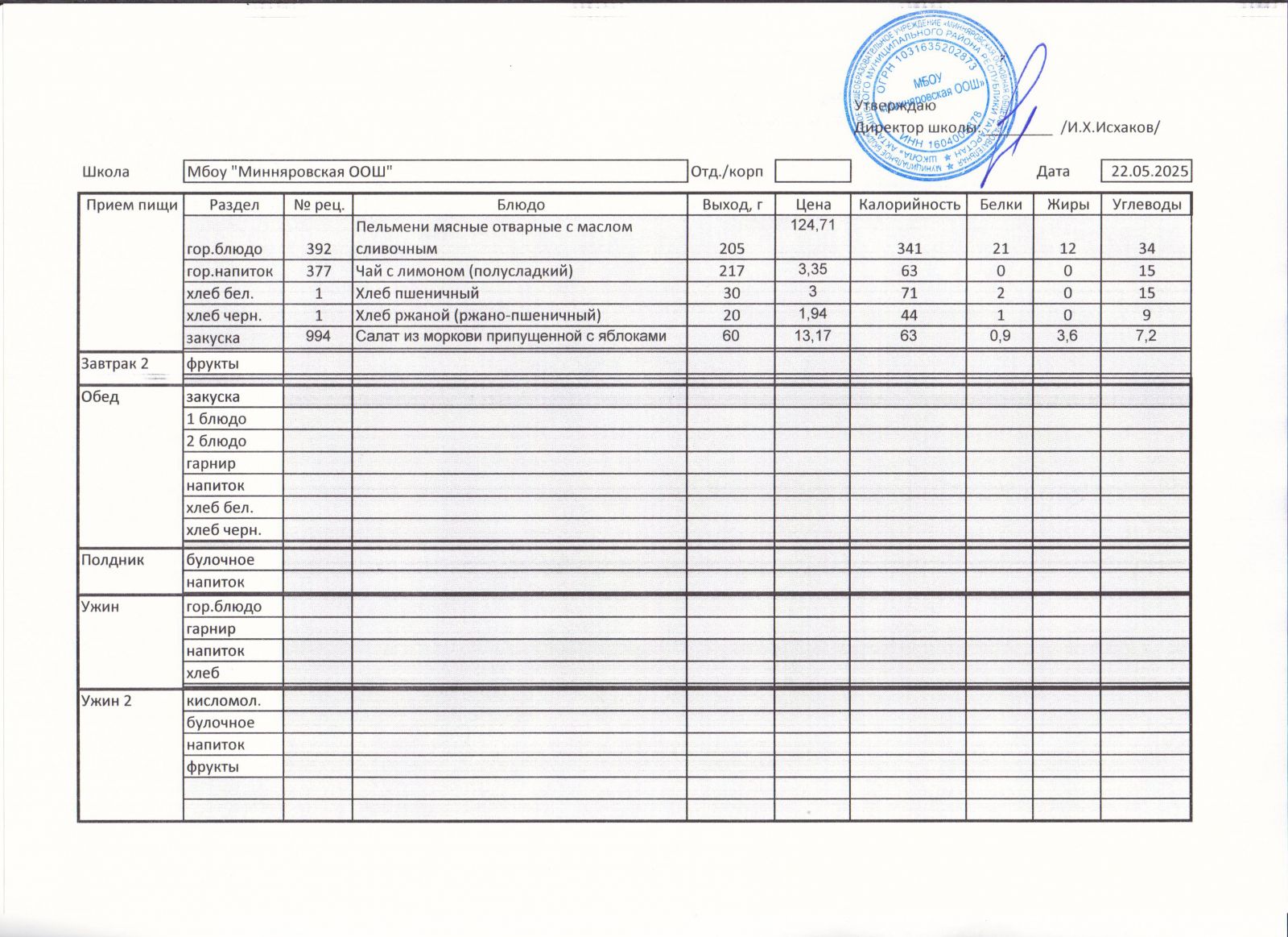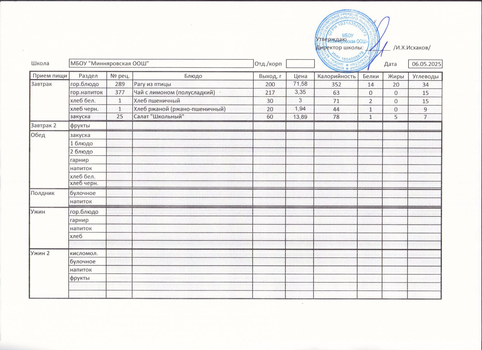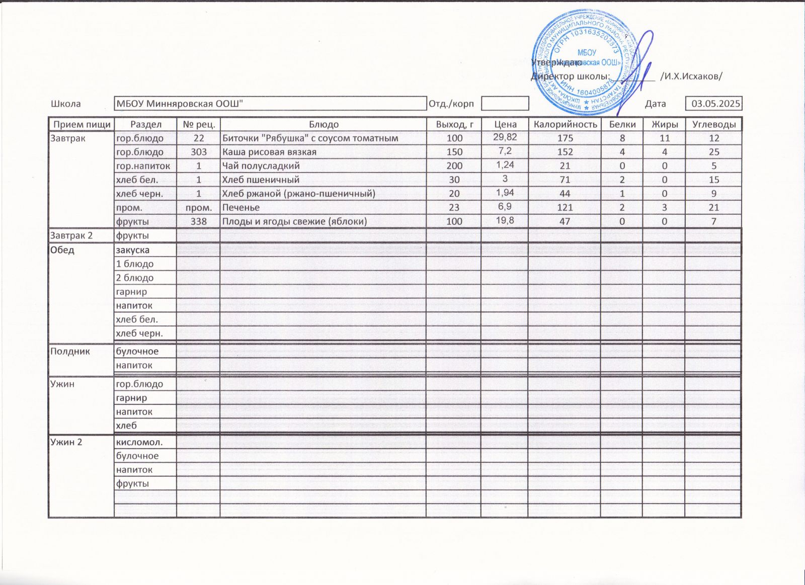 Меню МБОУ "Минняровская ООШ" на 17.05, на 18.05, на 19.05, на 20.05, на 21.05, на 22.05.2021 г.