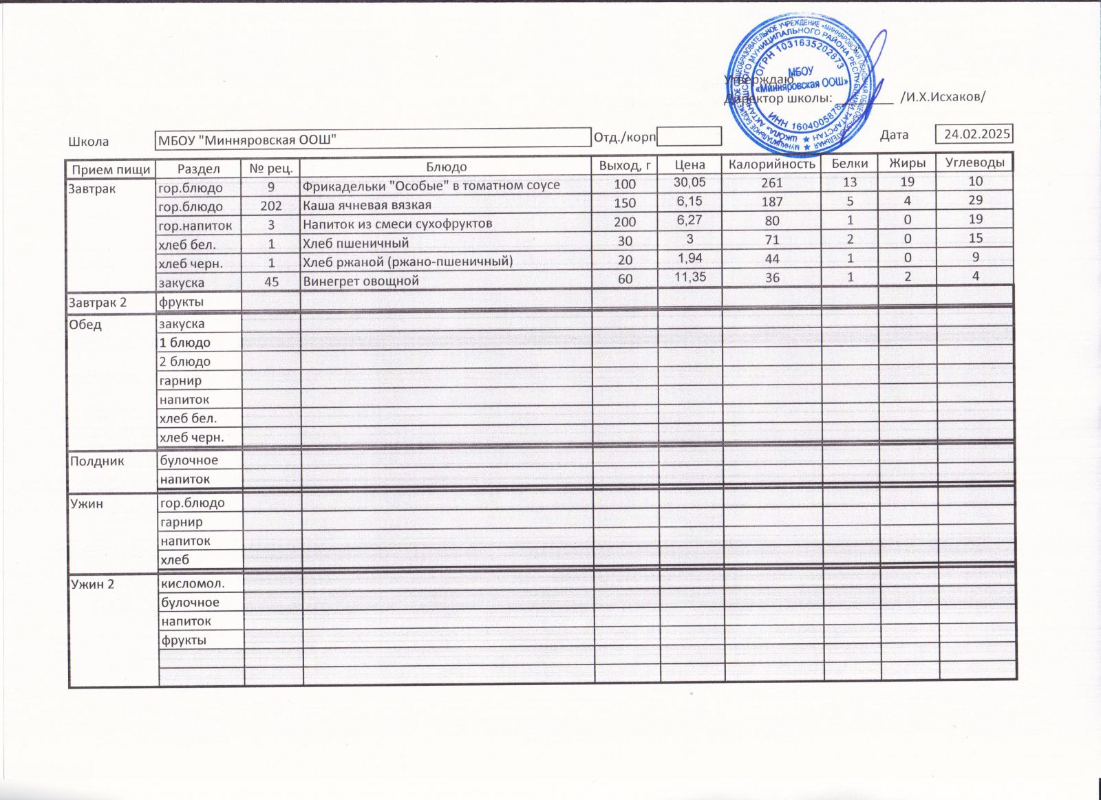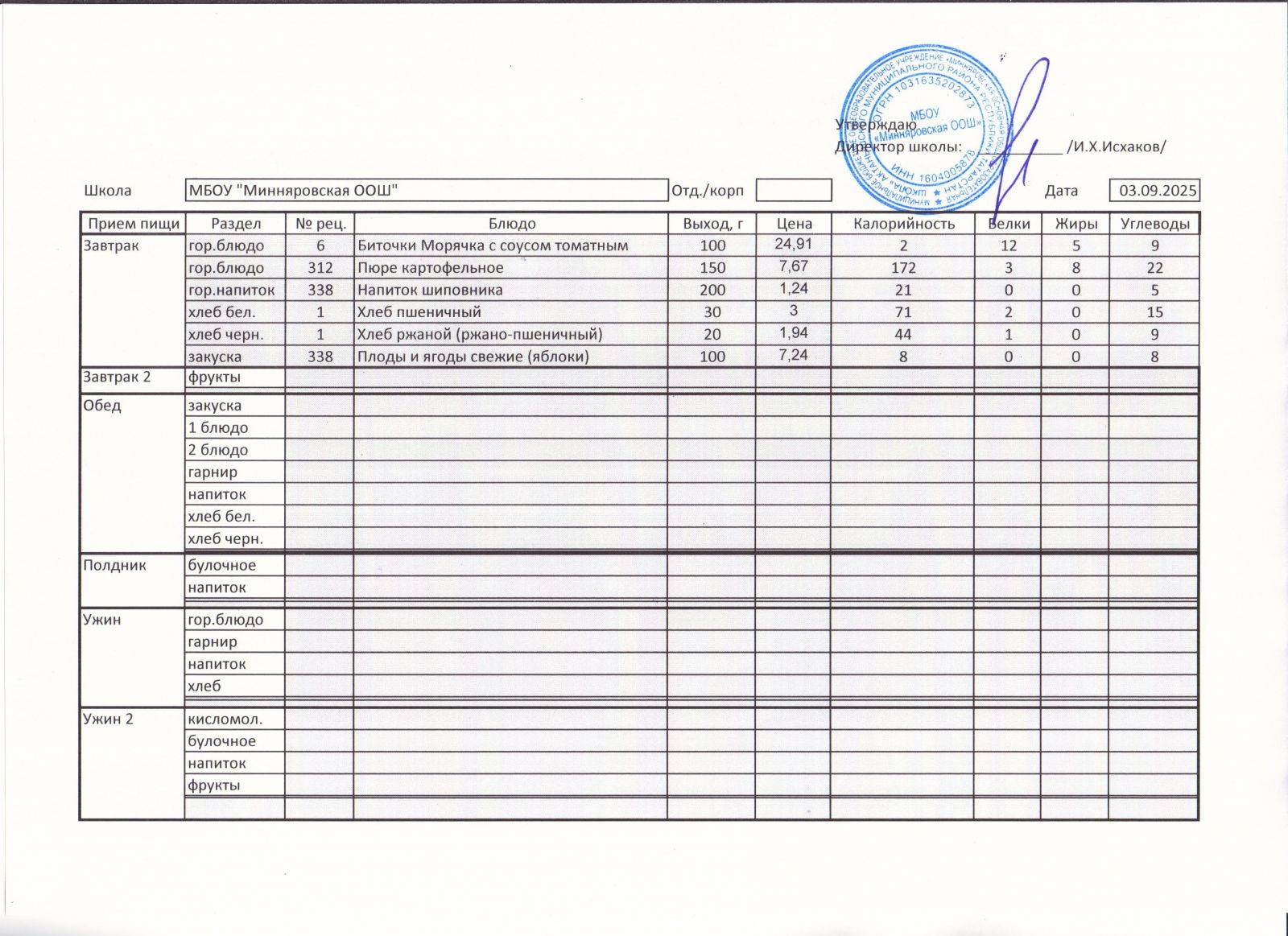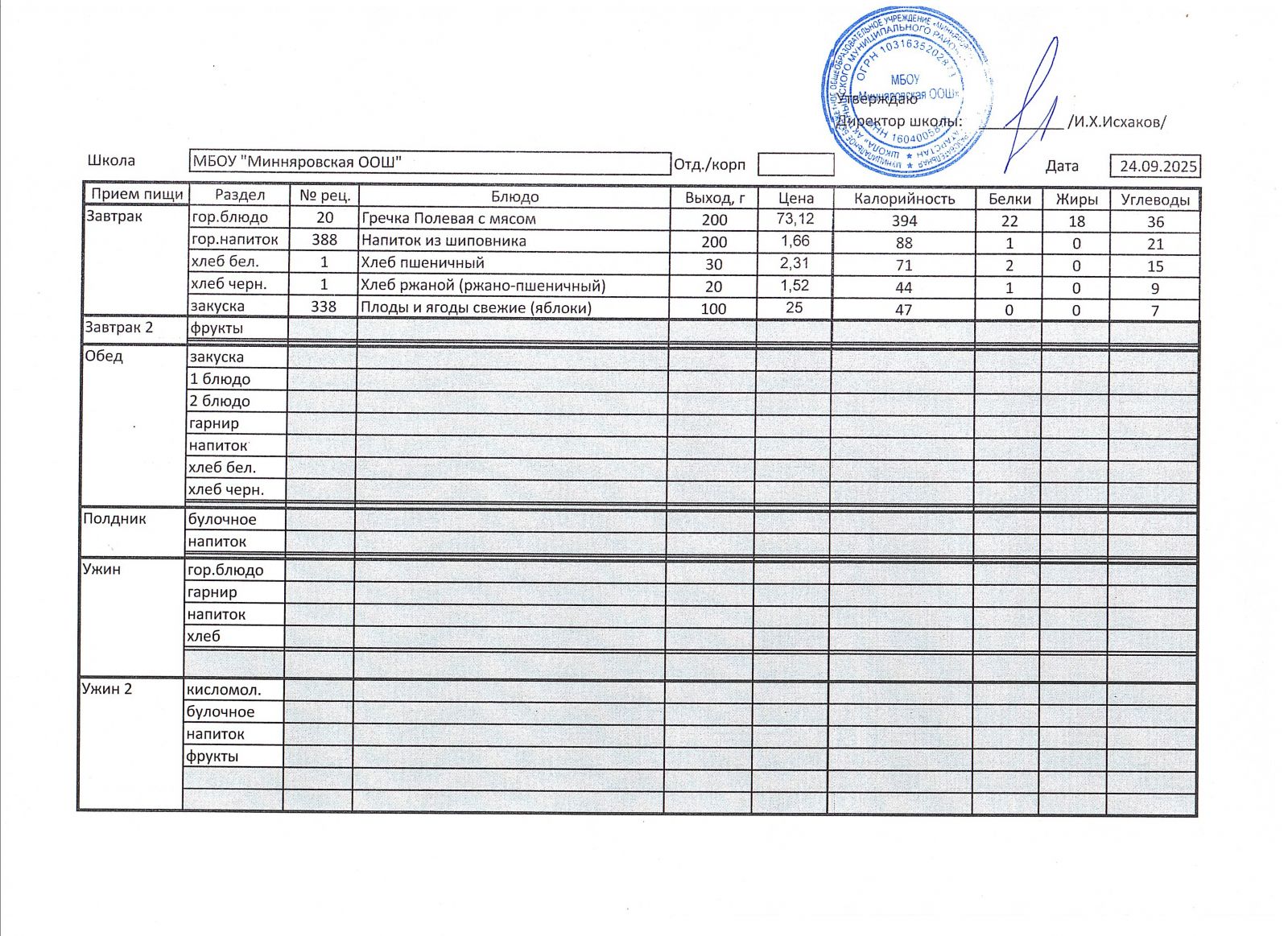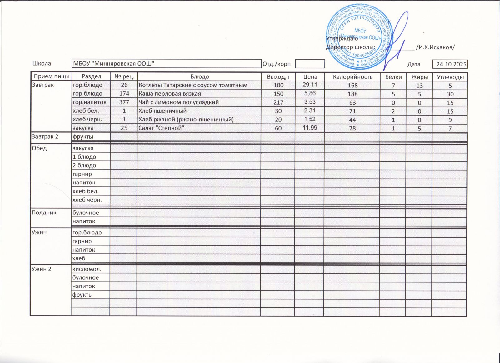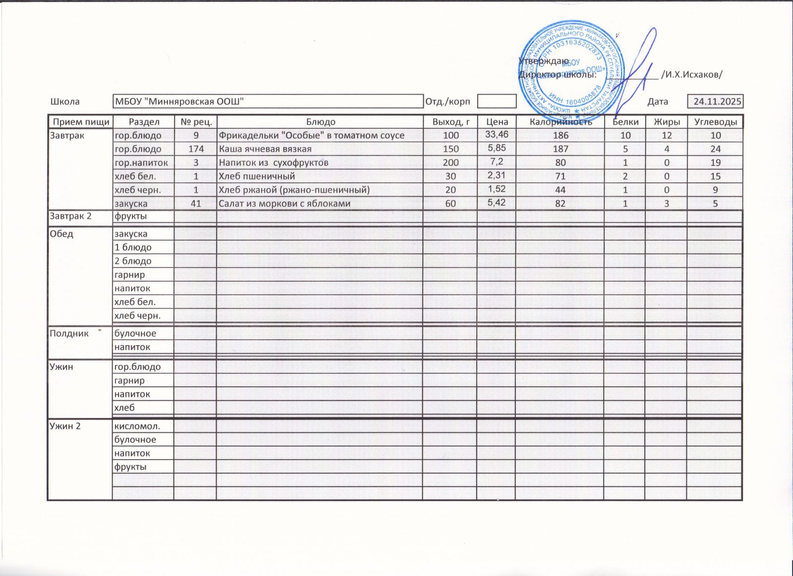 Меню МБОУ "Минняровская ООШ" на 24.11.2020г