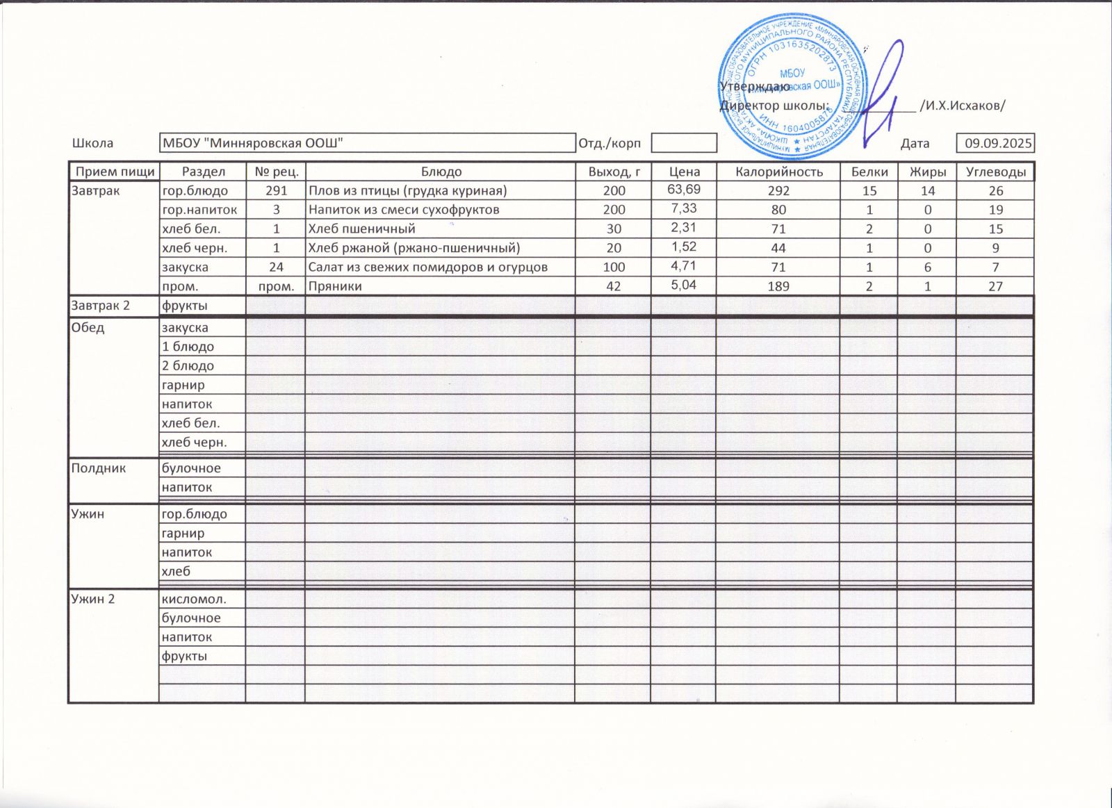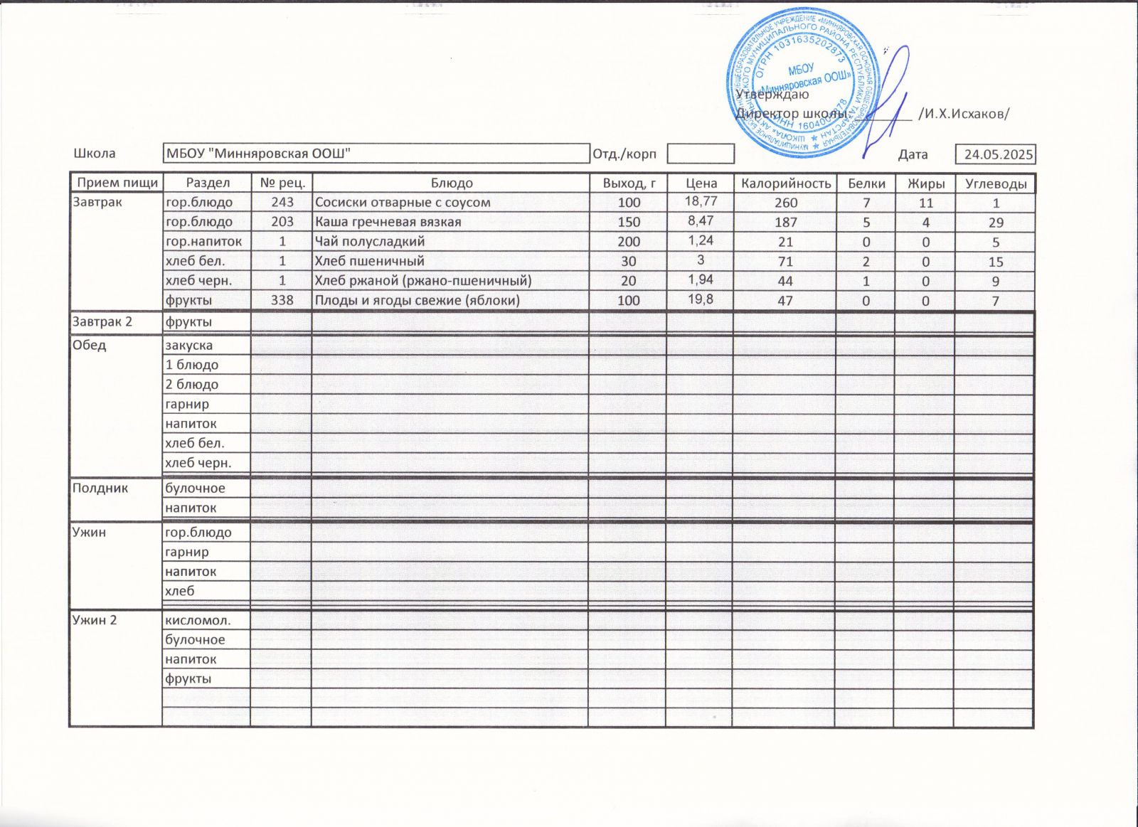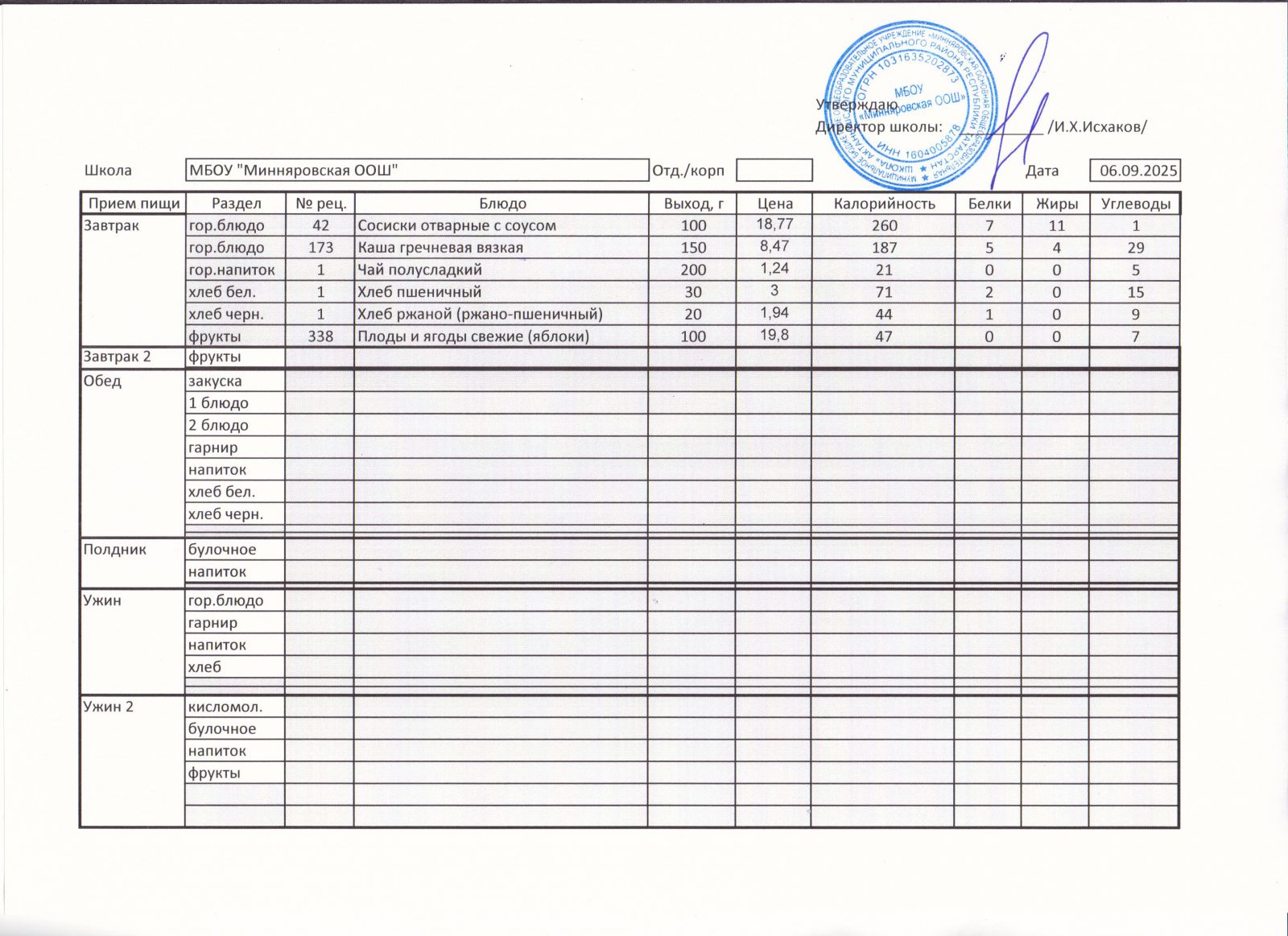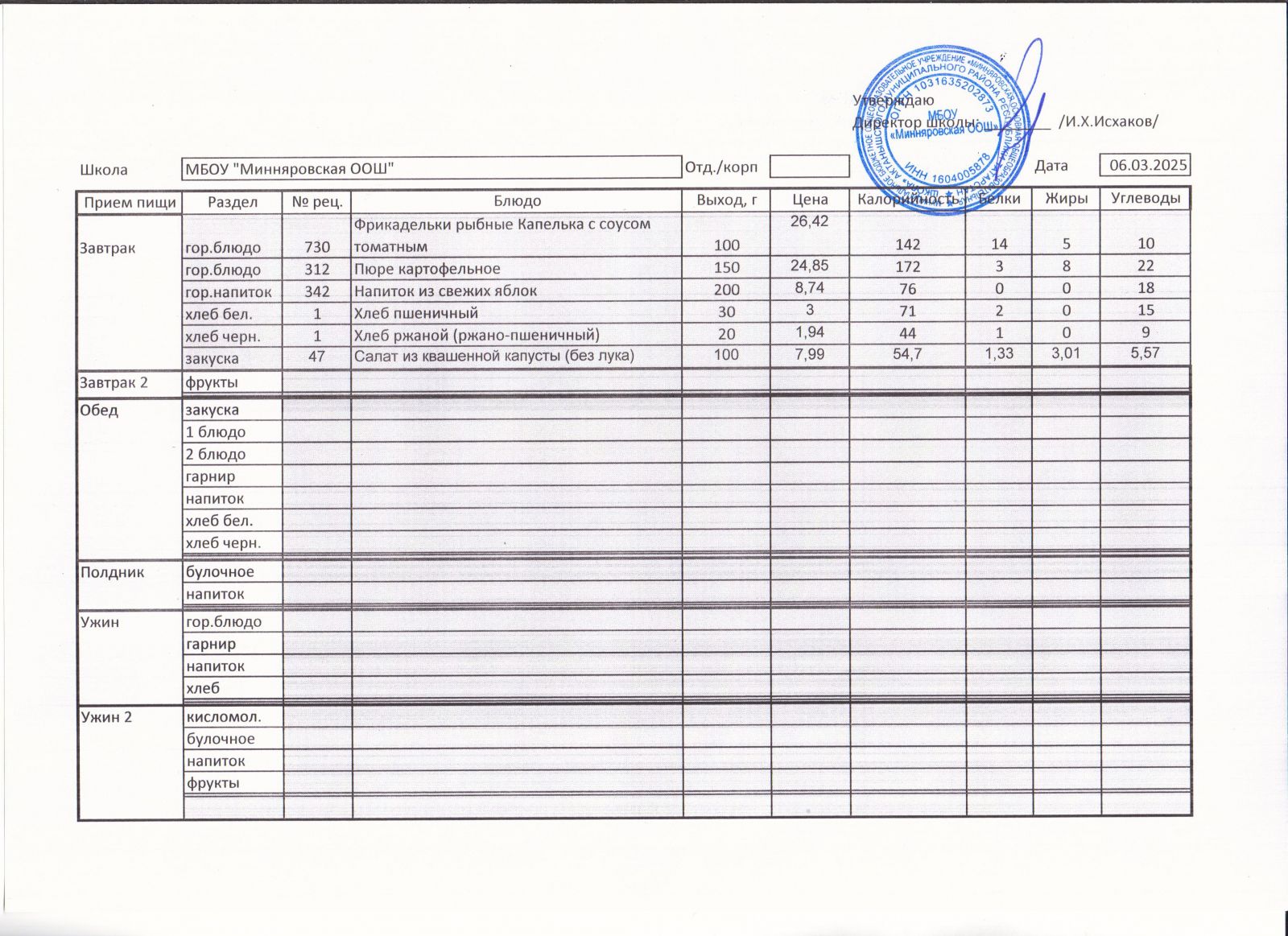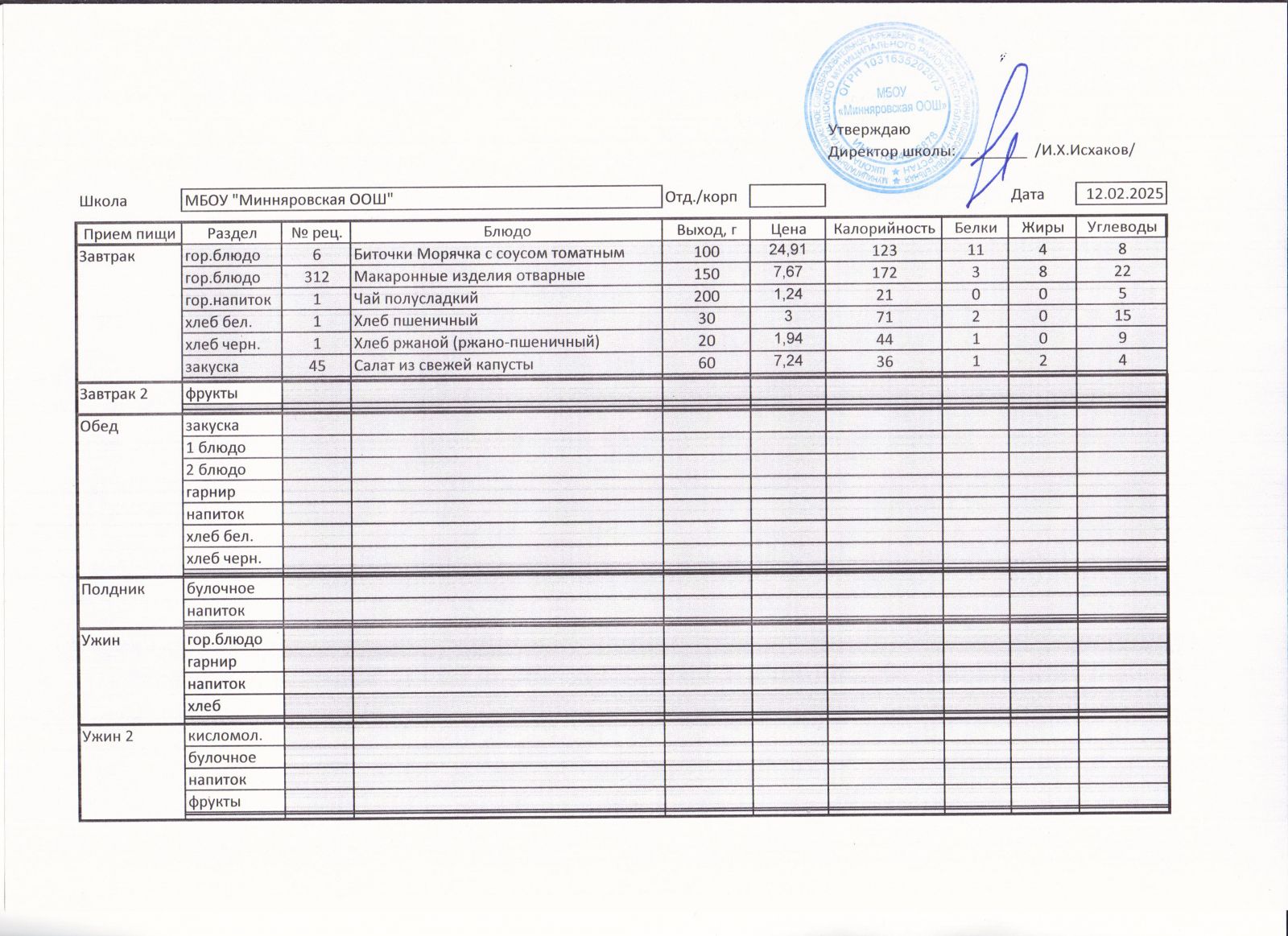 Меню МБОУ "Минняровская ООШ" на 24.11.2020г