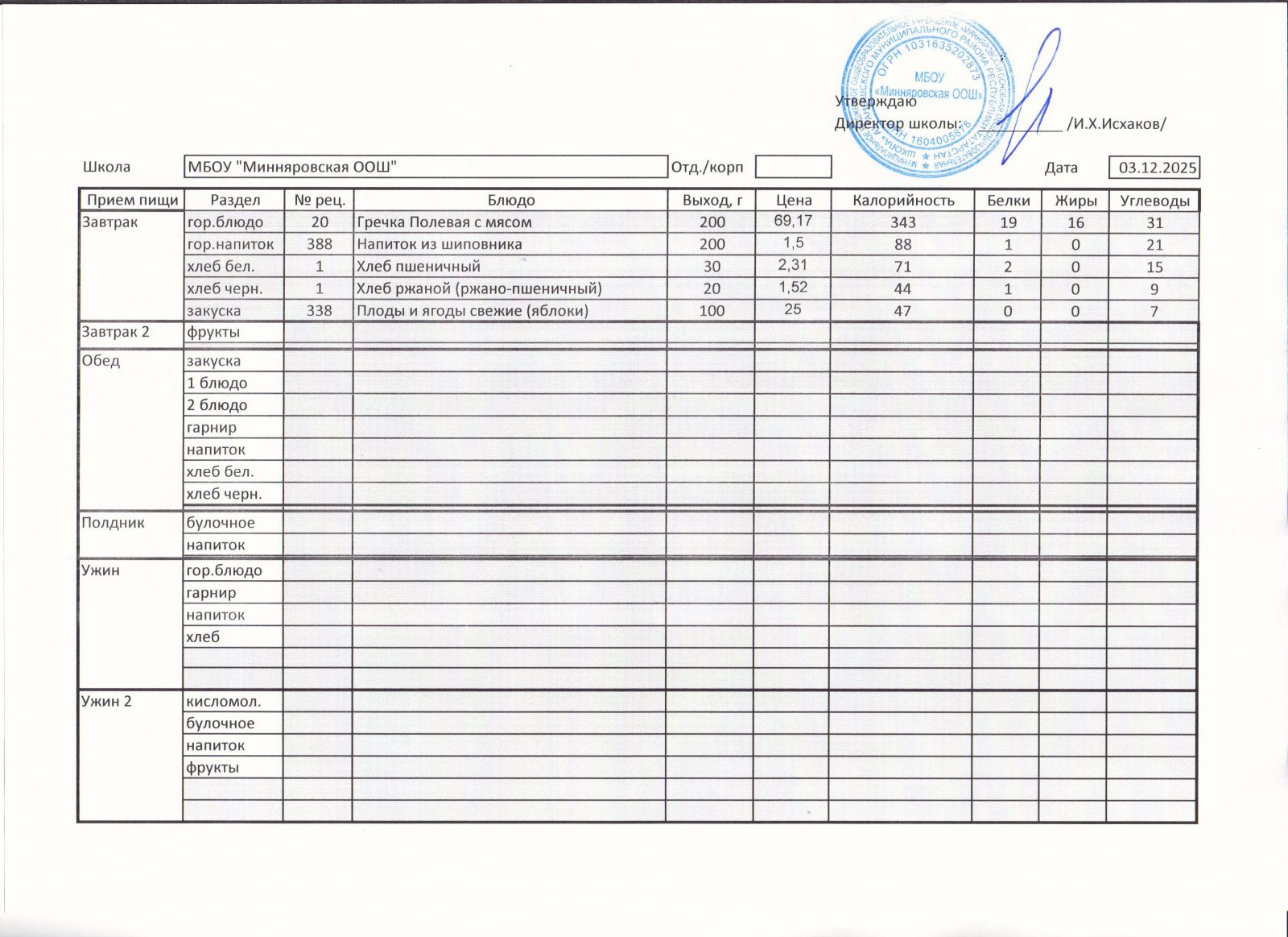 Меню МБОУ "Минняровская ООШ" на 3.12.2020