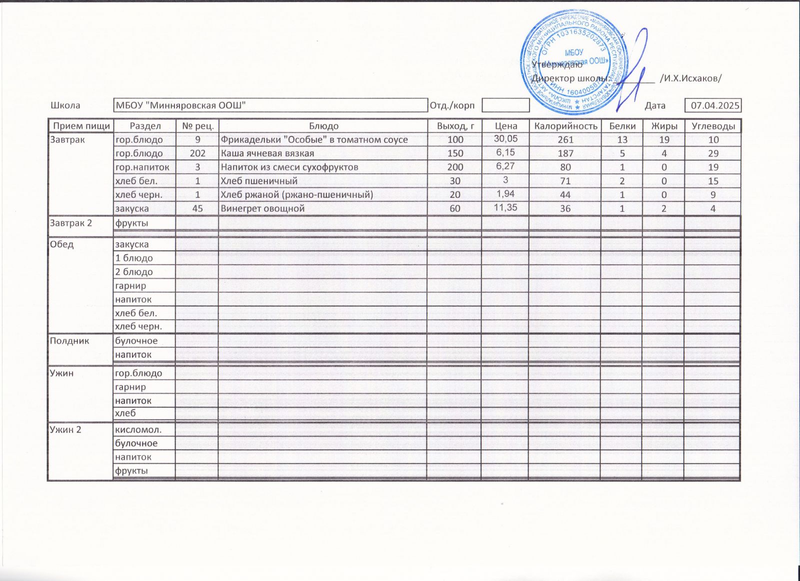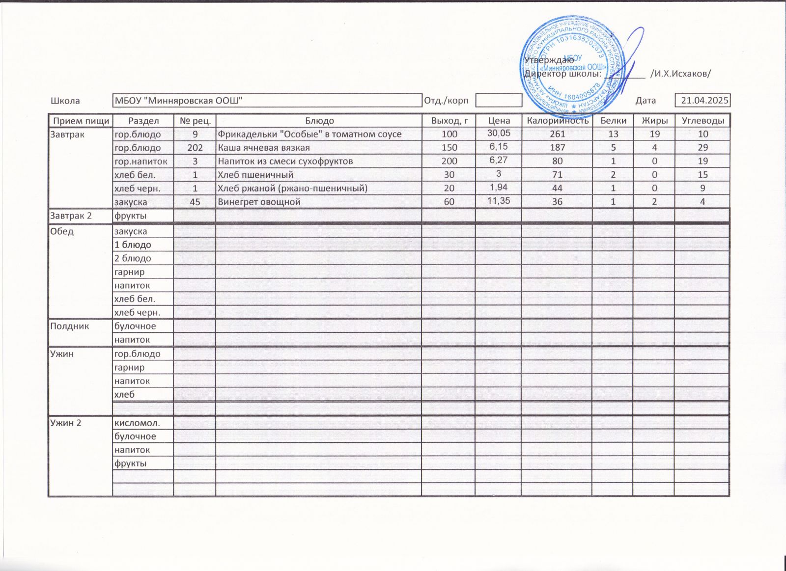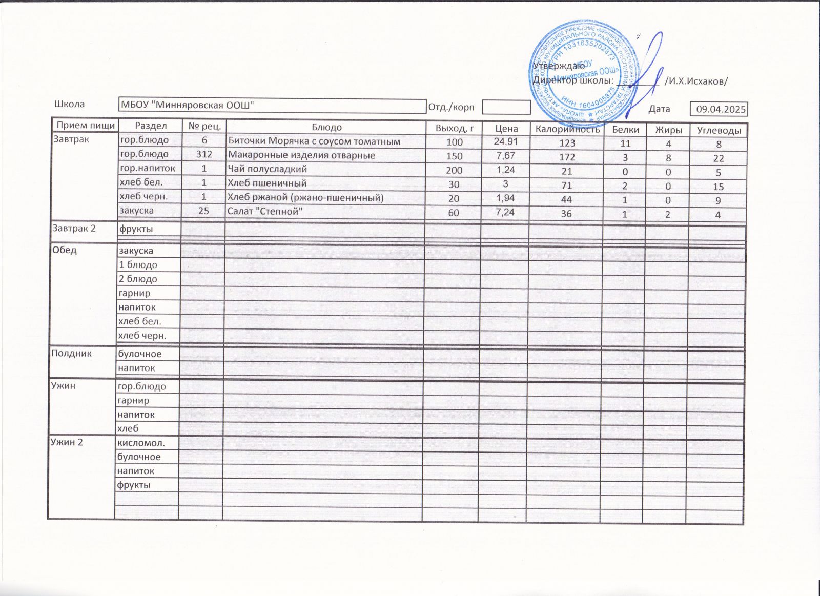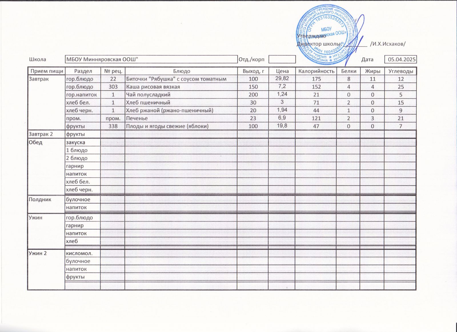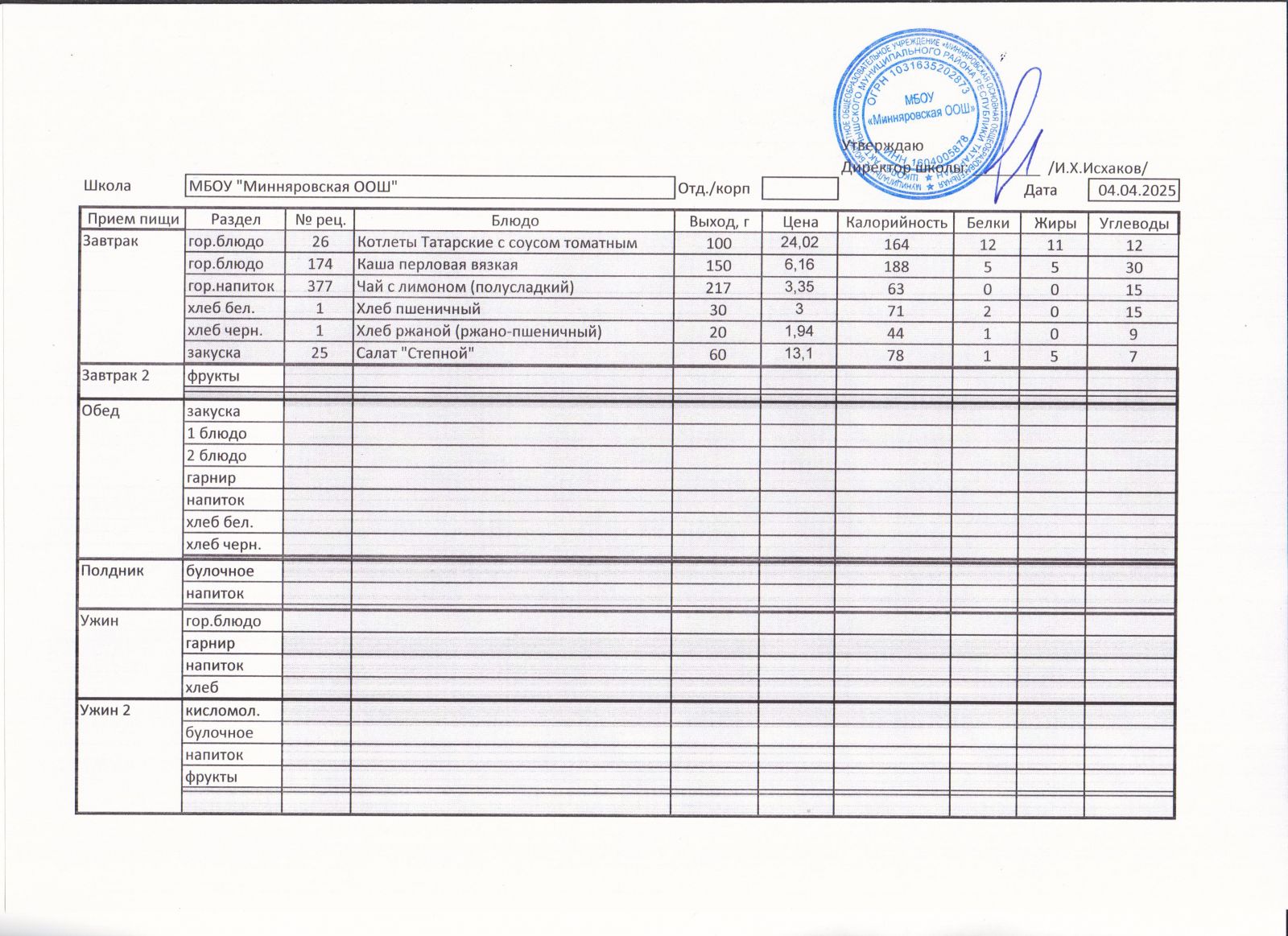 Меню МБОУ "Минняровская ООШ" на 05.04, на 06.04, на 07.04, на 08.04, на 09.04, на 10.04.2021 г.