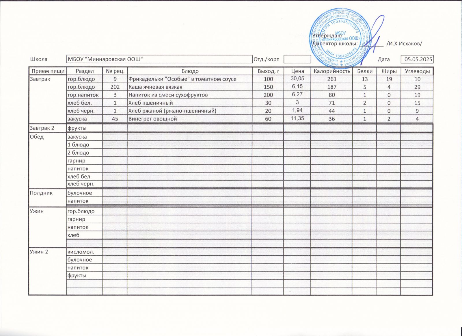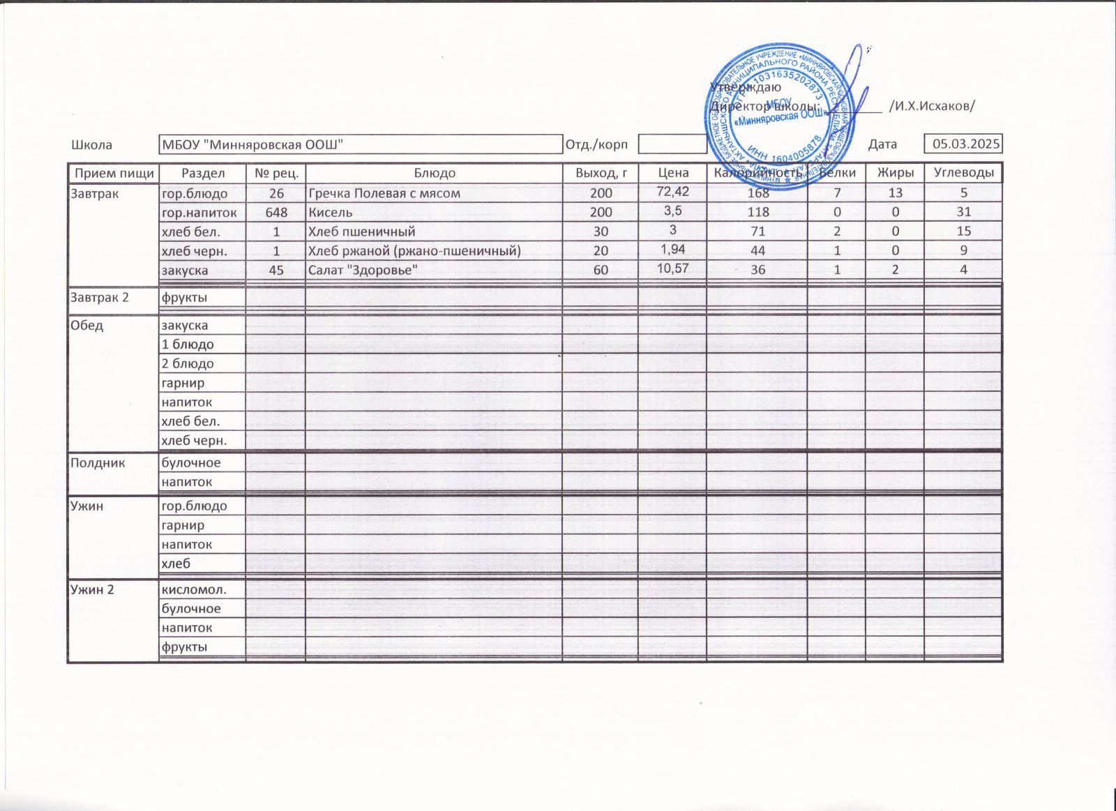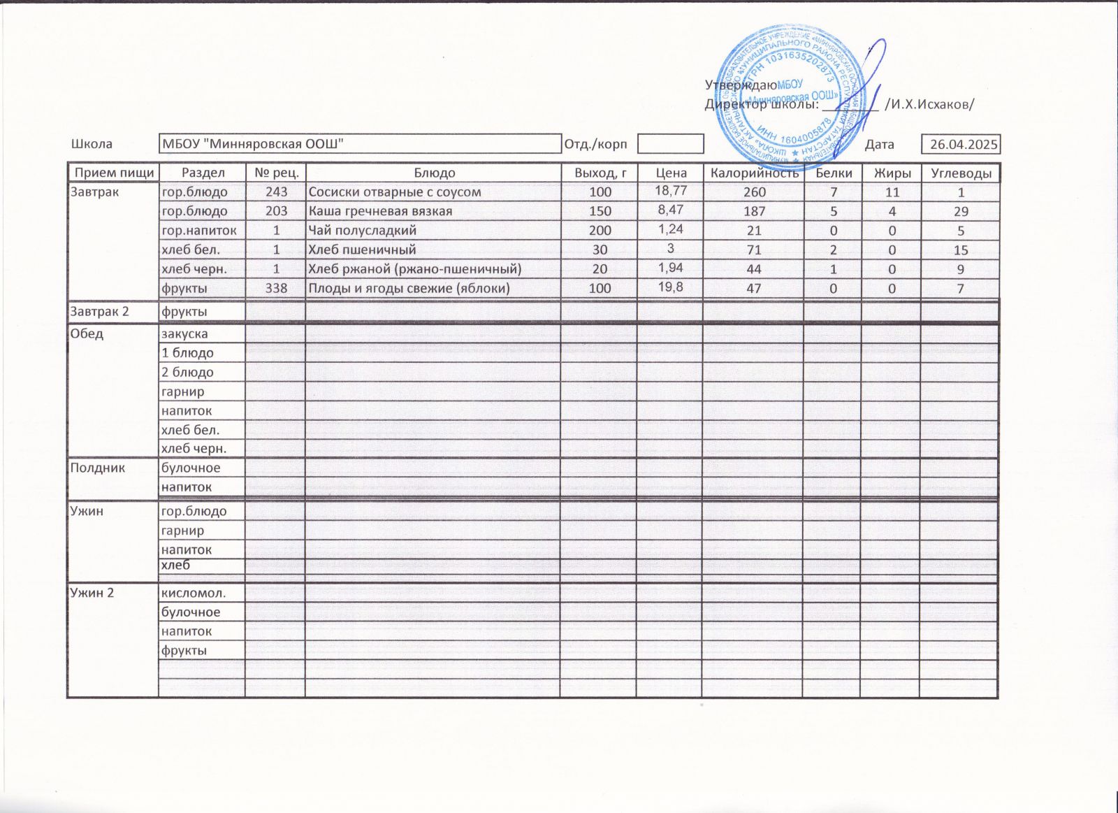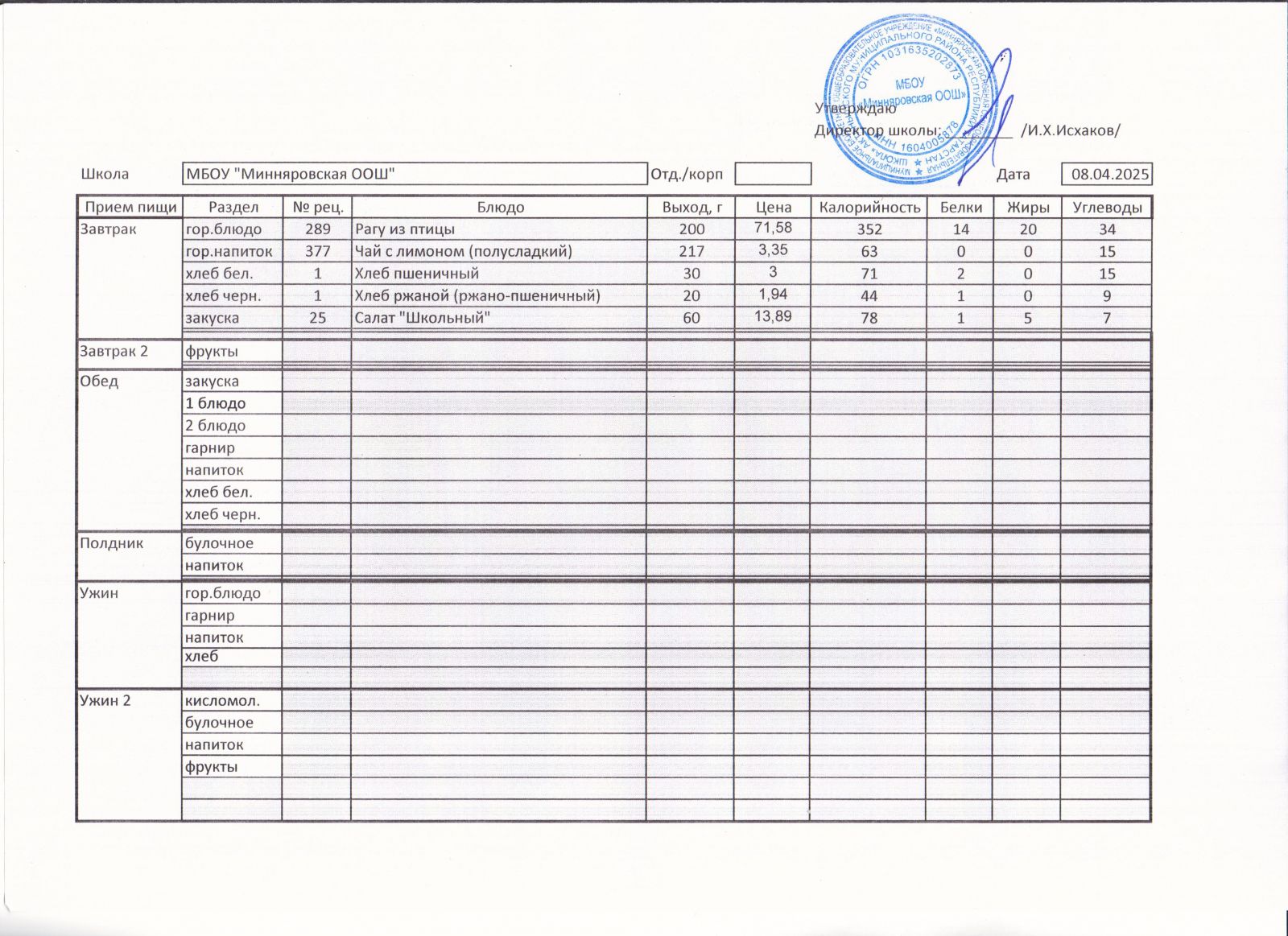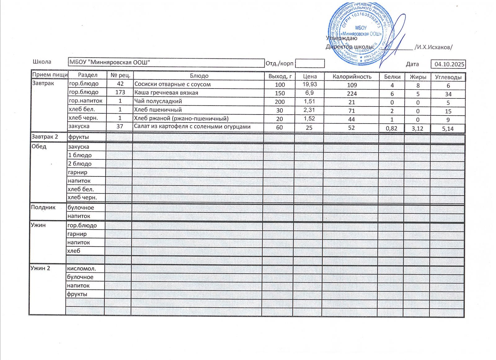 Меню МБОУ "Минняровская ООШ" на 05.04, на 06.04, на 07.04, на 08.04, на 09.04, на 10.04.2021 г.