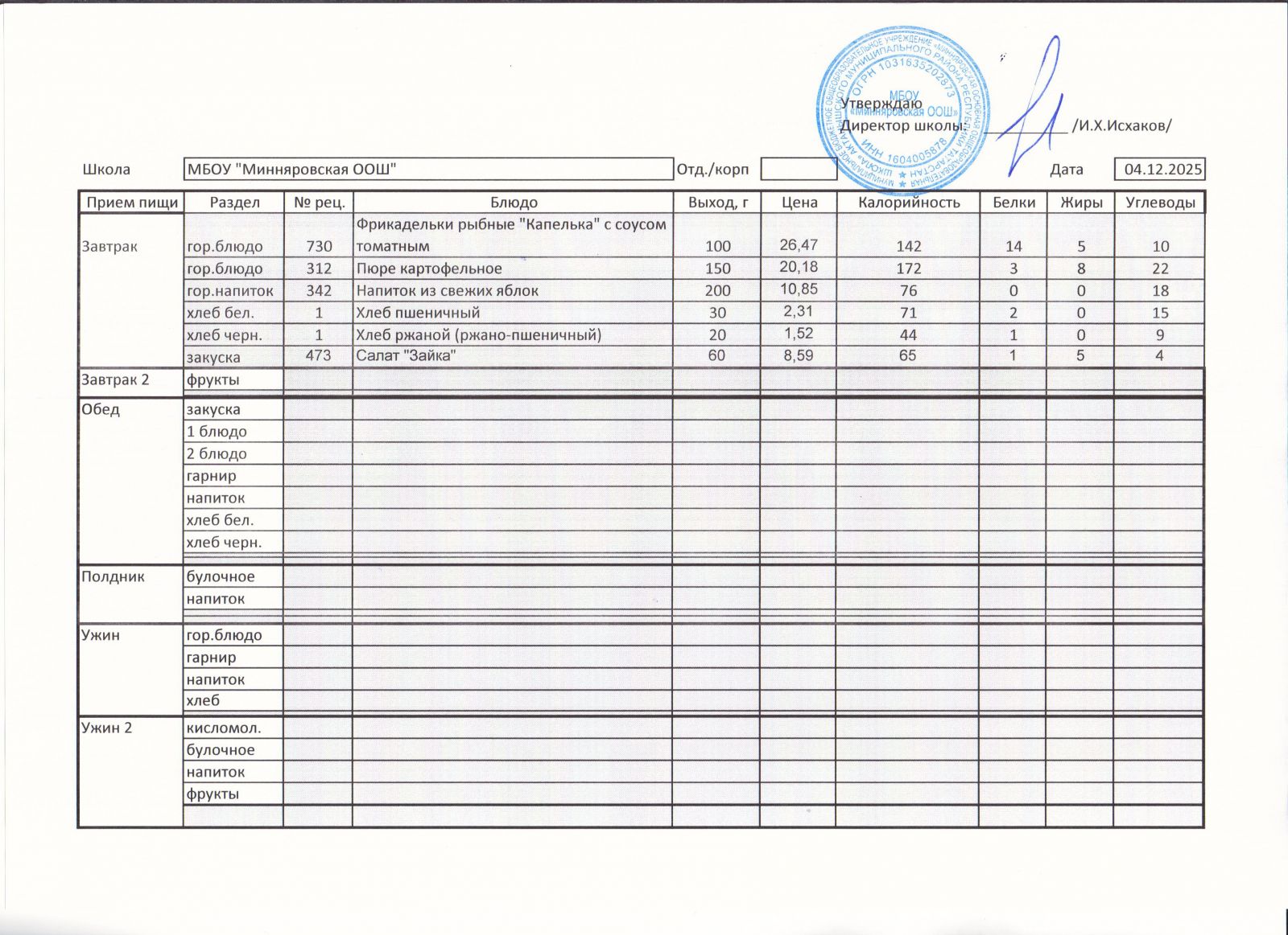 Меню МБОУ "Минняровская ООШ" на 4.12.2020