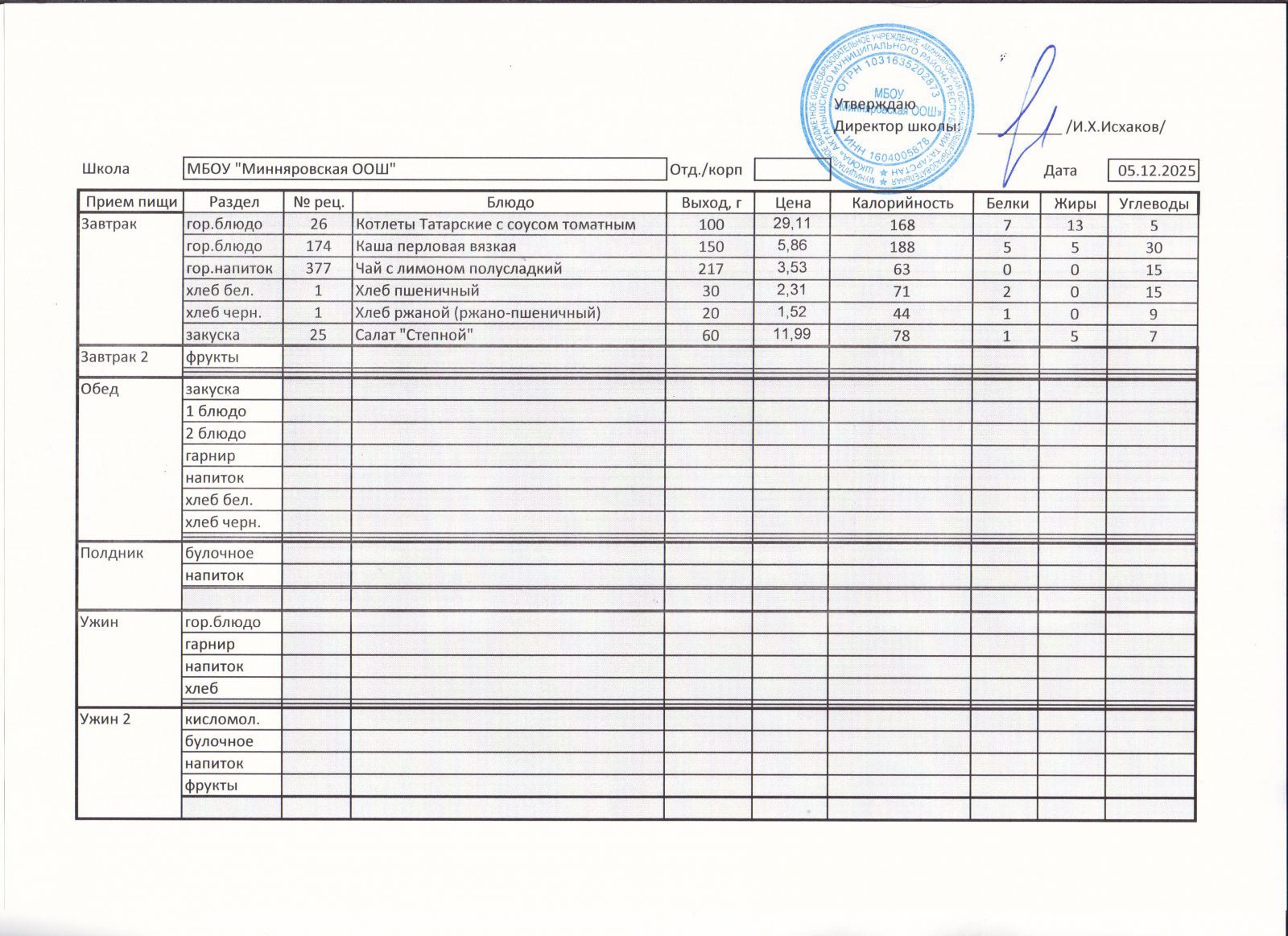 Меню МБОУ "Минняровская ООШ" на 5.12.2020