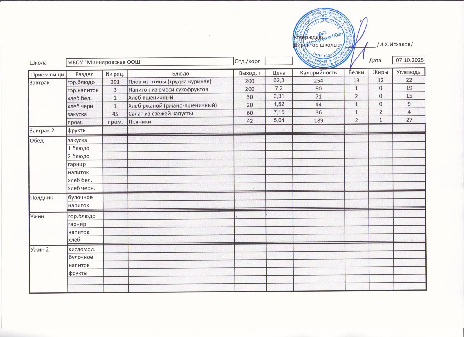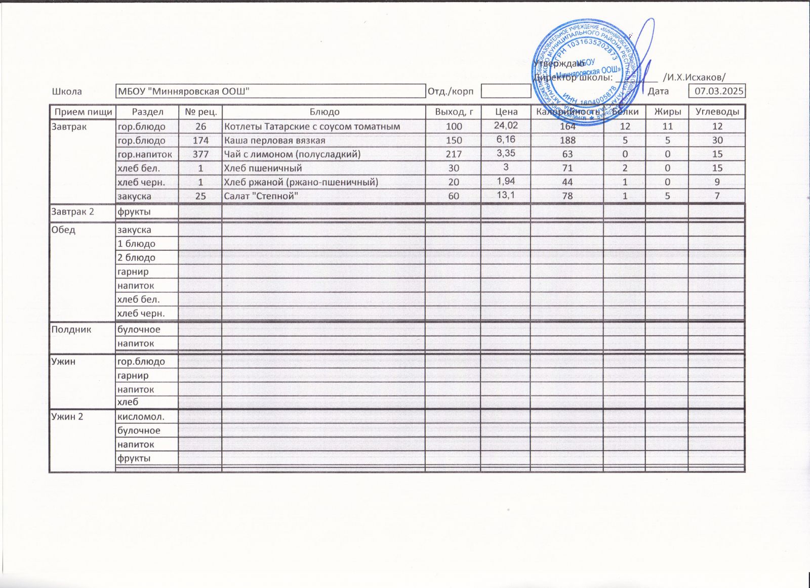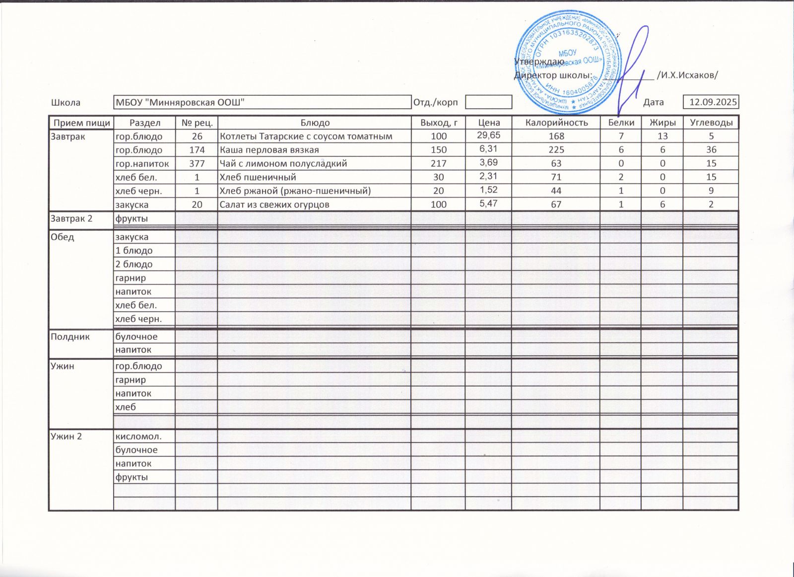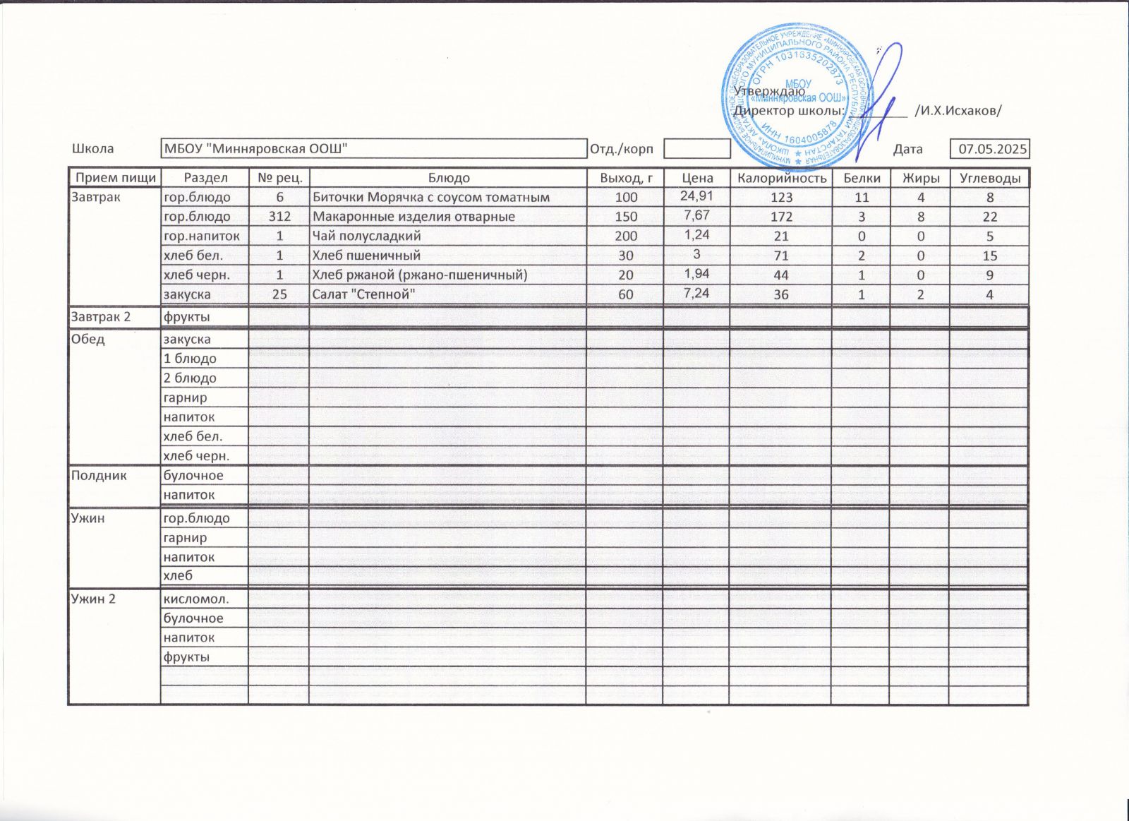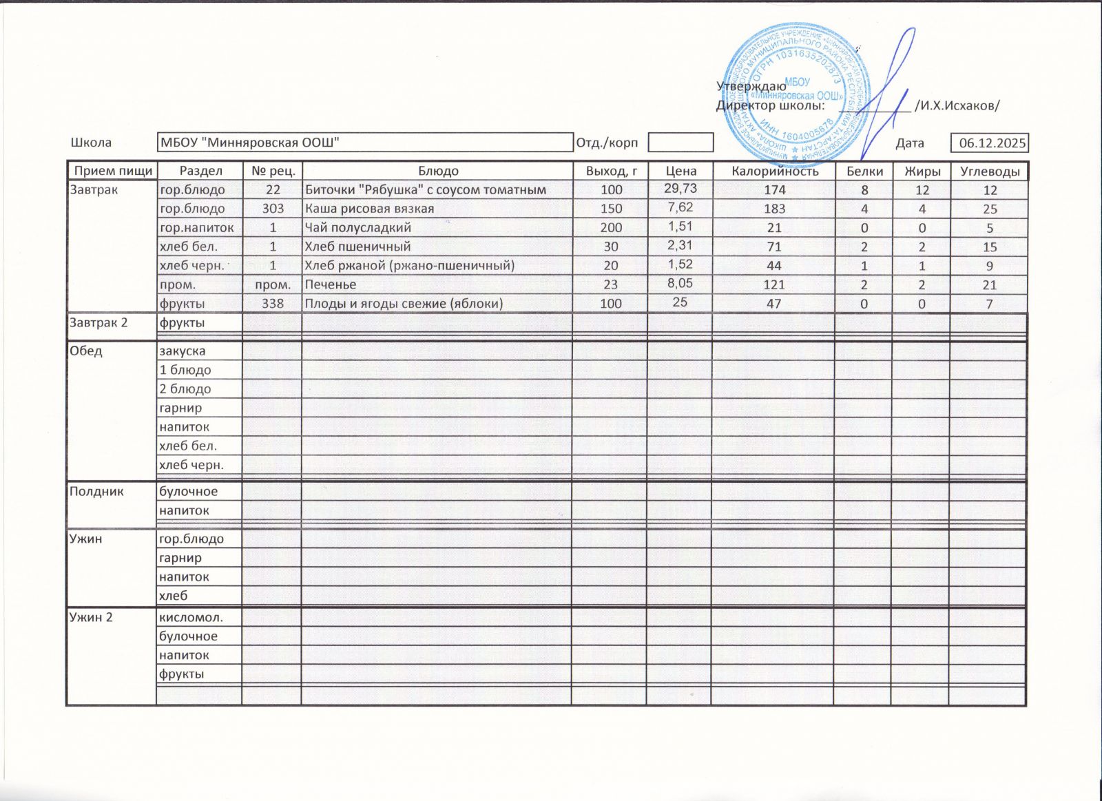 Меню МБОУ "Минняровская ООШ" на 7.12.2020