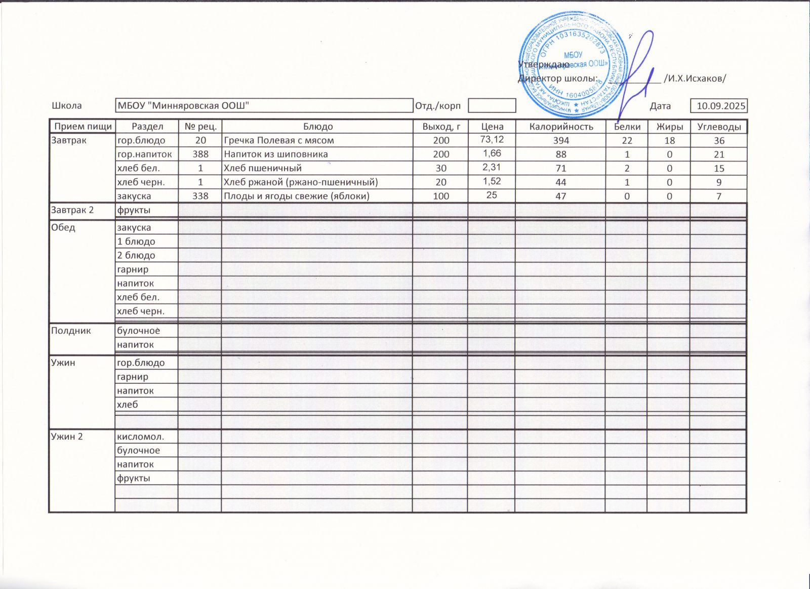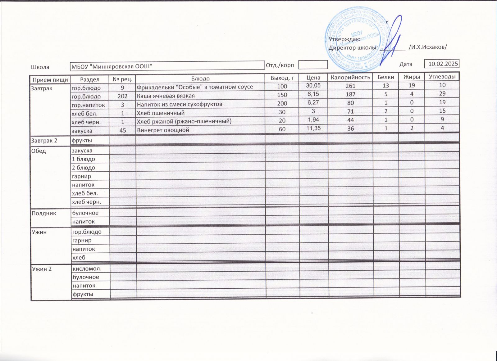 Меню МБОУ "Минняровская ООШ" на 10.12.2020