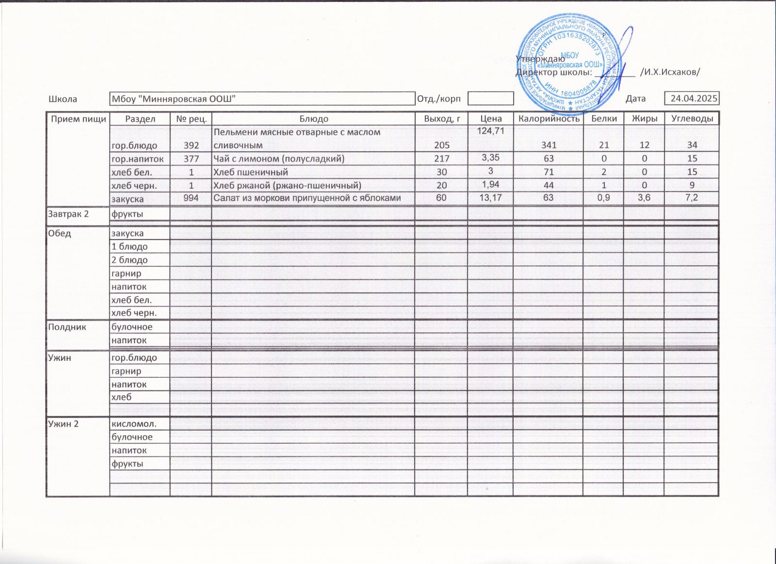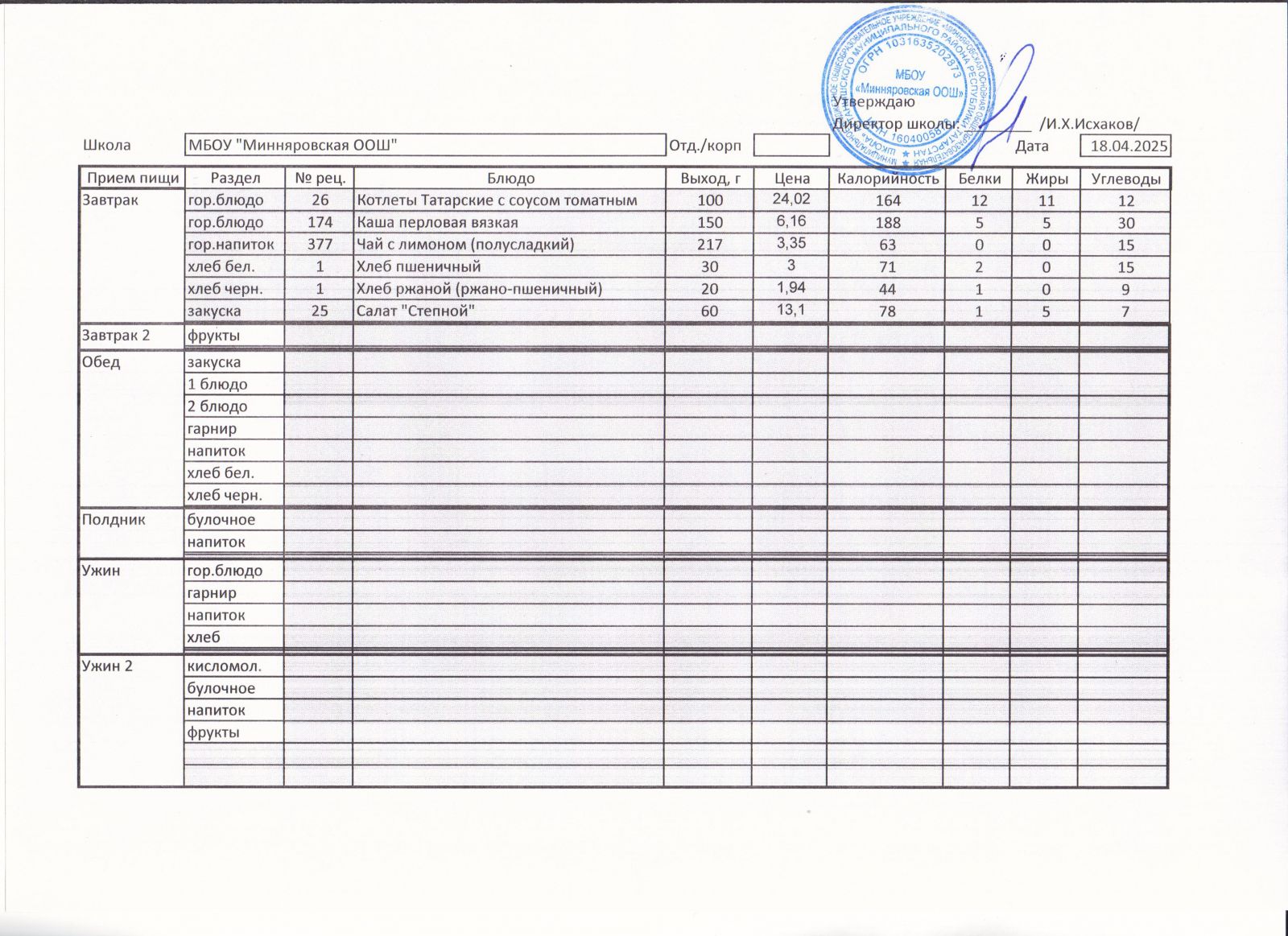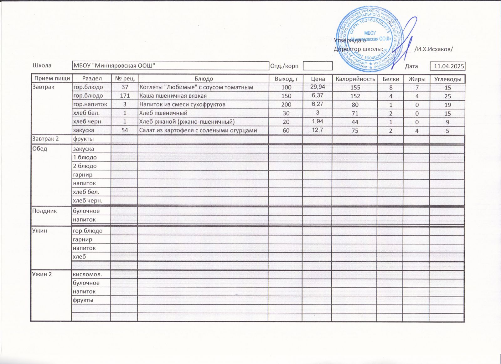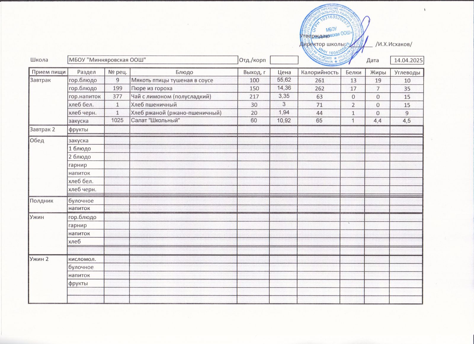Меню МБОУ "Минняровская ООШ" на 12.04, на 13.04, на 14.04, на15.04, на 16.04, на 17.04 2021г.