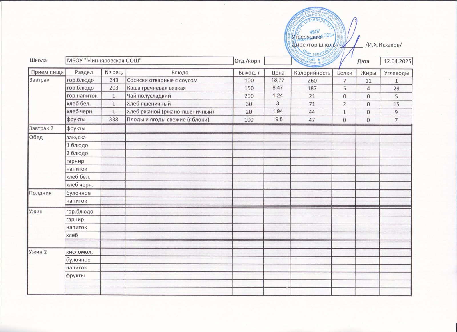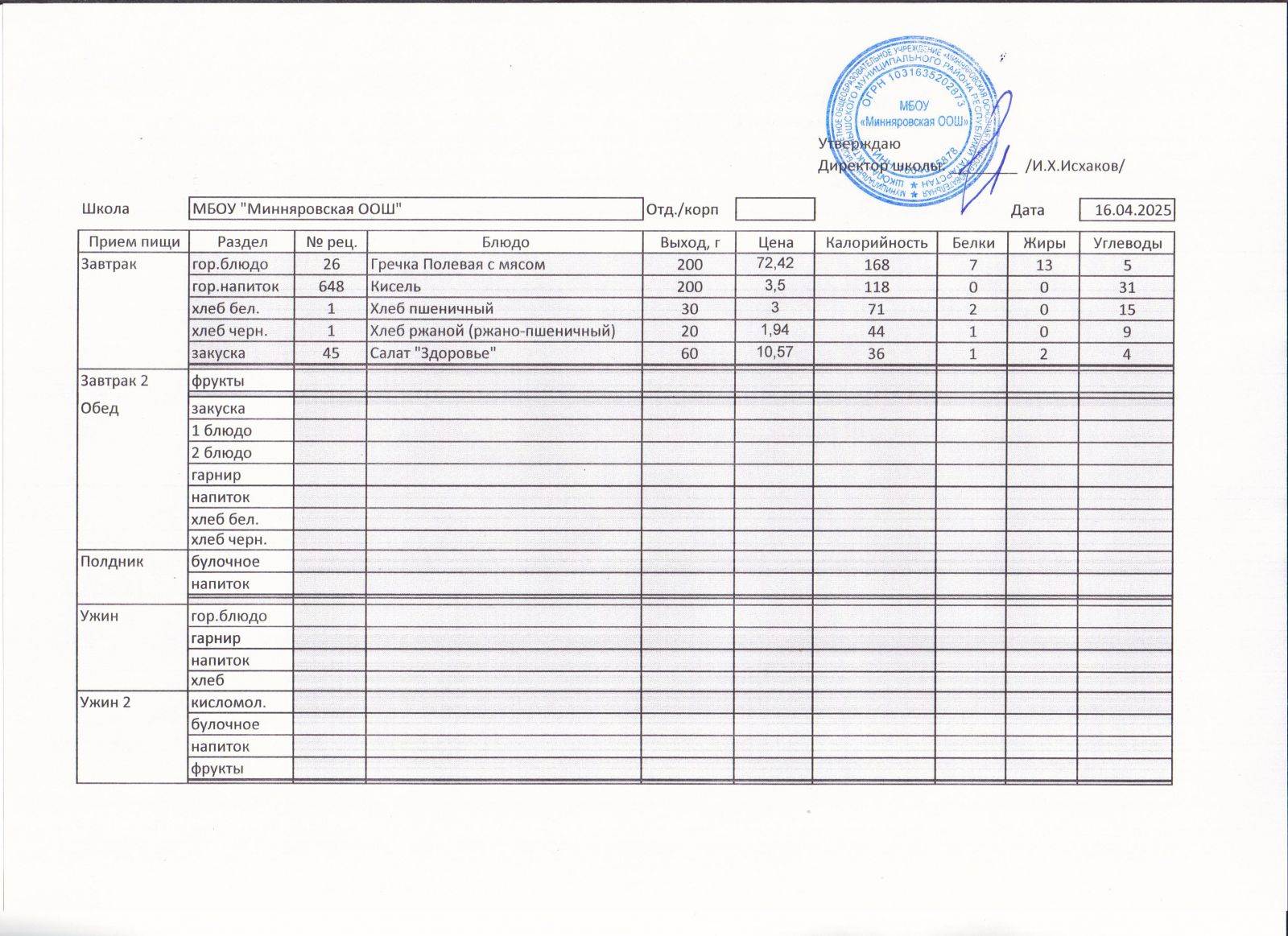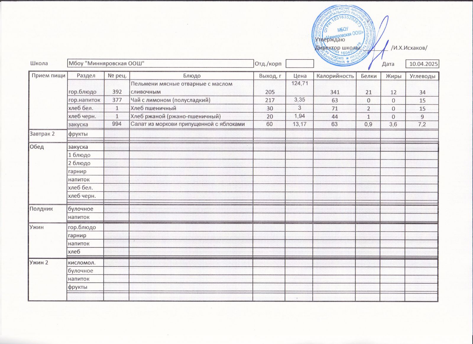 Меню МБОУ "Минняровская ООШ" на 12.04, на 13.04, на 14.04, на15.04, на 16.04, на 17.04 2021г.