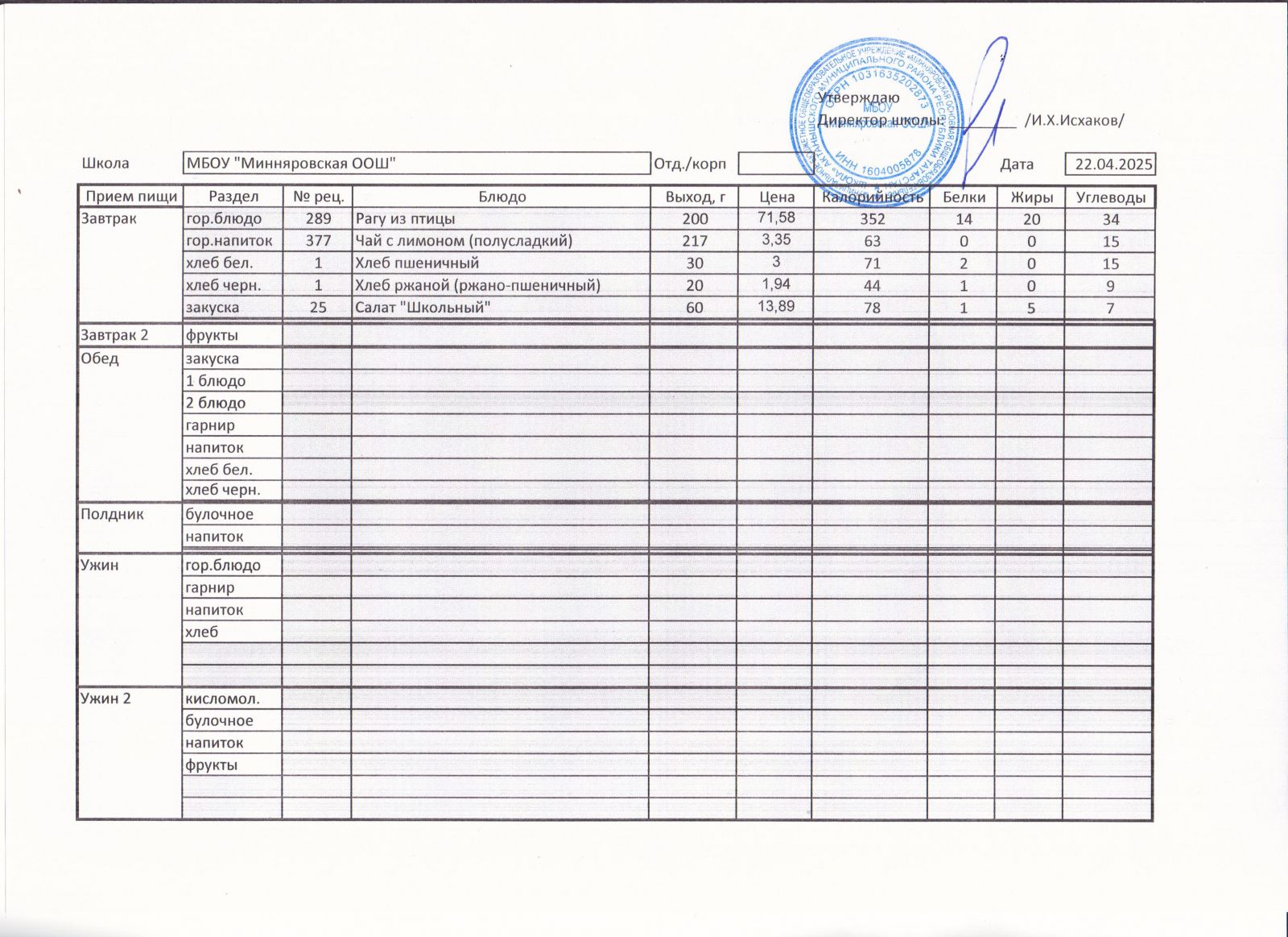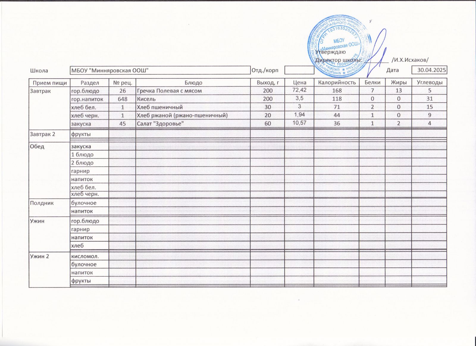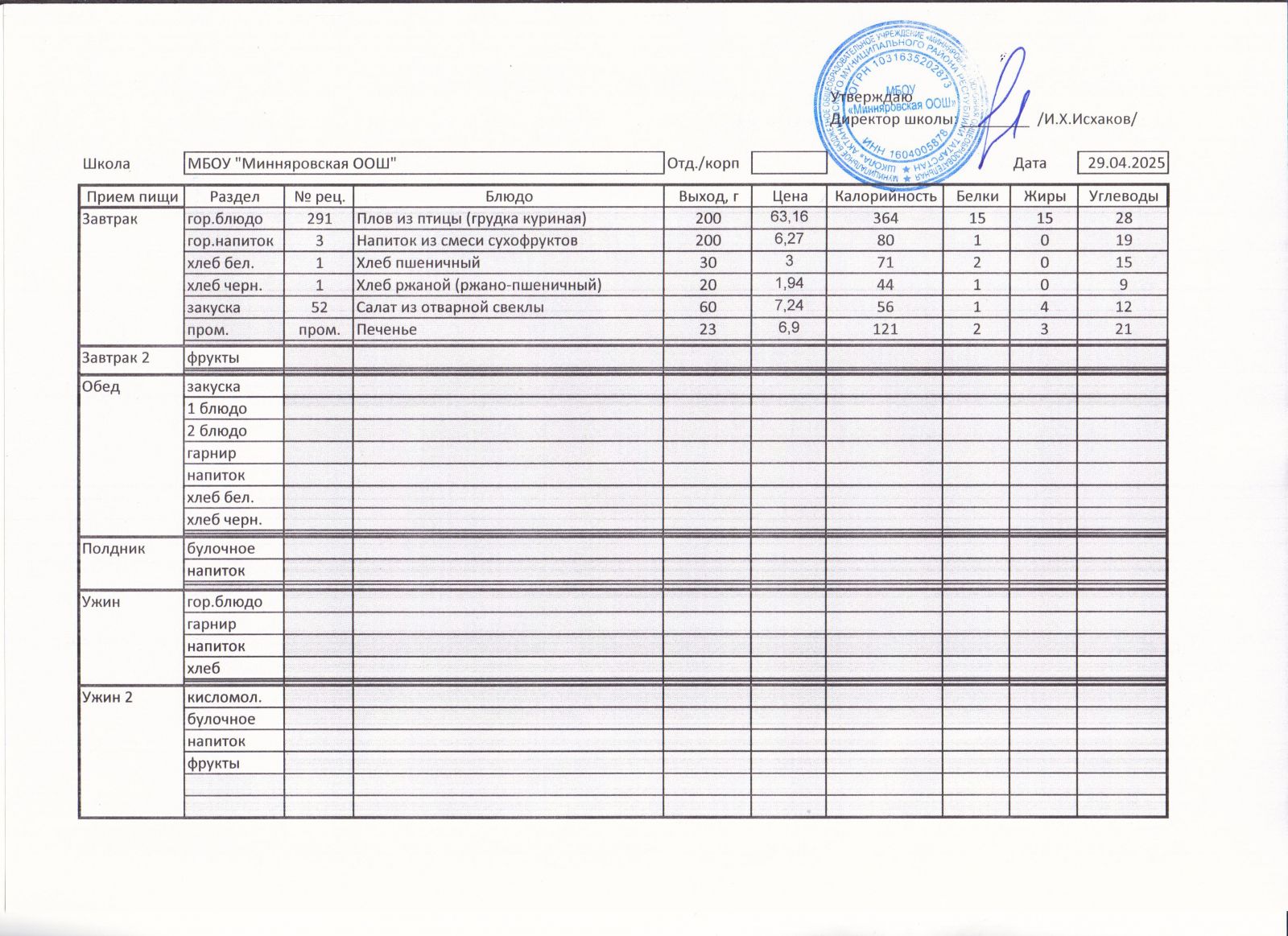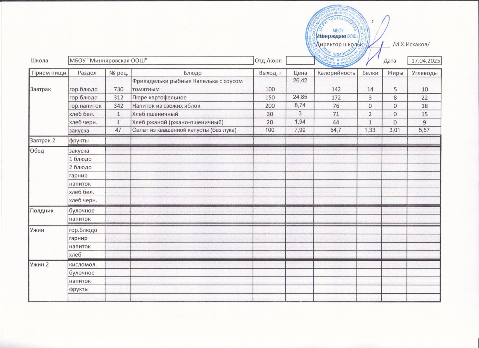 Меню МБОУ "Минняровская ООШ" на 12.04, на 13.04, на 14.04, на15.04, на 16.04, на 17.04 2021г.