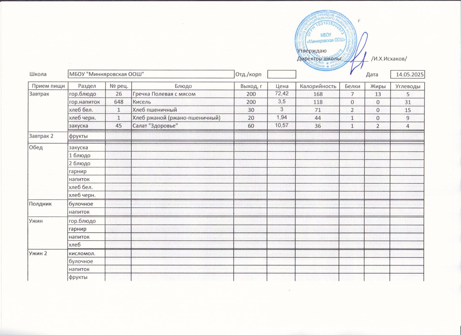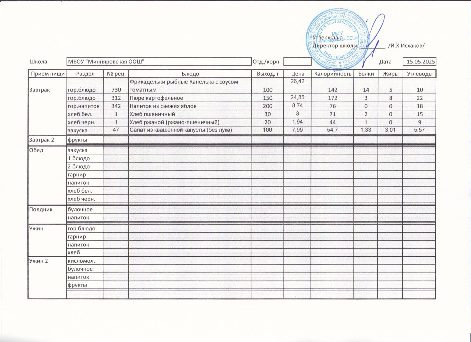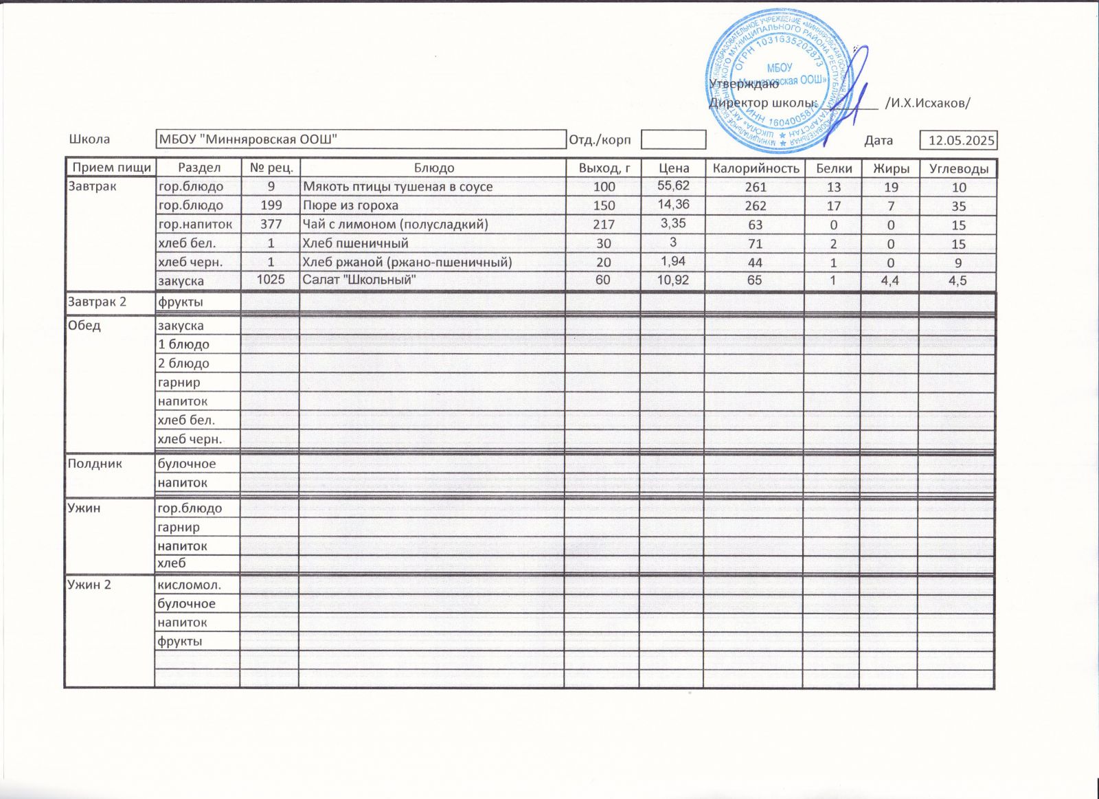 Меню МБОУ "Минняровская ООШ" на 11.05, на 12.05, на 14.05, 15.05.2021 г.