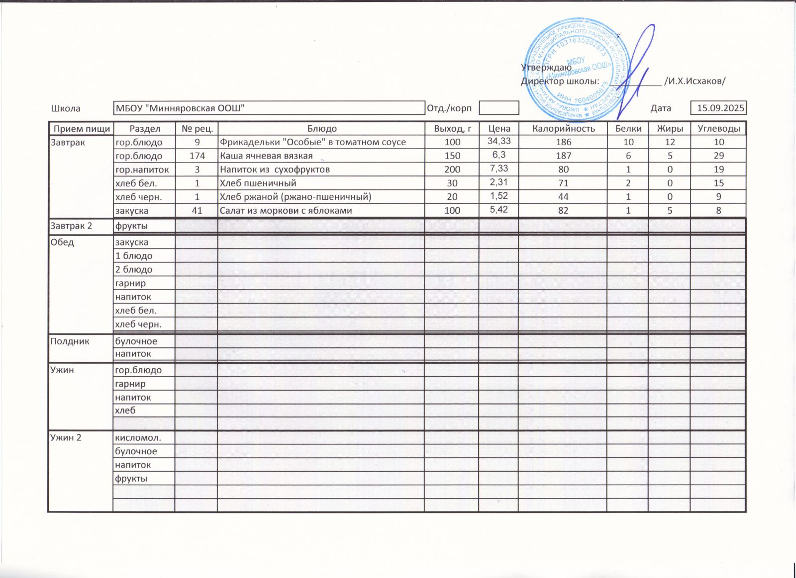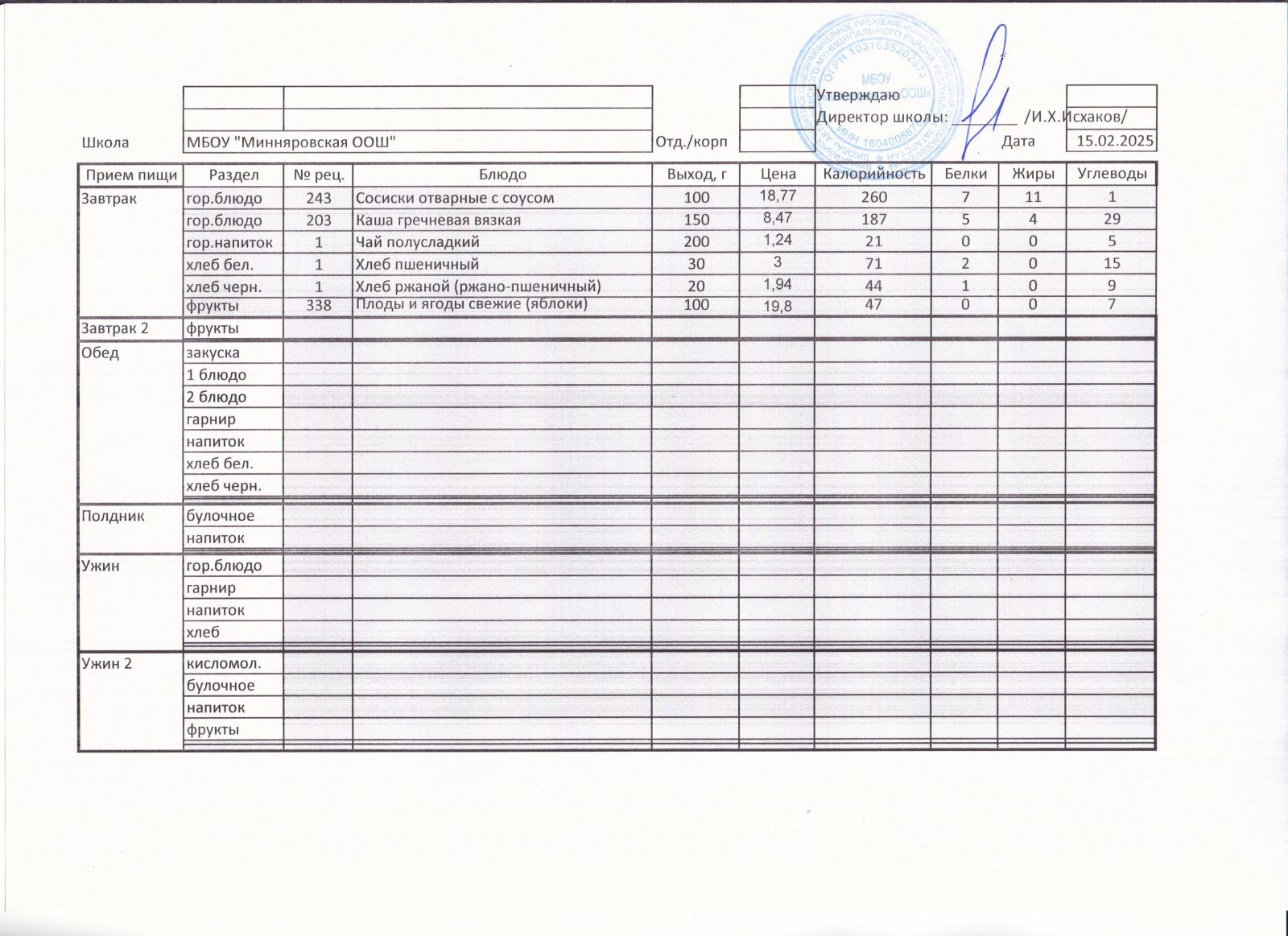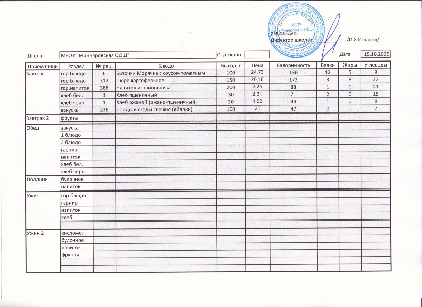 Меню МБОУ "Минняровская ООШ" на 15.12.2020