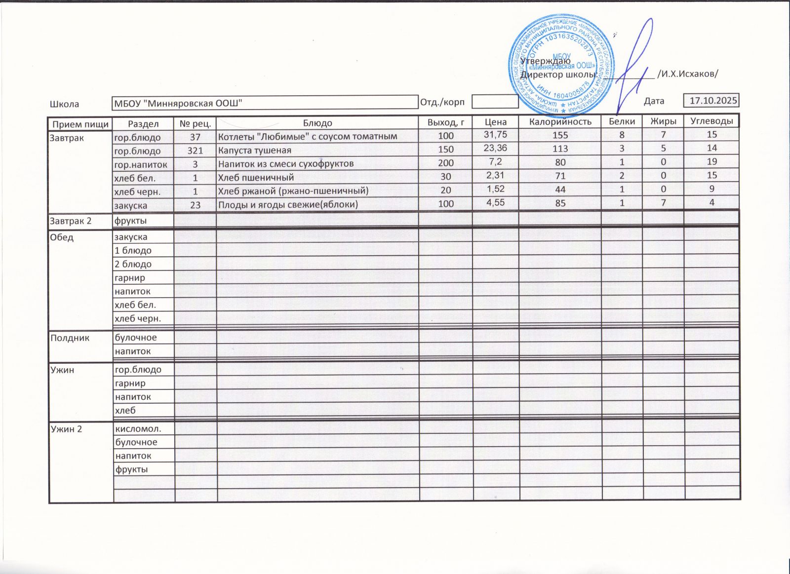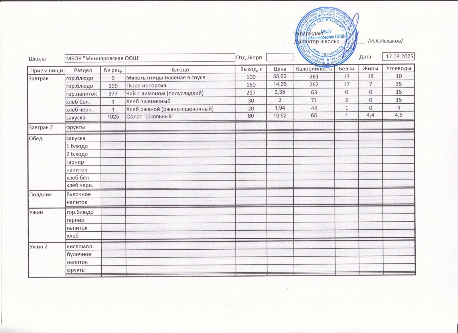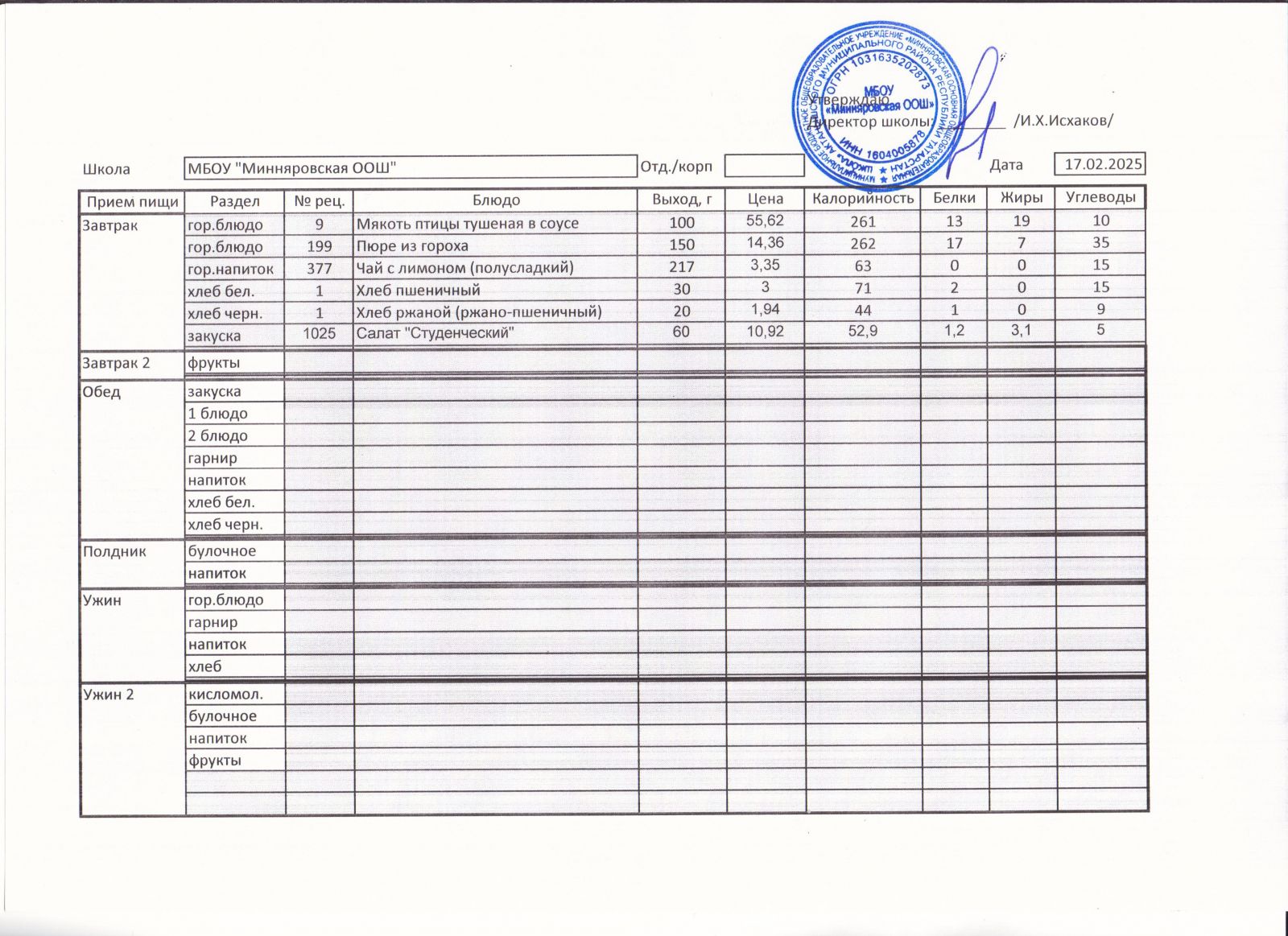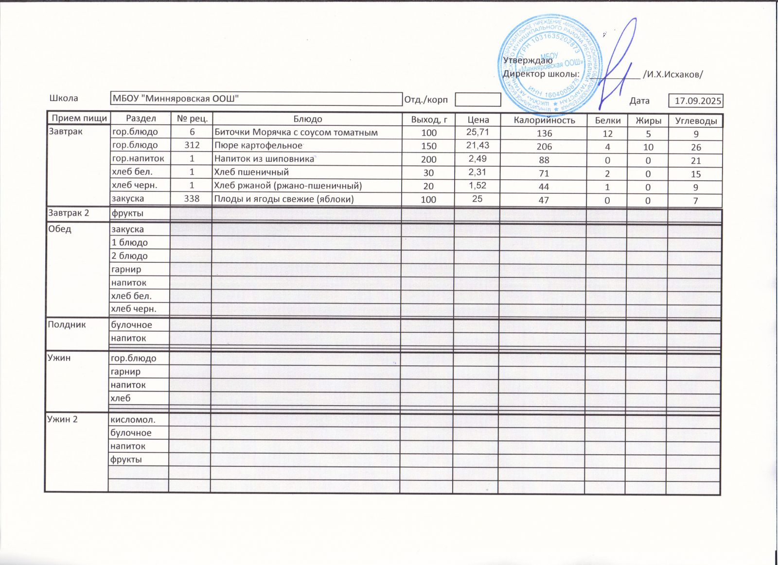 Меню МБОУ "Минняровская ООШ" на 17.12.2020