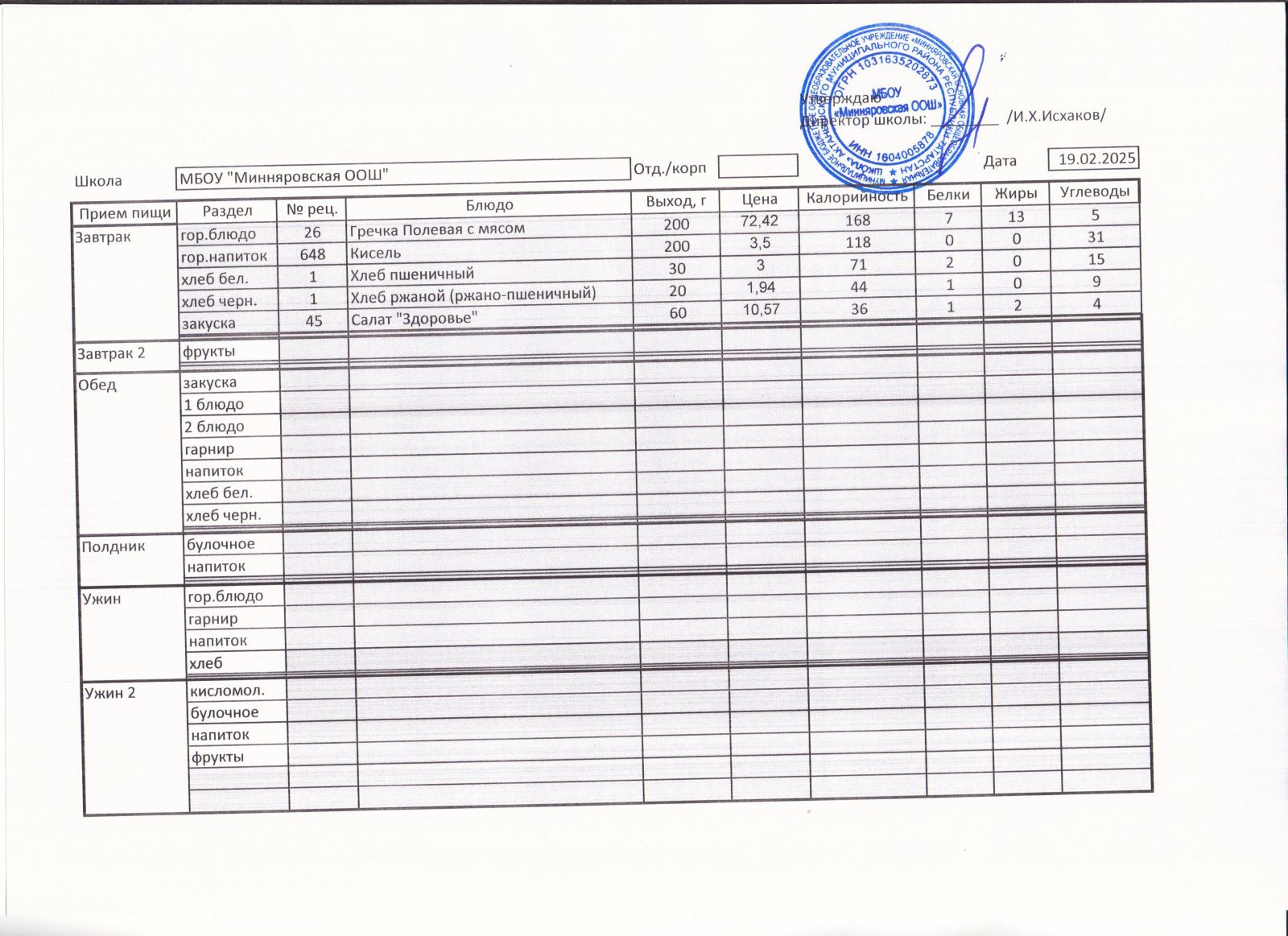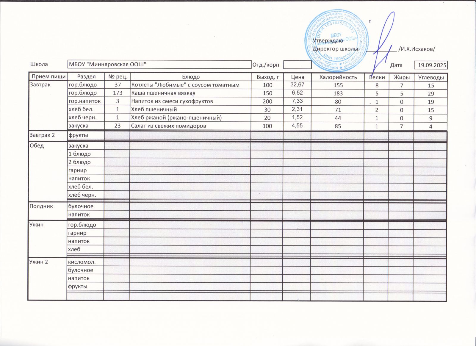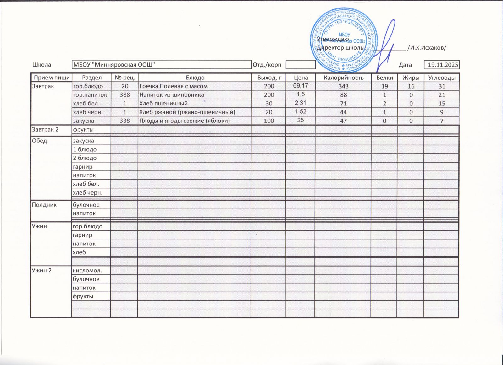 Меню МБОУ "Минняровская ООШ" на 19 ноября 2020 года