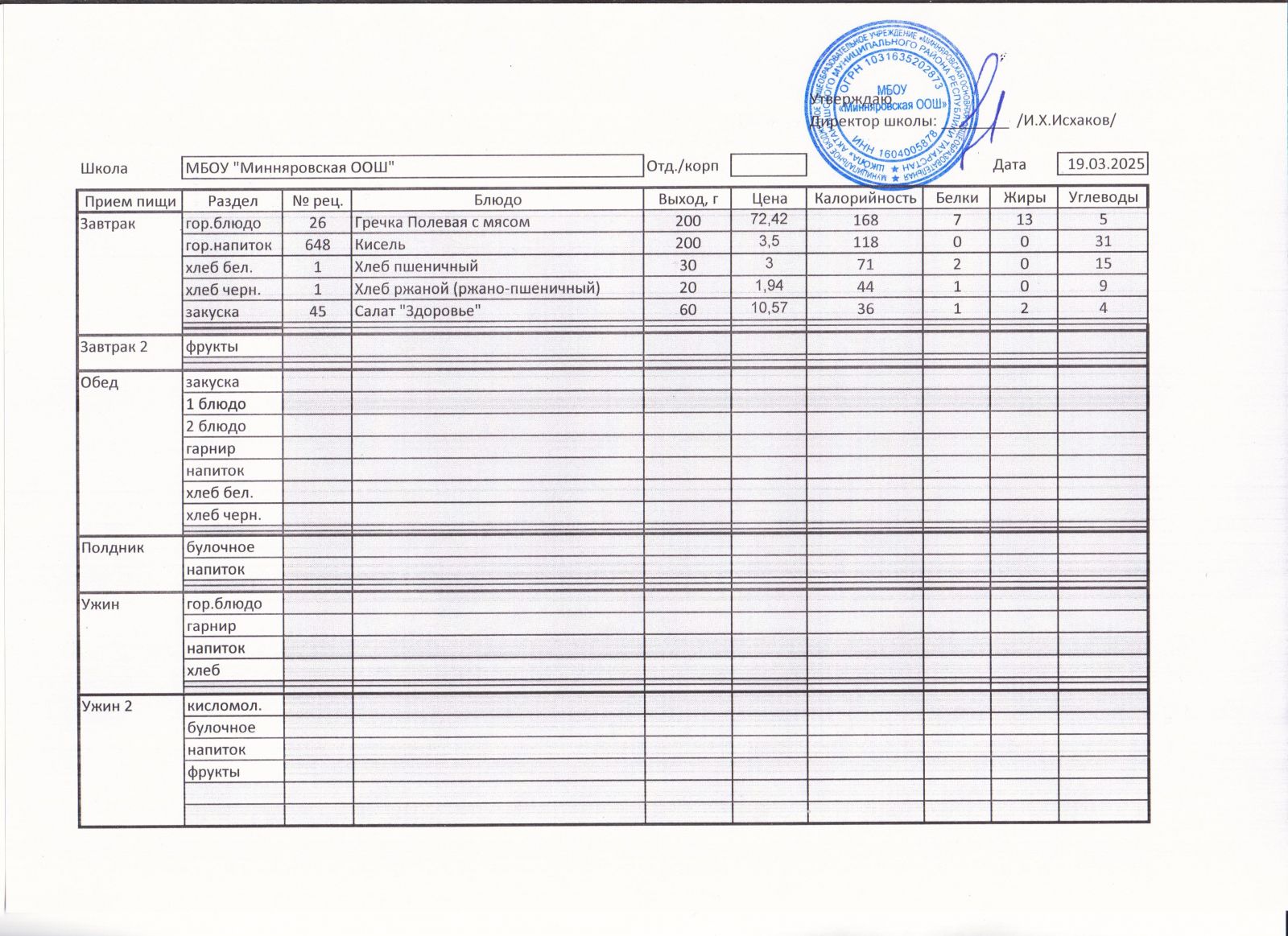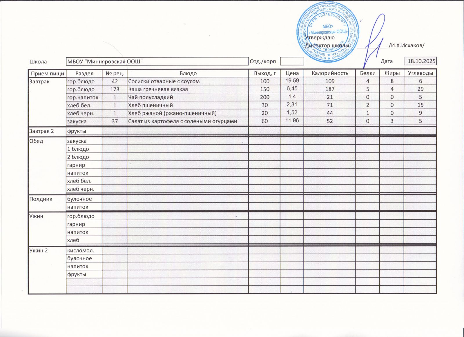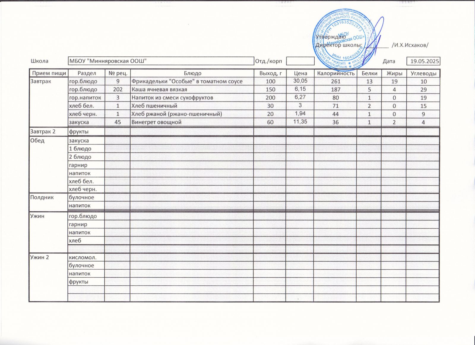 Меню МБОУ "Минняровская ООШ" на 19 ноября 2020 года