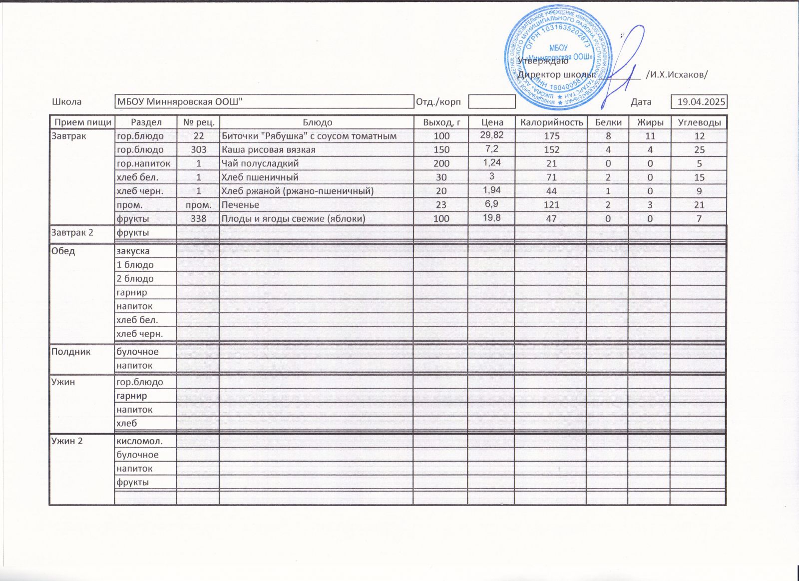 Меню МБОУ "Минняровская ООШ" на 19.04, на 20.04, на 21.04, на 22.04, на 23.04, на 24.04.2021 г.