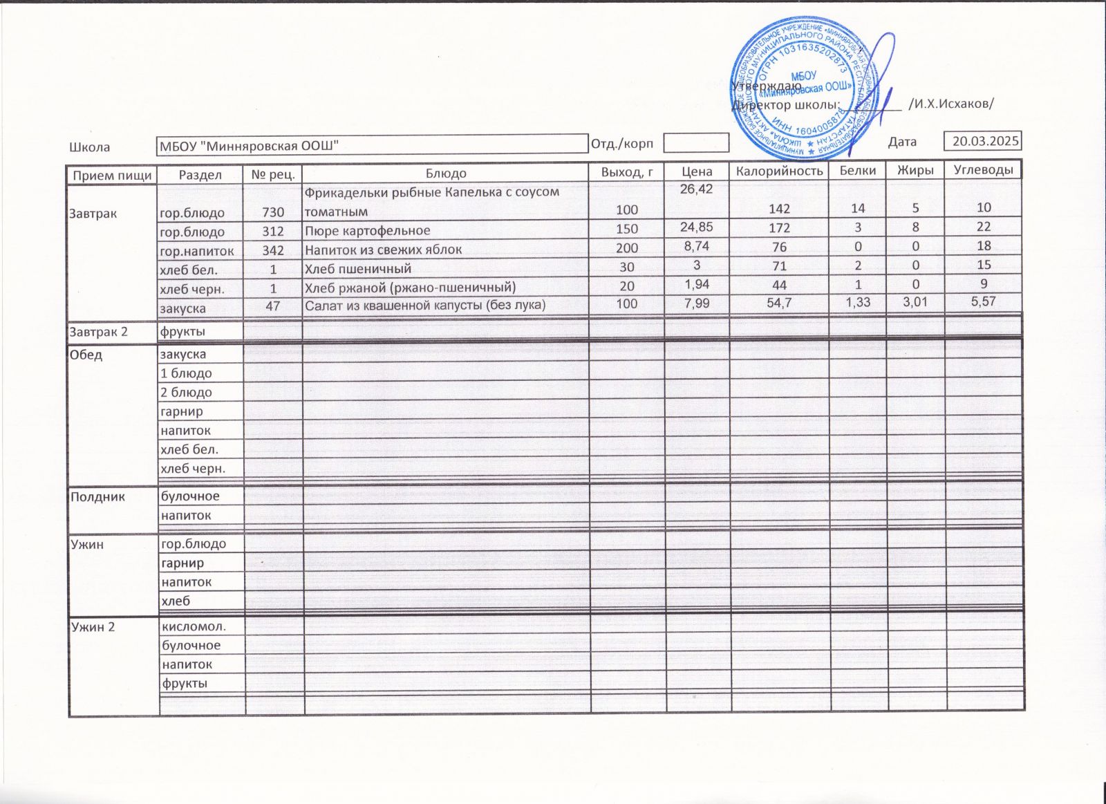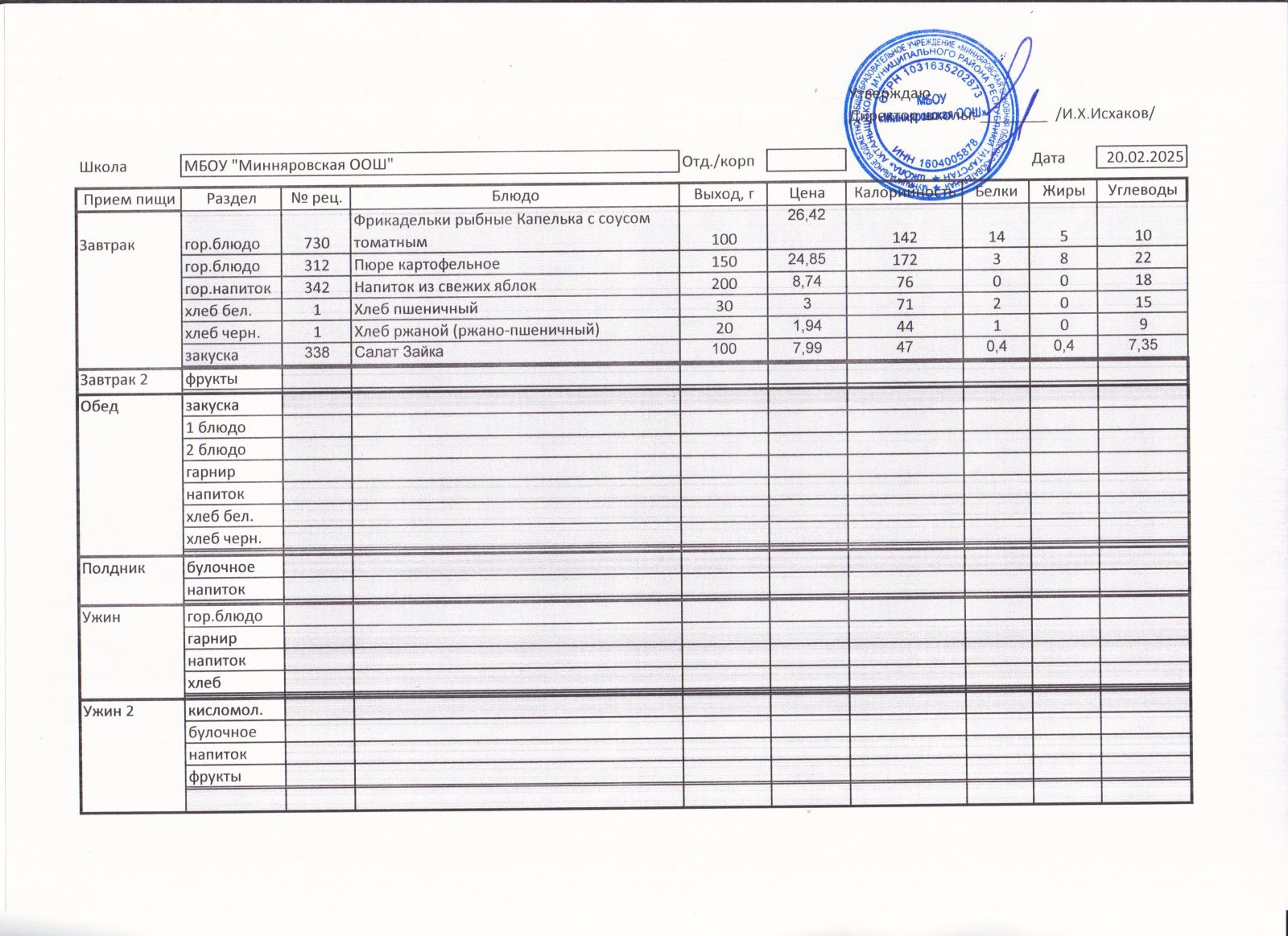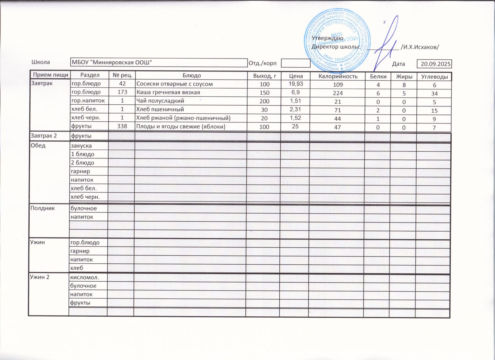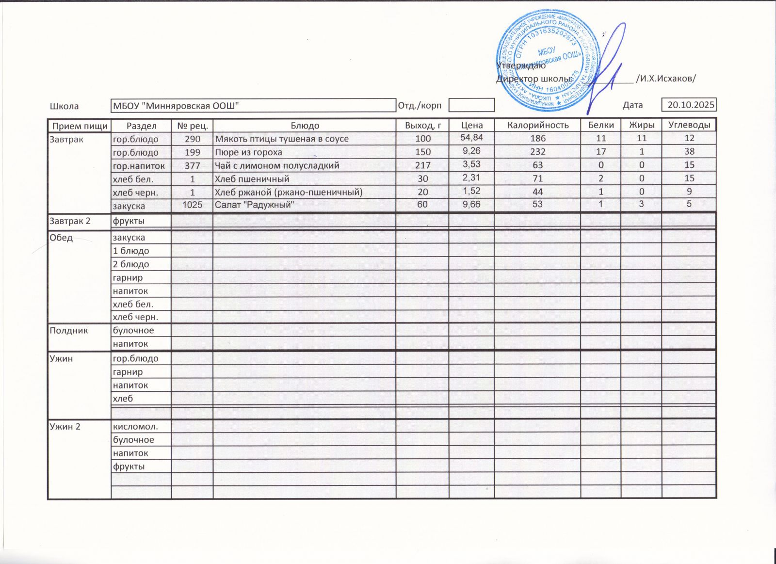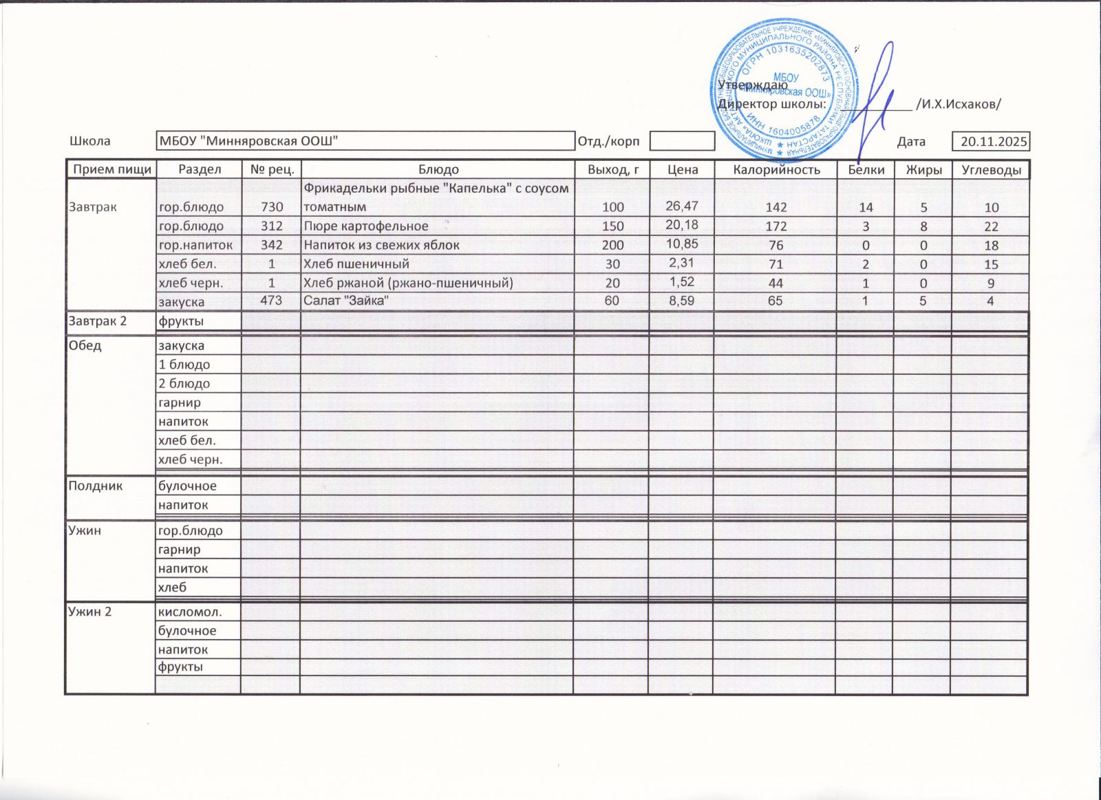 Меню МБОУ Минняровская ООШ на 20.11.2020