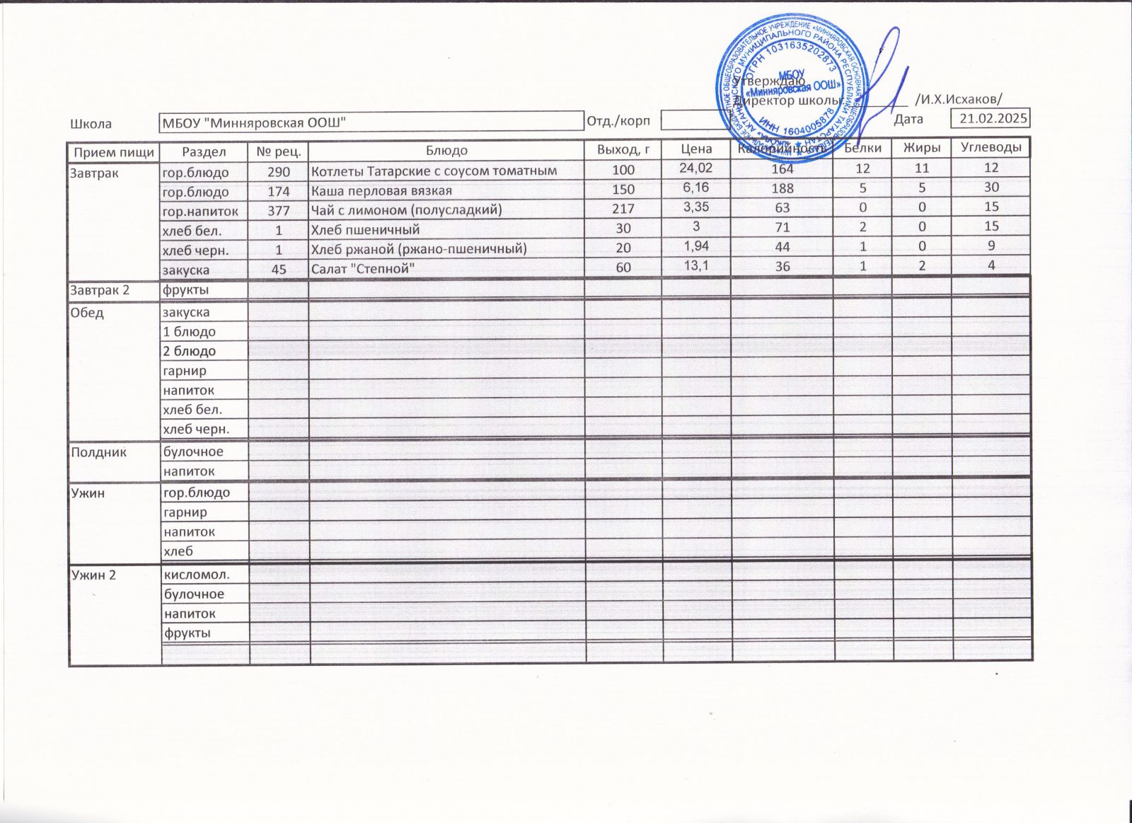Меню МБОУ "Минняровская ООШ" на 01.02.2021, на 02.02.2021, на 03.02.2021, на 04.02.2021, на 05.02.2021, на 06.02.2021.